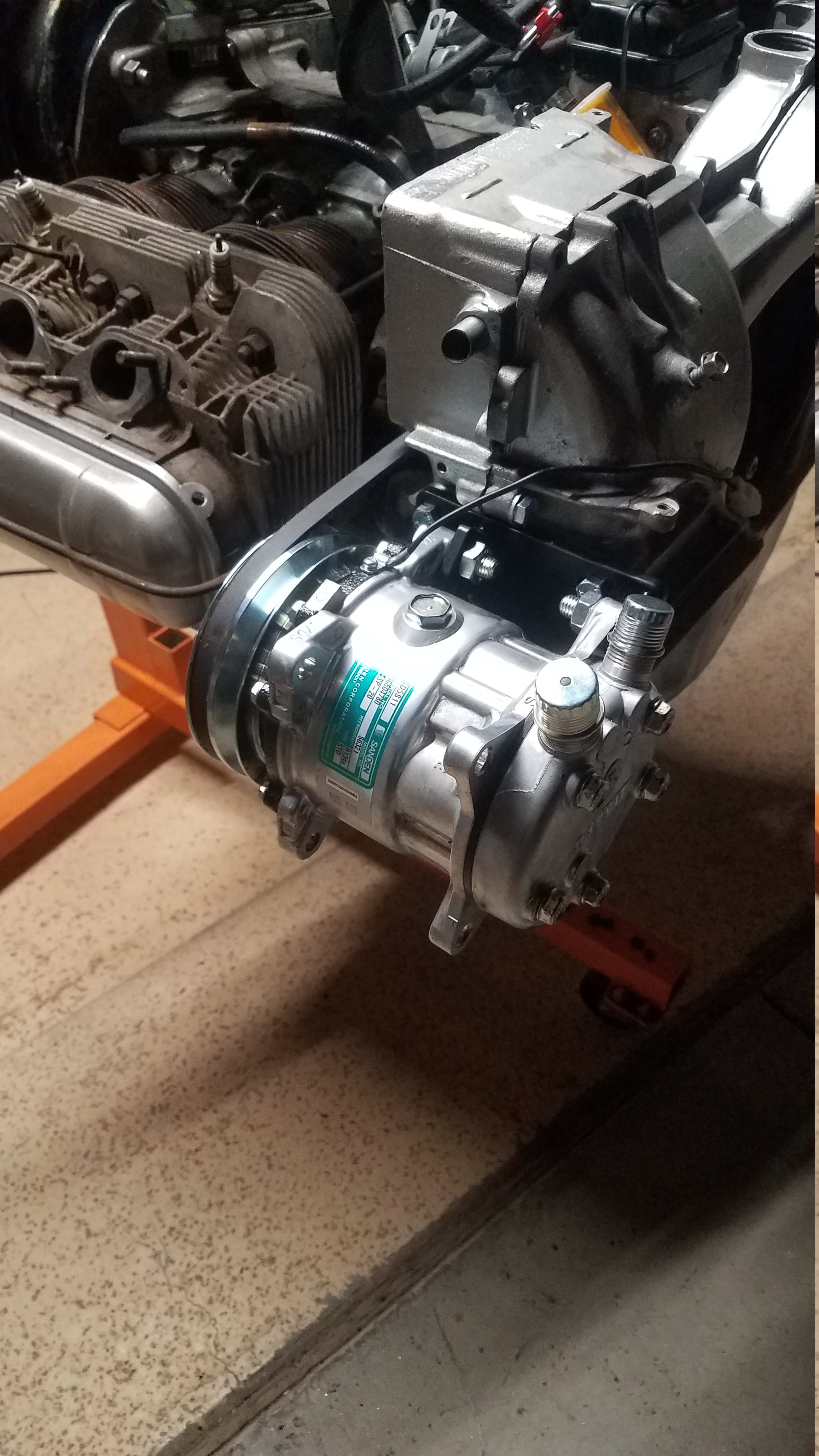 There are places in Arizona where the summers are pretty nice. Those are the places up in the higher elevations of Arizona. I don't live in one of those places. I live in Phoenix. As you may have heard, Phoenix is hot in the summertime. Driving a car without AC in Phoenix in the summer time is pretty miserable. Car dealers don't sell cars without AC in Arizona. Satan keeps a winter home here because the summer are too hot. OTOH, it's a dry heat and I never have to shovel it. The NARP is a 71 914 that started life with a 1.7 liter engine. I had a 1.8 liter engine sitting in the garage for my other 914 project and when the 1.7 got too aggressive in marking it's territory I decided to swap in the 1.8. I also swapped in an transmission I got from Oscar at the same time. The 1.8 came with a boat anchor of a York AC compressor connected with a side mount on the passenger side of the engine. I removed that almost as soon as I got it home. I picked up the 1.8 a couple years ago from Patrick Motorsports for a GREAT deal and James said it came out of a running car so I thought it was good to go... I had never looked it over as well as I could have. I've known James for several years and trusted him and I still do. I never asked or looked at the engine to see about oil leaks. It really could have had a hole in the case and it still would have been a good deal so I don't want this to sound like a complaint about James or PMS because it is not. I cleaned a LOT of crud off the 1.8, replaced the front crank seal, swapped the engine tins from the 1.7, and installed it and James was correct, it runs great. It was still dripping some oil and I wanted to add an AC system so it is back out of the car less than 500 miles since it first went in. I've tracked the oil leaks to a couple push rod tubes so all the push rod tubes are getting new seals. Another reason I dropped the engine was to replace the shift input shaft seal on the transmission. It was the only seal I didn't replace last time I had it out of the car and of course, it just had to leak. (IMG:style_emoticons/default/headbang.gif) (IMG:style_emoticons/default/headbang.gif) (IMG:style_emoticons/default/headbang.gif) It didn't help that I put Swepco oil in the trans before I installed it the first time. The good(Evil) Dr. set me straight so it is now running good old 90 weight Dino oil. The transmission now has all new seals and is ready to go back in the car. The engine will have the new push rod tube seals and oil cooler seals to go with the new front crank seal I put in before the first install. So there is the background on the engine and trans. Now it's time for the AC system. This is a total experiment based on other AC threads here and on the bird and based on systems and guess-timats from other cars. I made some of my guess-timats based on parts and sizes from my 1990 944 S2 Cab. The cabin of the 94 is a bit smaller than the 944 cab so parts that can cool the 944 should be about the right size to cool the cabin of the 914. As I said, the 1.8 liter engine came to me with an OLD York compressor. I did not want to use that massive HP hog. There was a decent pulley mounted behind the fan but it is also a heavy piece of steel. I bought an original dealer installed style AC system a few years ago from some one either here or on the bird board(I don't remember which and it doesn't really matter at this point). I bought it mainly for the under-dash evaporator and the controls. The NARP never had AC so it is not hacked up. It has 99 problems but ragged holes in the body and front trunk for AC aren't any of them. The engine tin on the passenger side of the 1.8 is hacked up and bent up pretty bad. I should have taken pictures before I started cleaning it up. I am going to finish cleaning it up and paint it. I don't want to hack up the good tin that was on the 1.7. I'll save that and hack it up for my next project. (IMG:style_emoticons/default/sawzall-smiley.gif) With the advances in modern compressors, condensers, and fans I decided to try an installation with the condenser mounted to the underside of a GT style engine lid. In addition to the original style under dash evaporator, I am using a Sanden sd5h11 6333 compressor. It is the modern equivalent of the SD507 and is designed to use R-134a. I will be mounting it to the passenger side of the engine with amount plate I got from Gilmore Enterprises out of Las Vegas. Their website (gilmore-enterprises.net) doesn't list parts for the 914 or any individual parts but Ed, the owner is super easy to deal with. I called him up, told him what I was looking for, and it was on the truck heading out to me later that day. I picked a universal fit parallel flow 11" X 21" condenser and 2 high flow, low profile 10" fans and a drier with a trinary switch. |