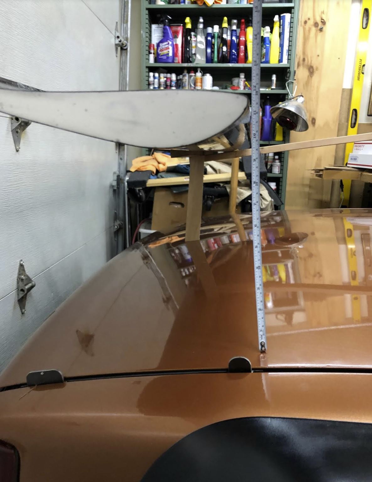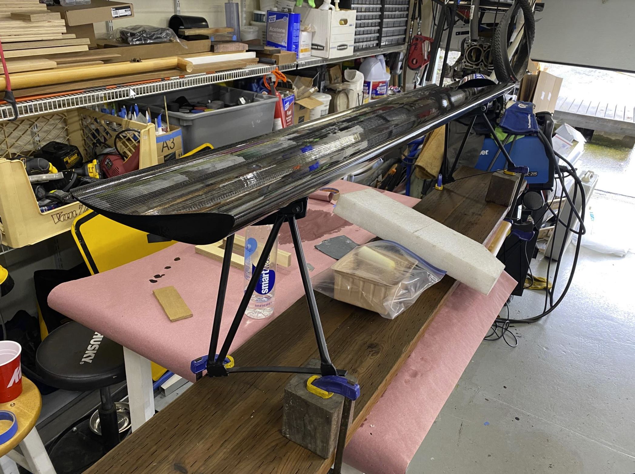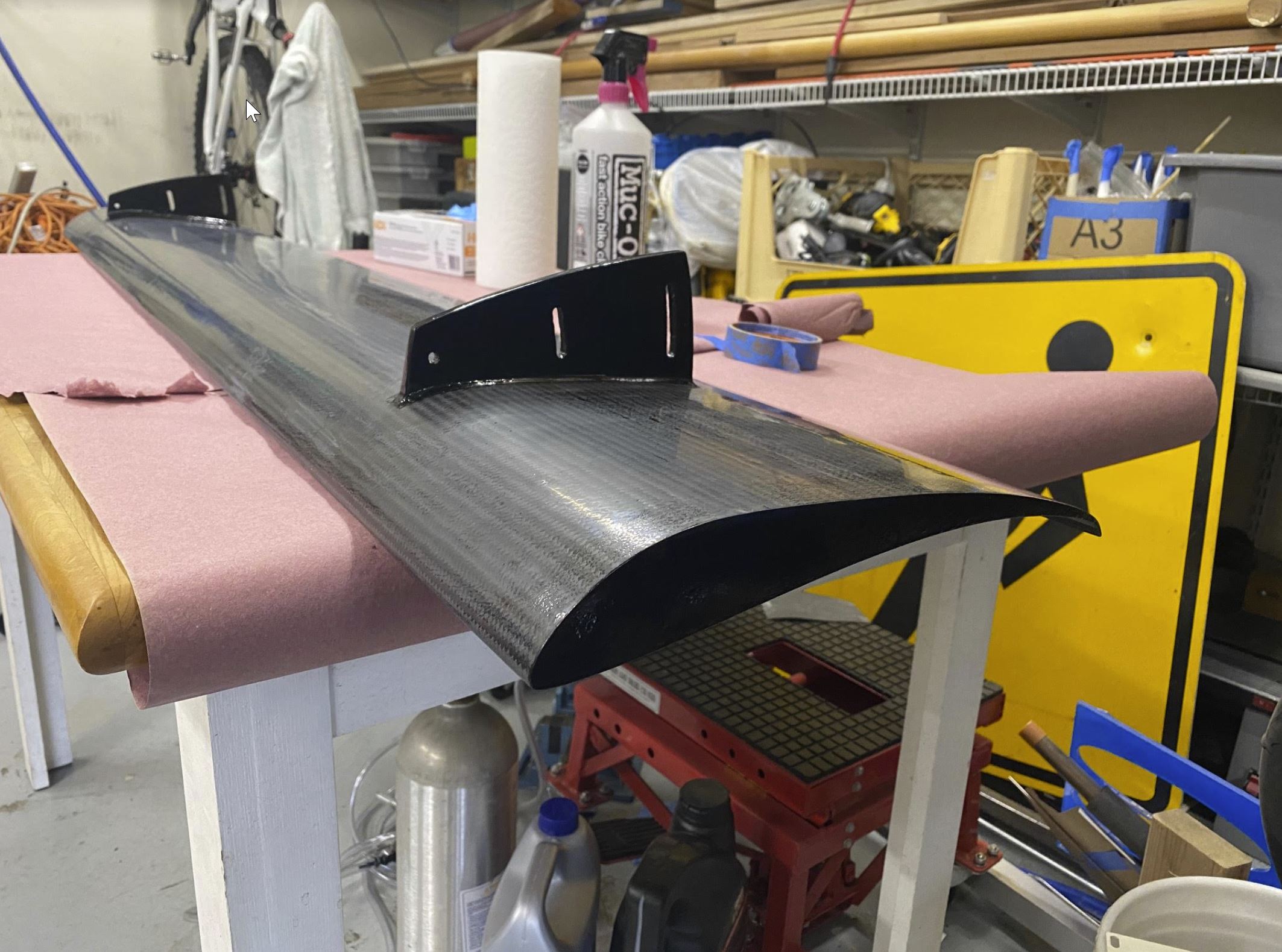 I decided to follow and approximation of the A pillar to B pillar roofline, and also taper it inward toward the top to follow the progression of the A to B pillar, and also make the tube triangulation tilt forward like the sail panel. Angle of attack is adjustable from roughly 0-15 degrees, but I use it in the 6-10 region I think, I built the foil with a 1/4 gurney flap mostly to toughen the trailing edge. Its a S1223 RTL foil. Lots of data out there on this one. I had a wing mount design that avoided fasteners through the rear deck, but it seemed to dicey in the end, especially in any sort of collision. In the end I just added the fasteners and added peace of mind and further fab complication. And most importantly. It conforms to standard bar height, and passed functional testing. |