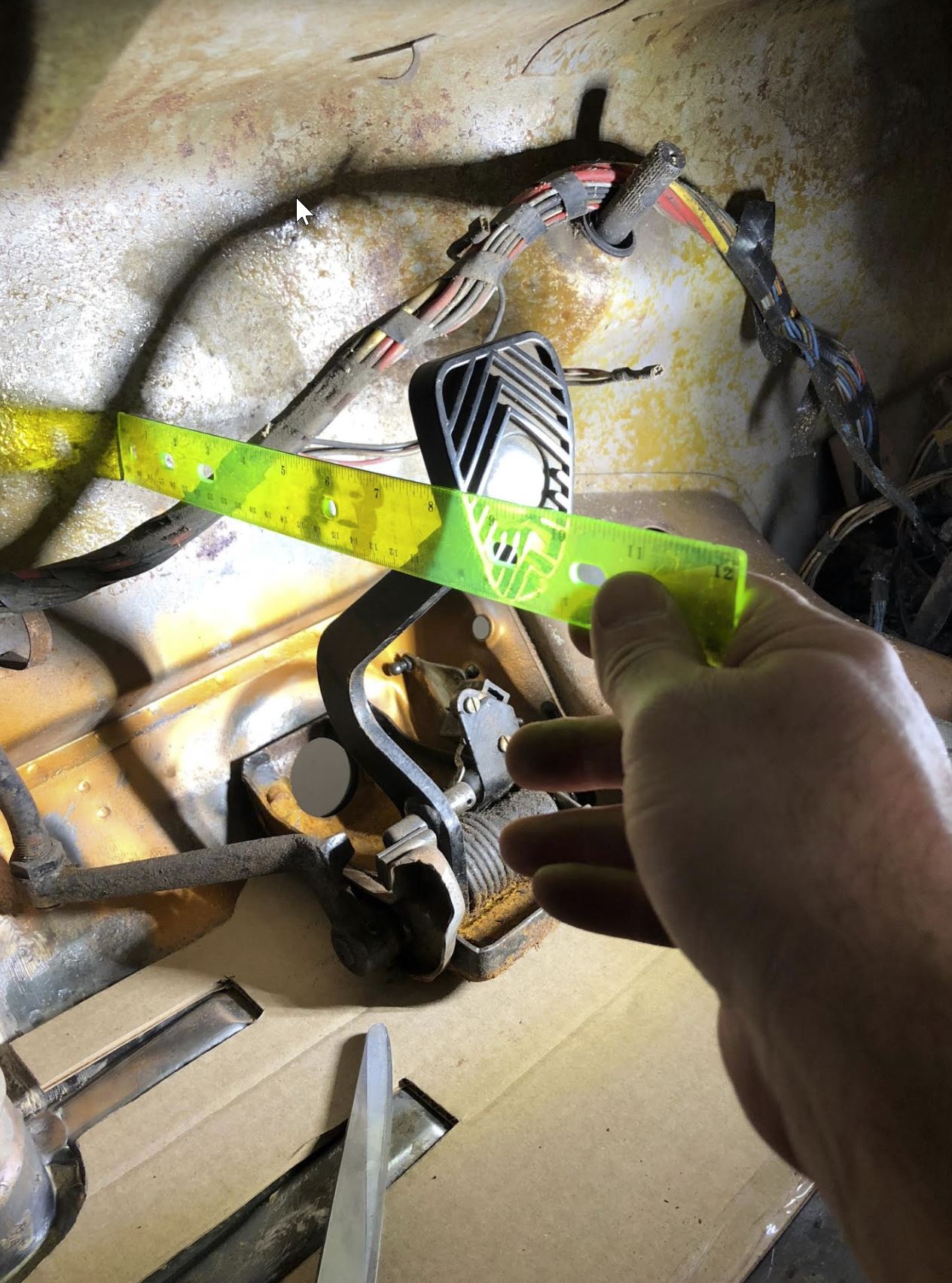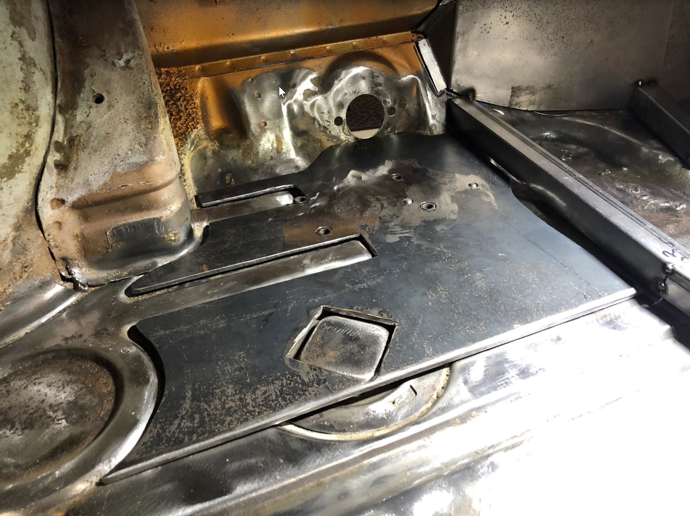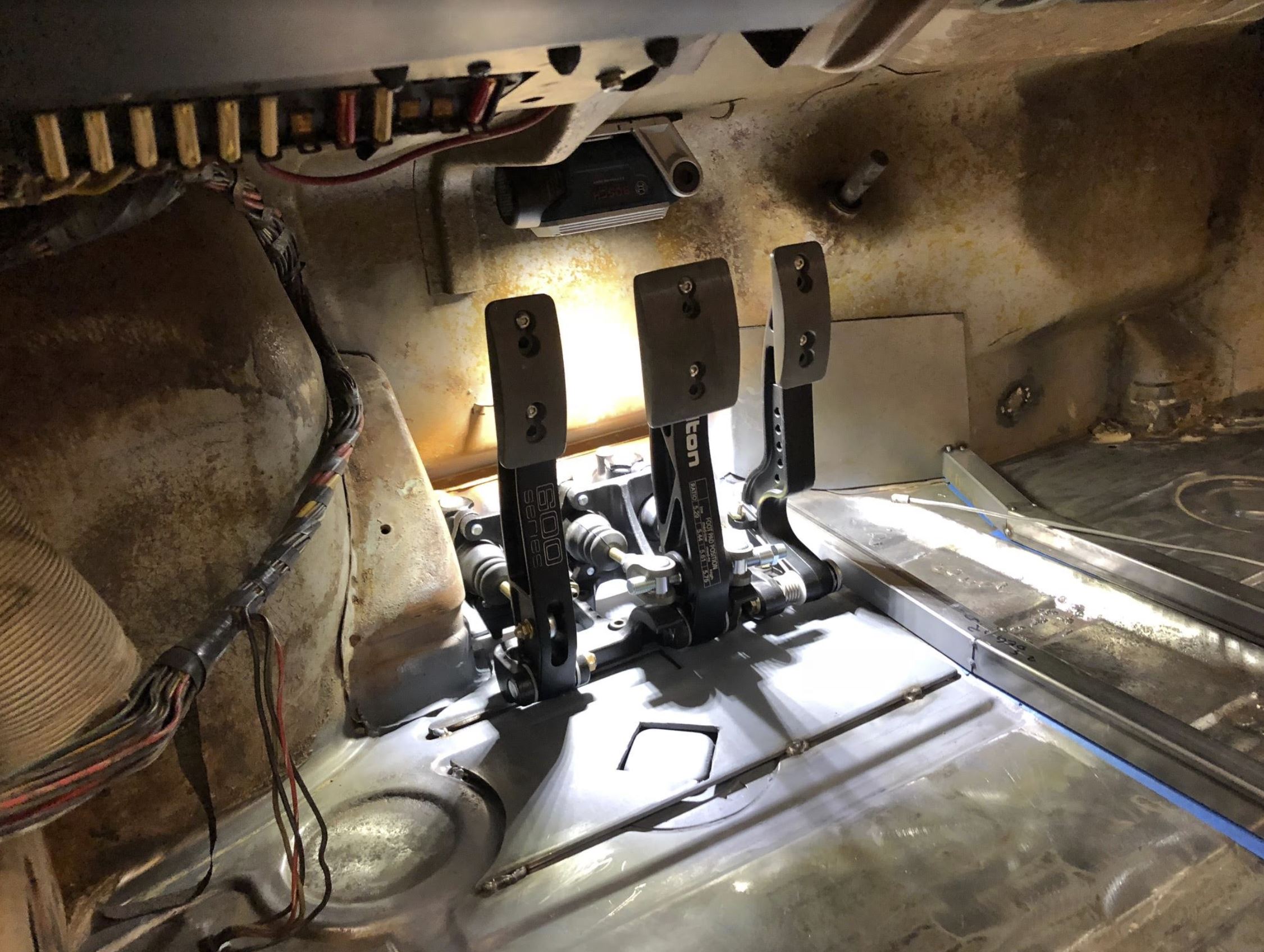 Amazing Suby build! Incredible fab skills... :worship: Any additional details & pics you can share on radiator plumbing & pump. Any details on the Tilton pedal cluster install would be appreciated too. I'm early in the process of my Suby conversion. Looking to use a WRX engine & trans as well. After deciding to go with a race pedal cluster for tuning and adjustability. After making that decision, I decided the tilton 600 floor mount was the best option for me. I expected to need to repair the floor due to rust, but it ended being only light surface rust. Given that, I needed a way to mount the pedals in the right location, and get the braking pedal force into the floor. Goal was to be able to get the pedals just about as close to the firewall as the OEM config, but also be able to adjust out to dial the position in for the driver. You can see the corrugated floor reinforcement template I made from the initial cotton paper one to represent the thickness of the plate. I drilled holes and welded in flange nuts from the back for the pedals to fasten to, coated it in weld thru primer, and stitched it to the floor I made a bolt on close out plate with a gasket and bulkhead tee fitting to go through the existing master cylinder hole to get the brake lines to the front brakes. I made a bracket to fit the short triple reservoir system in order to mount it roughly where the OEM reservoir was. I have the cylinders sized to be stiff but very comfortable to drive on the street. Want to be able to control a 1st gear launch with a slightly stiffer than oem single disc clutch, and also made the brakes stiff enough to prevent me locking them up too easily. It has a balance bar for front/rear bias adjustment and an adjustable proportioning valve. I dialed all of this on the track with the current tires, and then biased it a bit for the street. Currently it looks like this with all the lines and sensors attached. |