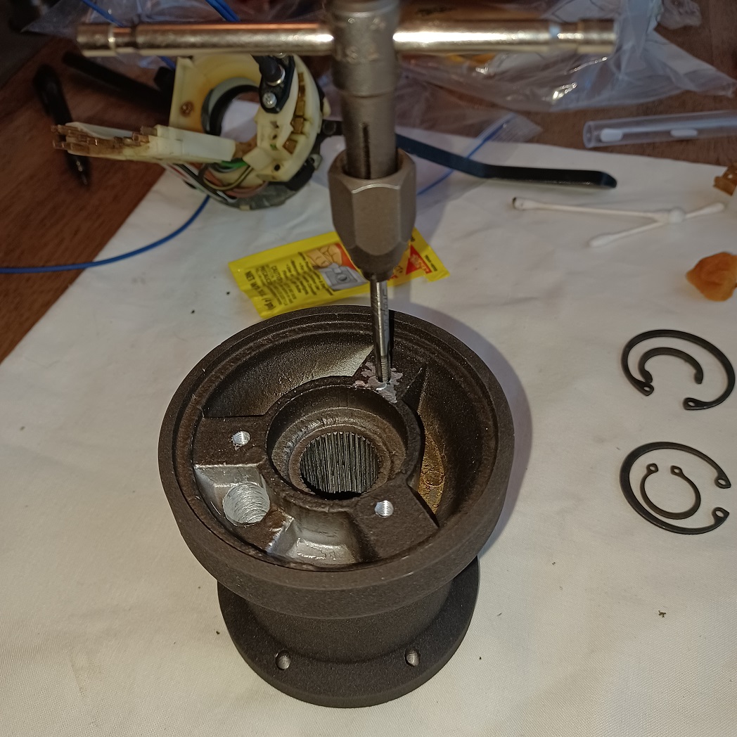 Momo sends the unit with all predrilled holes, and sheet metal screws to screw on the horn ring. I had planned on using the mounting screws from the original steering wheel to mount the ring, but they are like a 3.5 mm screw and I could not locate the proper tap, so I re-drilled the original holes and tapped them to fit a 4 mm x .7 x 10 mm screw. I had to drill out the holes in the horn ring a tiny bit but everything lined up great |