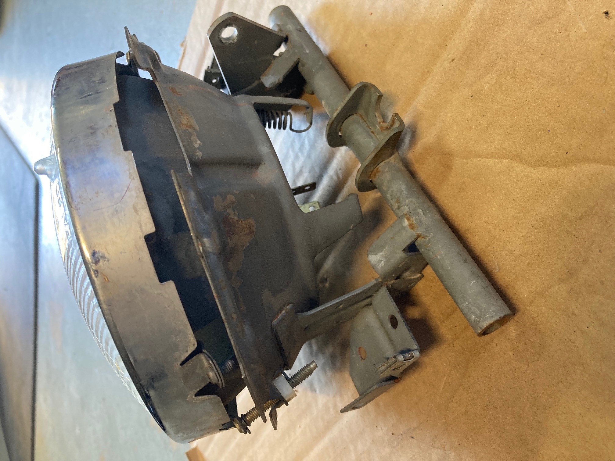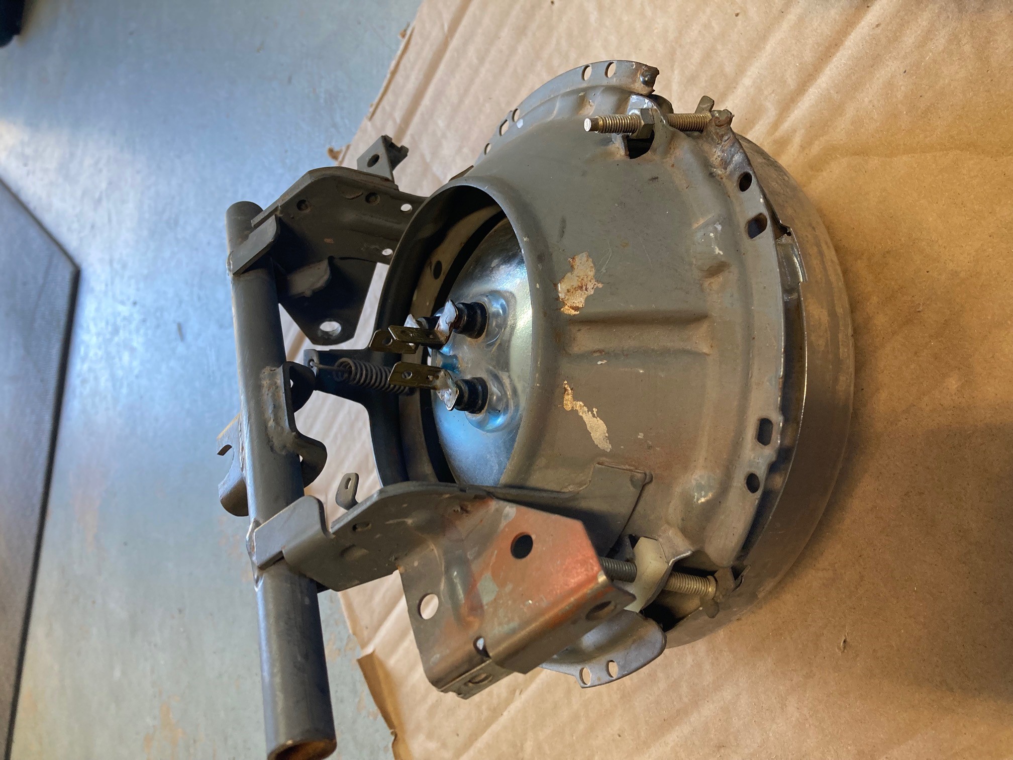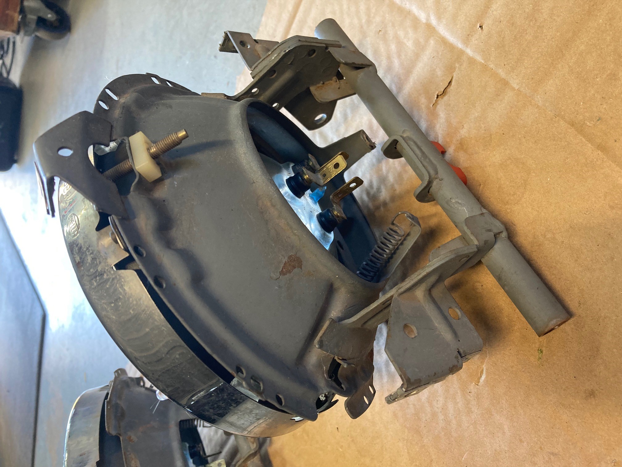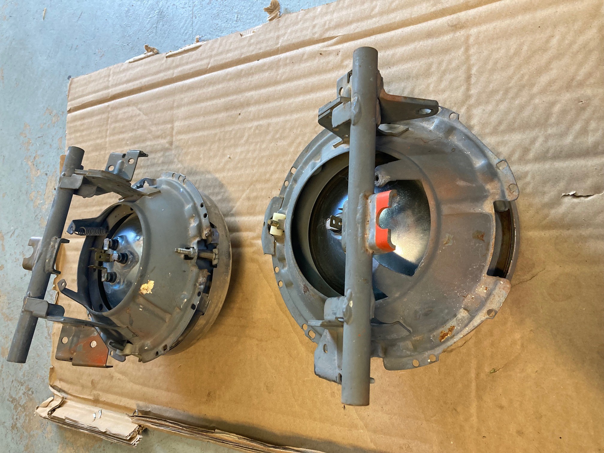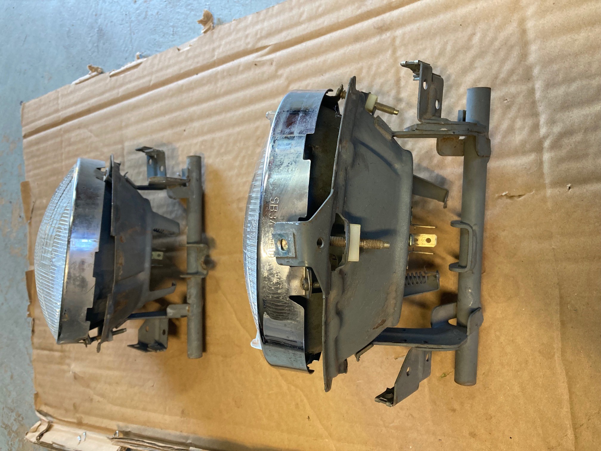 a pair of headlight housings... with wagner sealed beams (chrome ring) and surrounds.