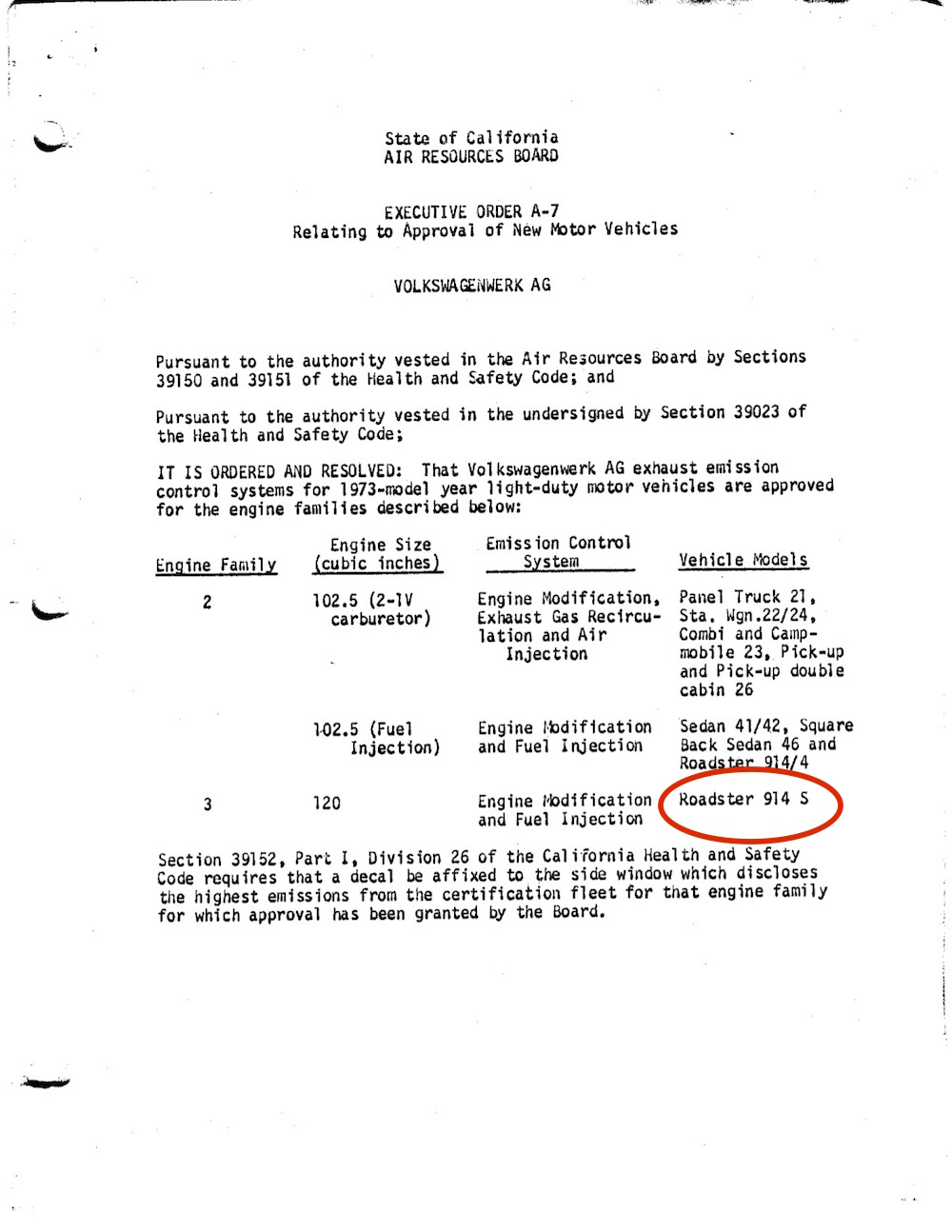 https://ww2.arb.ca.gov/new-vehicle-and-engi...duty-trucks-and nothing in there for EC-b. however CARB does note the records may be incomplete. looking around at other manufacturers documents and even some of VWs the business with rescinding the order is unusual. they also do it for the documents covering the 914 2.0 for model year 74. i can't quite understand what the document LJet914 posted means as they seem to rescind the original order (jan 74) and then replace it with the same thing (march 74)? Also the orders are quite late in date, comparable orders for other VWs and other makes of cars, including porsche for the 911 are dated sept or oct of the calendar year the model year starts. so there is some funny stuff going on where the EC-a is gettng approval in jan74 instead of sept/oct 73 where you expect it to be dated. ---- i had a good look either side in 73 and 75. found this. slightly off topic but worth posting. @JeffBowlsby probably interested. looks like Volkswagen of America was calling the 73 914 2.0 a 914S at the stage they wre submitting for CARB approval in Oct. 1972. ![]() |