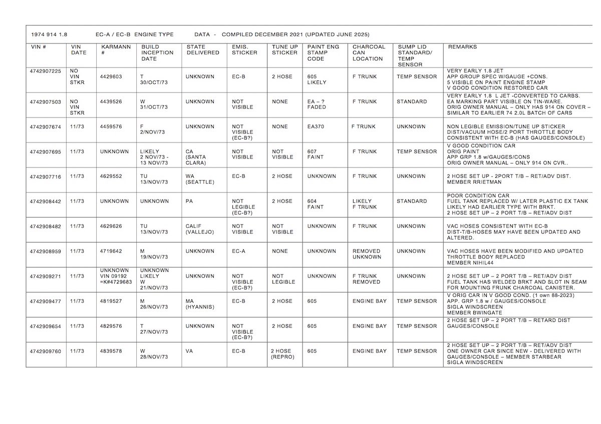 the material was prompted by mr b ( @JeffBowlsby ) who observed that for the 74 MY there was an EC-A and an EC-B engine. mr b's thought was that the EC-A was a 49 states car and and EC-B was a californian car for emissions. mr b's view was rational and reasoned. 73 EA engines are 49 states. 73 EB engines are california. 75 engines are documented in factory literature as EC-a (49 states) and EC-b (california). the logic should follow? BUT as per the mystery of the 914, the truth about 74 1.8s turns out stranger than fiction (or common sense?). the material is not necessary to running a 1.8 or having fun with a 14. (IMG:style_emoticons/default/smile.gif) its for historical purposes and as information to 74 1.8 owners to assist with restoration if they want it. |