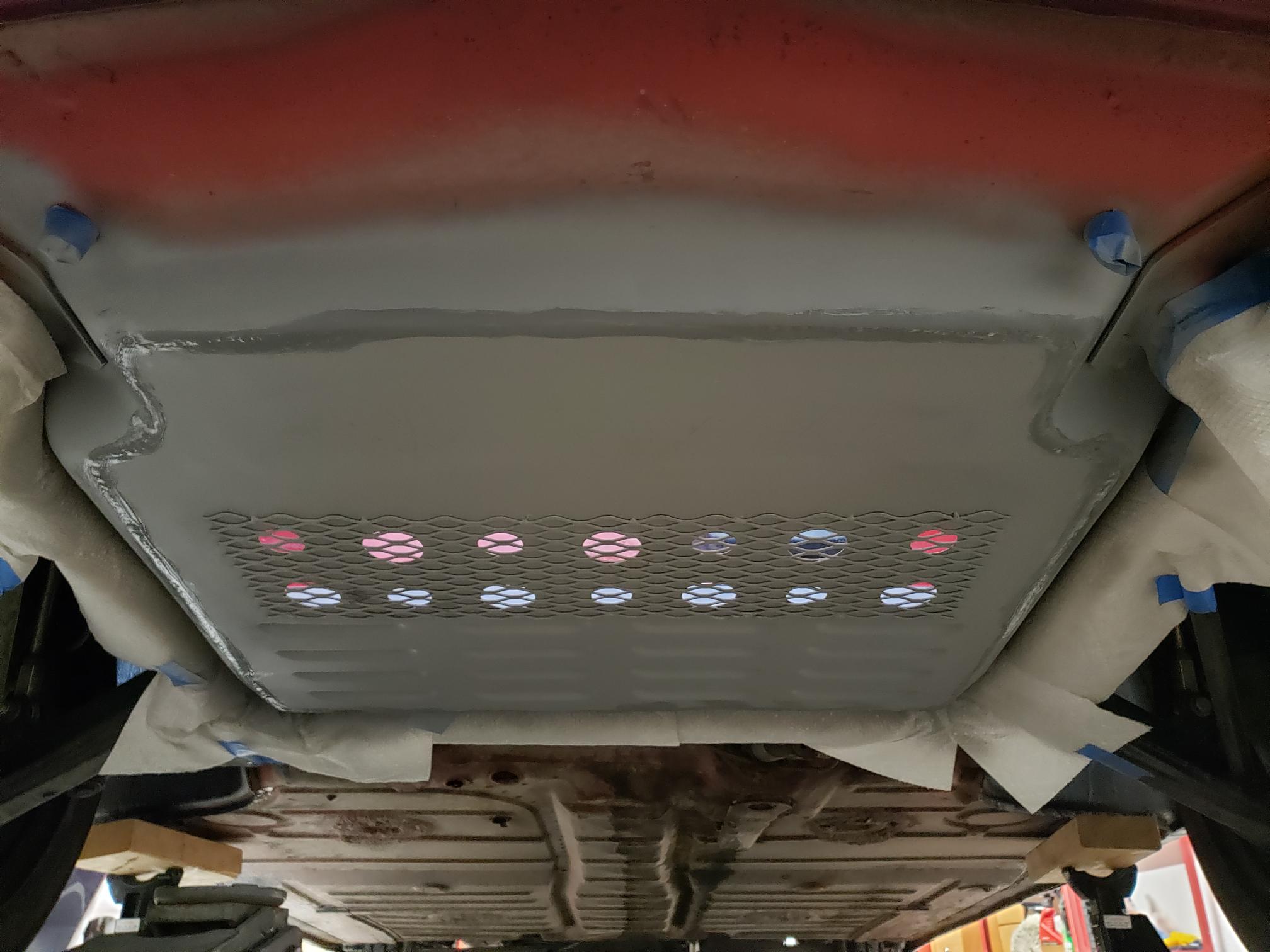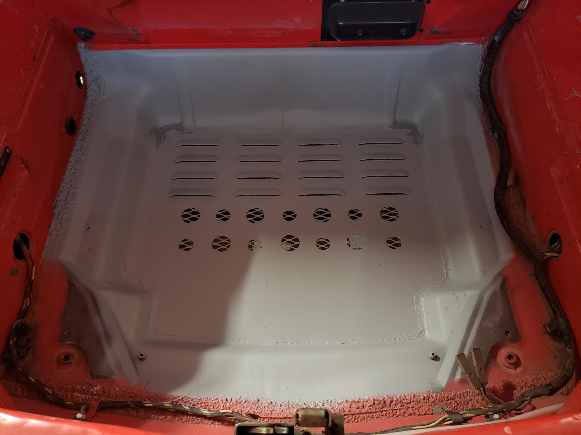 Work continues on the frunk-mounted cooling system. I got the vented floor pan welded in place, seam-sealed and primed. It felt great to repair that floor pan, even though its a different approach than I may have envisioned originally.