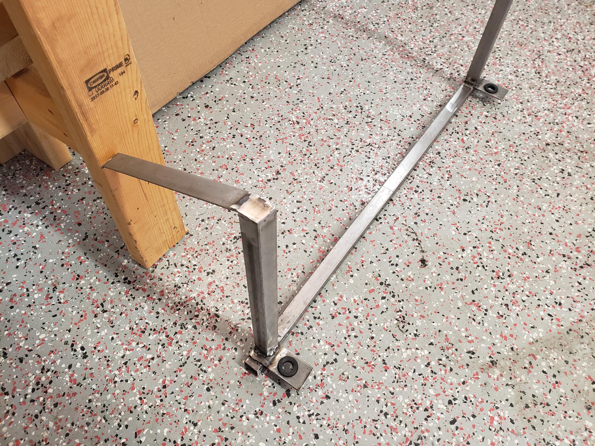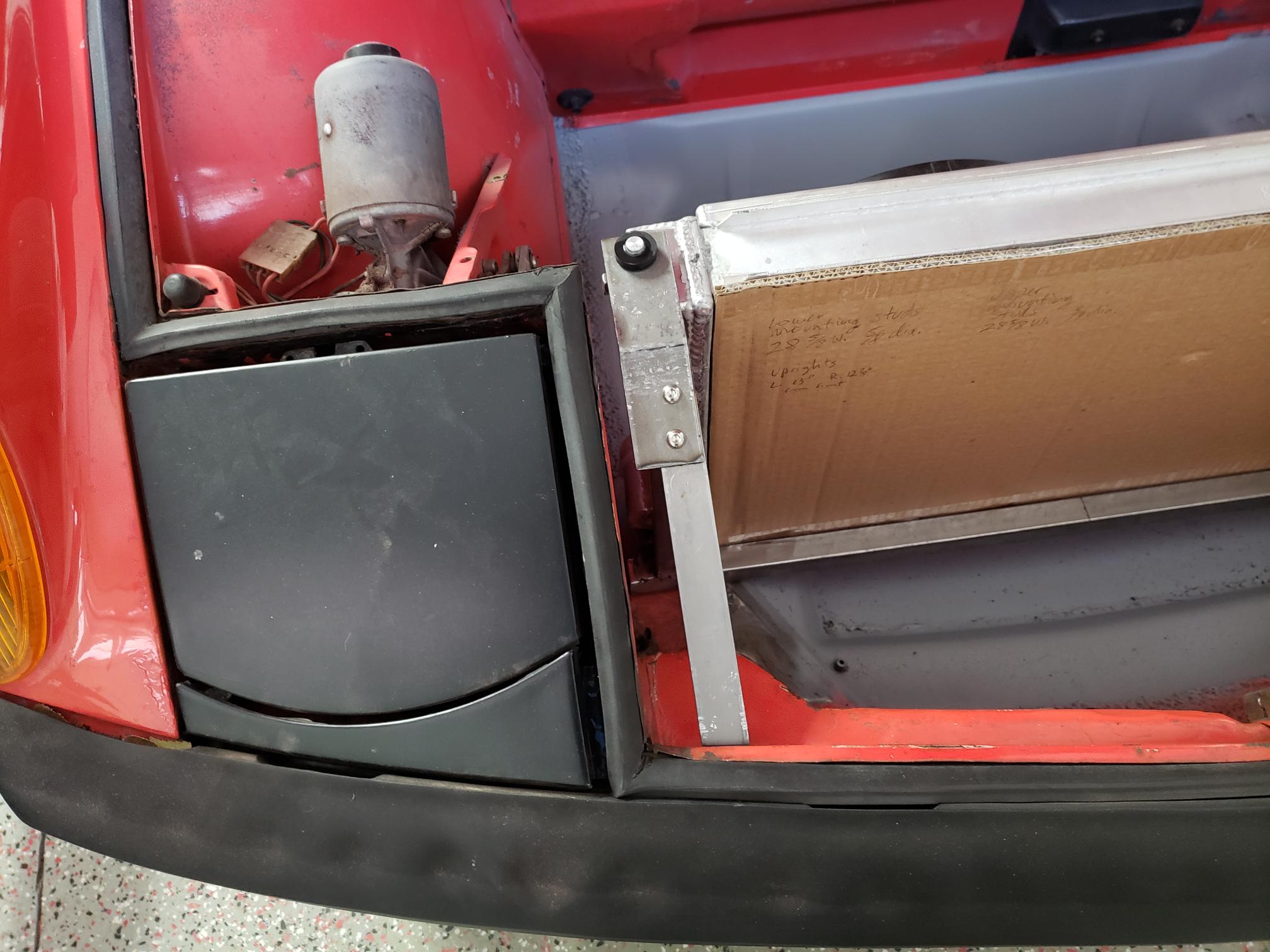 To mount the radiator frame to the floor, I made two tabs from 1/8" bar steel, drilled and bolted them to the bottom frame rail, then welded them to trunk floor. This way, the entire frame can be unbolted from the car relatively easily. I bent and welded 1" bar steel supports to connect the upper frame to the front of the car. I lifted the weatherstripping and drilled holes for low-profile bolts to connect the supports. The final piece to be able to mount the radiator was to create tabs to be bolted to the upper frame supports that are also grommeted to the top rad mounting pins. By removing the bolts (nuts are welded underneath), I can easily remove the radiator. I'm actually going to re-do the tab design because I'm not happy with how it looks, but for now, the radiator is in position the way I planned. Next step with be to start on the shroud design and execution, so we'll see how that goes. Happy New Year! |