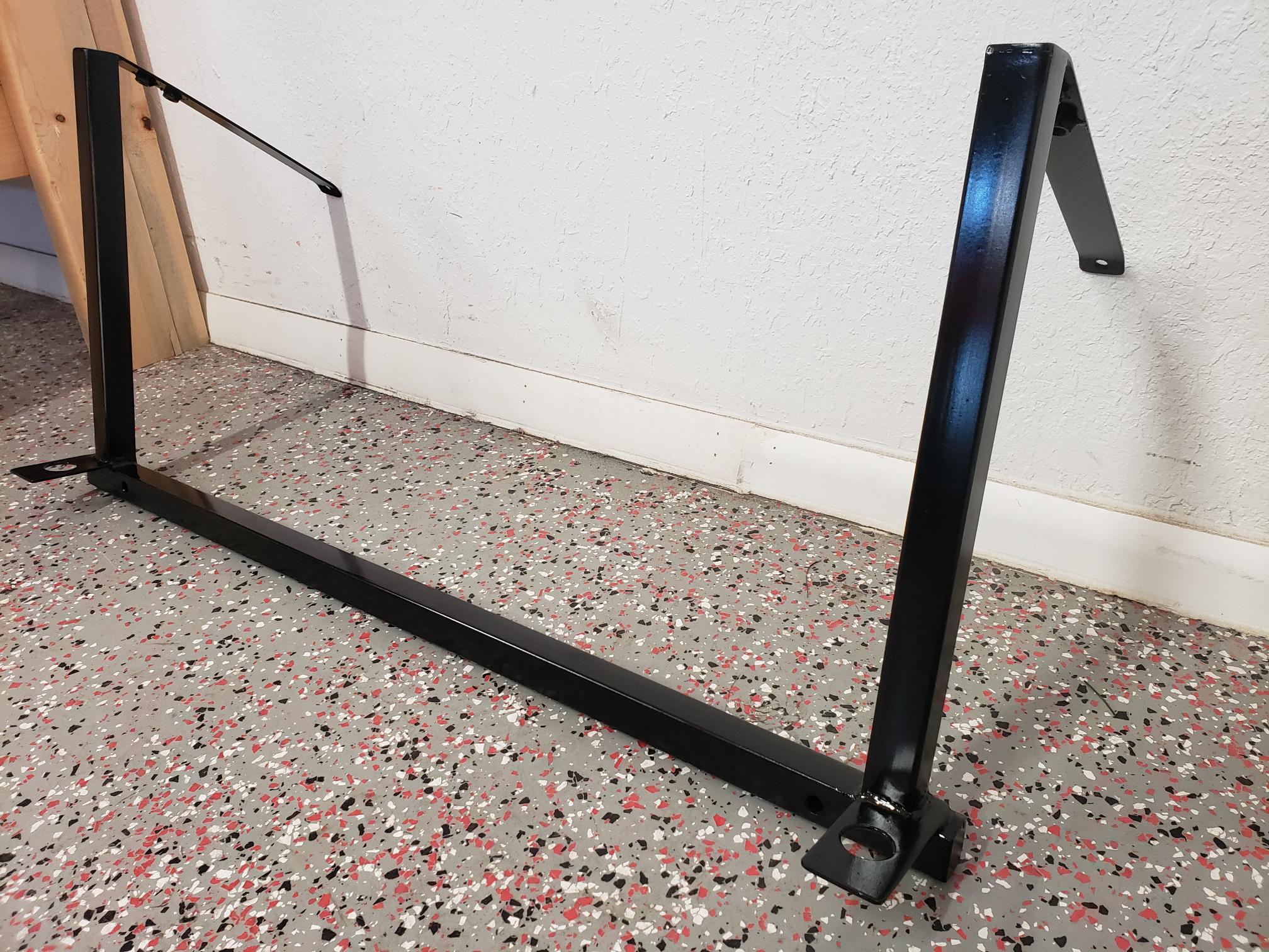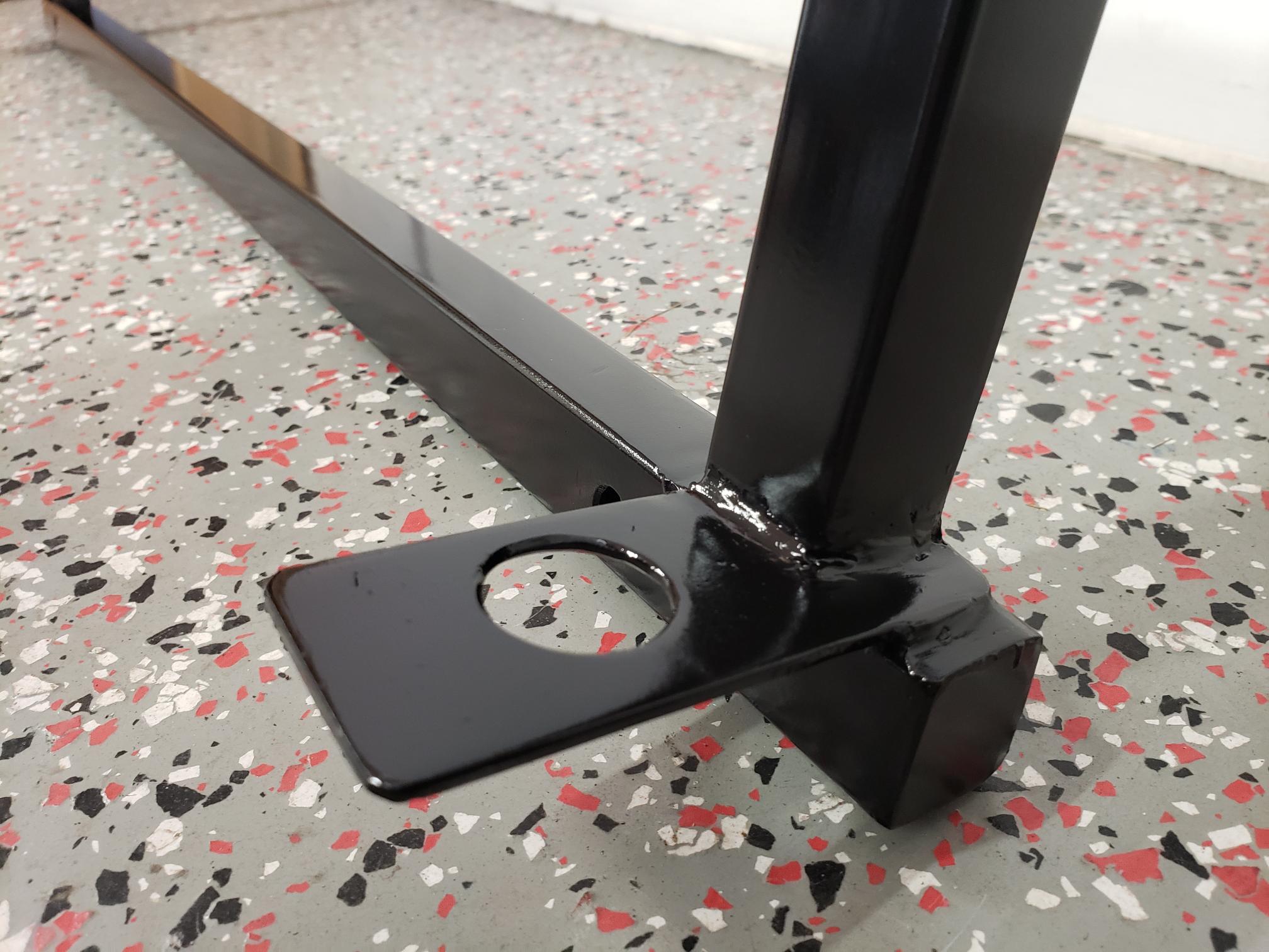 Made a little more progress on the radiator frame over the weekend. I welded on nuts to the frame arms to mount the tabs that will be grommeted to the radiator. I trimmed the lower frame crossmember, then cut tabs from 1" bar steel to cap off the ends. Did some more grinding on the welds, then finished them off with some JB Weld. Primed, then painted with gloss black VHT Chassis paint. Powdercoating would have been nice, but not in the budget at the moment.