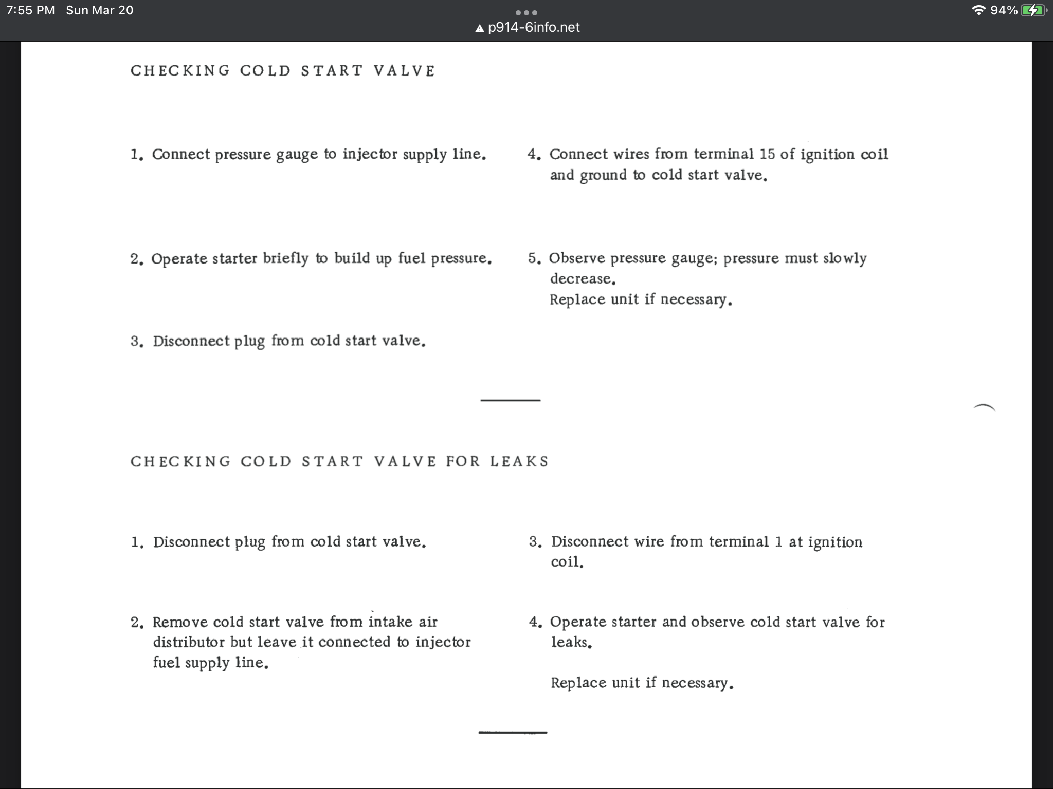 I’m requesting help on solving the issue of excessive cranking on start-up. Not once since I bought the car has it ever fired right up like others described for their cars. I had hoped that this issue was related to the other issues I’ve solved with the help of my friends here, but no luck. The behavior remains unchanged. To start this off, I rigged a little hidden fuel pressure gauge to the car so that you all can see for yourself. For the context of this attempt, the engine is cold at around 60F, I did not touch the throttle and the ignition was in the on position prior to cranking. https://youtu.be/DTTQ1zQJkJo https://www.youtube.com/watch?v=DTTQ1zQJkJo Edit: moving on to a new phase at post #152 http://www.914world.com/bbs2/index.php?s=&...t&p=2995793 Please advise and thanks in advance. Van |