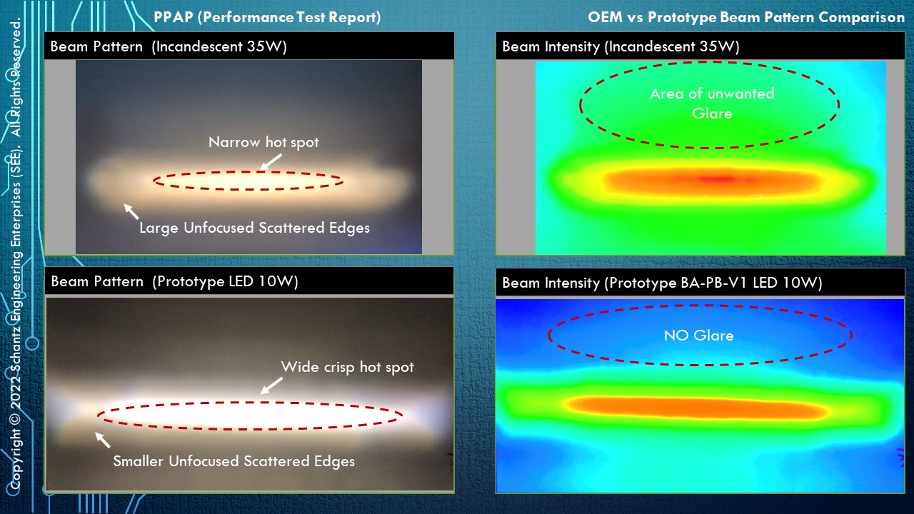 Before moving on I want to offer a heartfelt thank you to everyone who ever purchased anything from me, that money allowed me to complete my education and finish my degree which I would not have been able to do without your assistance. Short Version: So for the past few years I’ve been working to develop my own line of LED bulbs and I need your help. The 1st bulb prototype is a direct Plug & Play bulb for the BA20S bulb in our 70-74 (Round) fog light housings. I can really use your input so please check out the post and complete the 10 question SurveyMonkey survey to help with my new venture. LED Bulb Survey Long Version: So after years of hiding and being on a hiatus, I’m finally back on the 914World site. In the past you may have known me as the guy in Riverside CA who used to build engines and sell refurbished parts. Fortunately, I “grew up” and moved onto a “Real” job after obtaining my Engineering degree, but unfortunately, I no longer had any time for those 914 activities due to the never-ending work hours with a Japanese automotive company and a new family. Since graduating I’ve spent the past 10 years working for a global OEM automotive manufacturer and running an engineering division within the company, and I’ve had the privilege to deal with some great suppliers, designers, and engineers. During that time I’ve witnessed how well, and sometimes how poorly the components for vehicles are designed, manufactured, and utilized. What I discovered is that when done properly the result is a very well performing component, but when done incorrectly the result is honestly quite disconcerting. So on to the point. About 5 years ago LED conversions and LED lamp additions started becoming more and more commonplace and I myself became more and more interested in LEDs after buying a set of bulbs online. I was even further amazed to find how poorly lighting elements were being designed and built and how poorly they would often perform. In essence the lighting elements were being designed to meet “some” spec, and the aftermarket just marketed them to the masses without any understanding of how the component would actually be used; and with regard to quality, don’t even get me started on quality levels, that doesn’t even exist for many of these manufactures! You would be amazed how many times I’ve had heated discussions with manufactures about Six Sigma, Cpk requirements, ISO practices, 5Why, 8D, or Kaizen activities just to find that most couldn’t answer the questions, and what was even scarier is that many didn’t even have any sort of quality management system in place. I knew I didn’t know enough, I mean who of us does, but I did know that many of these LEDs were absolute CRAP! So I spent the next few years educating myself on how the human eye functioned and how it was affected and responded to various light wavelengths and intensities with varying ambient lighting, along with how LED element design has matured over the years. What I discovered is that contrary to popular belief, designing light emitting elements is not just as simple as sticking a LED in a housing, there are many other aspects which come into play which make a “good” vs “bad” light, and that’s what distinguishes a good from a bad design. In 2020 during the COVID pandemic, and after running out of things to watch on Netflix & Hulu, I decided to start my own side business, I also happened to luck out and find a LED company that was selling off all of their assets so I drove across the country and picked up their equipment so I could setup my lab. I then built my lab from scratch and began to develop my 1st LED bulb based on the design and “Kaizen” principles I obtained at an OEM level. During that time I also being purchasing popular LEDs that you find on Amazon and eBay and discovered that almost all of the manufactures flat out lie about their bulb output and build quality, which quite frankly is just wrong. Bulbs that I personally tested with my lab equipment were often on the order of 40-50% of the advertised output with beam patterns that were often horrible to say the least. Now to the 914 stuff! After 10 months of development, I’m finally down to 2 final prototype designs for my first bulb which is a BA20S Plug & Play bulb to replace the poorly performing incandescent bulbs in our 70-74 (Round) Bosch fog/driving lamp housings. I wanted to keep the fog light looking period correct so separate LED elements were out of the question, but I also wanted to have a good beam pattern. I also believe in the KISS (Keep It Simple Stupid) method of design, so the bulb is a very simple but yet robust design in order to produce a great beam pattern, high output, white light, and long life while still maintaining the period correct look of the car. What I’d like to ask from the 914World community (if you haven’t already fallen asleep from this long dull post) is to please complete the 10 question SurveyMonkey survey I’ve attached above, and give me some feedback on this thread with regard to your thoughts on what you’ve experienced with aftermarket LED lighting for any of your cars (new or old). I truly believe it takes a village to raise a child so any input you have will be greatly appreciated, good or bad. To give some insight on what’s been going on I’ll be adding some additional photos to show some of the details of what’s been in development over the past few years. This is just the 1st design that I’m working on and I already have designs for 4 other bulbs in process, the goal for our new company is to release one new P/N per quarter (4 per year) and supply a full line of interior and exterior lighting for both on and off-road, new and classic vehicles. Also, in case you’re wondering about the logo, I chose KnightBeam as our name to represent our core values, KNIGHT which represents chivalrous values such as protecting others while protecting yourself, promoting