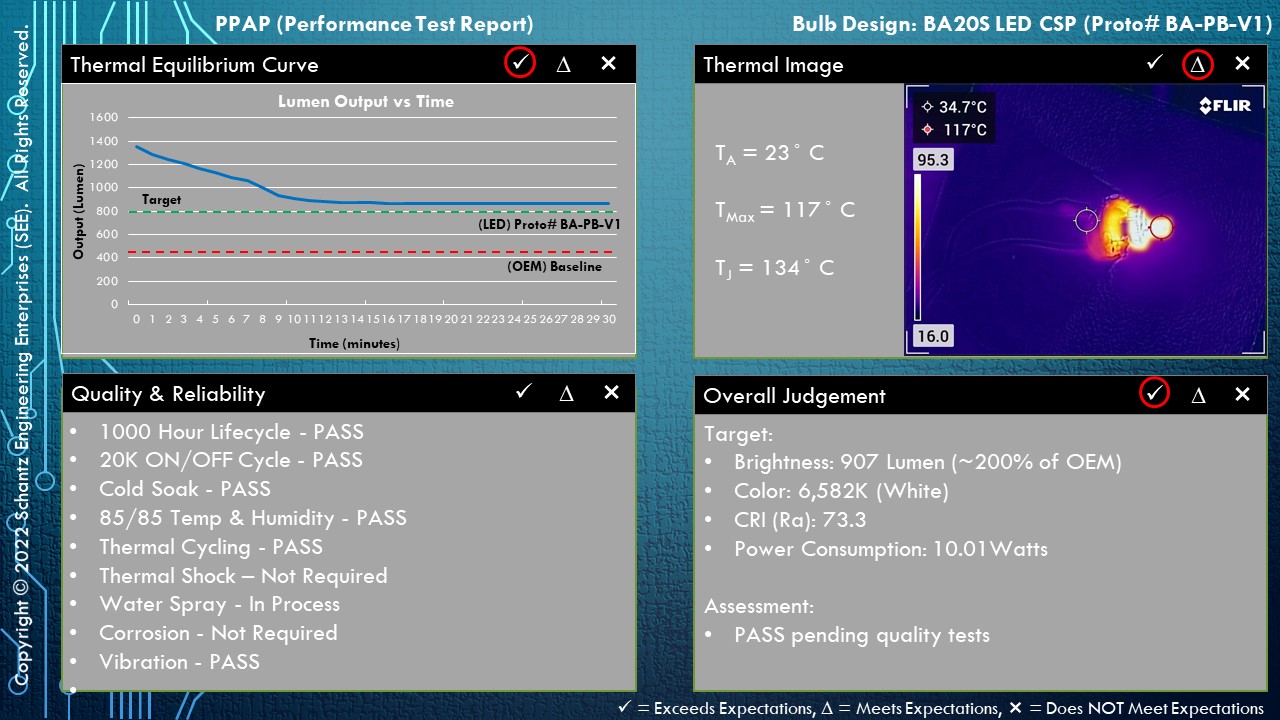 To make sure the advertised output was accurate I let the bulb thermally stabilize, and subjected the prototype to a myriad of tests to ensure it won't fail while in service. Most manufactures I found advertise the max output which is just unobtainable, and I can't speak to their quality as I have no idea what type of QA tests they perform to ensure quality levels are met. |