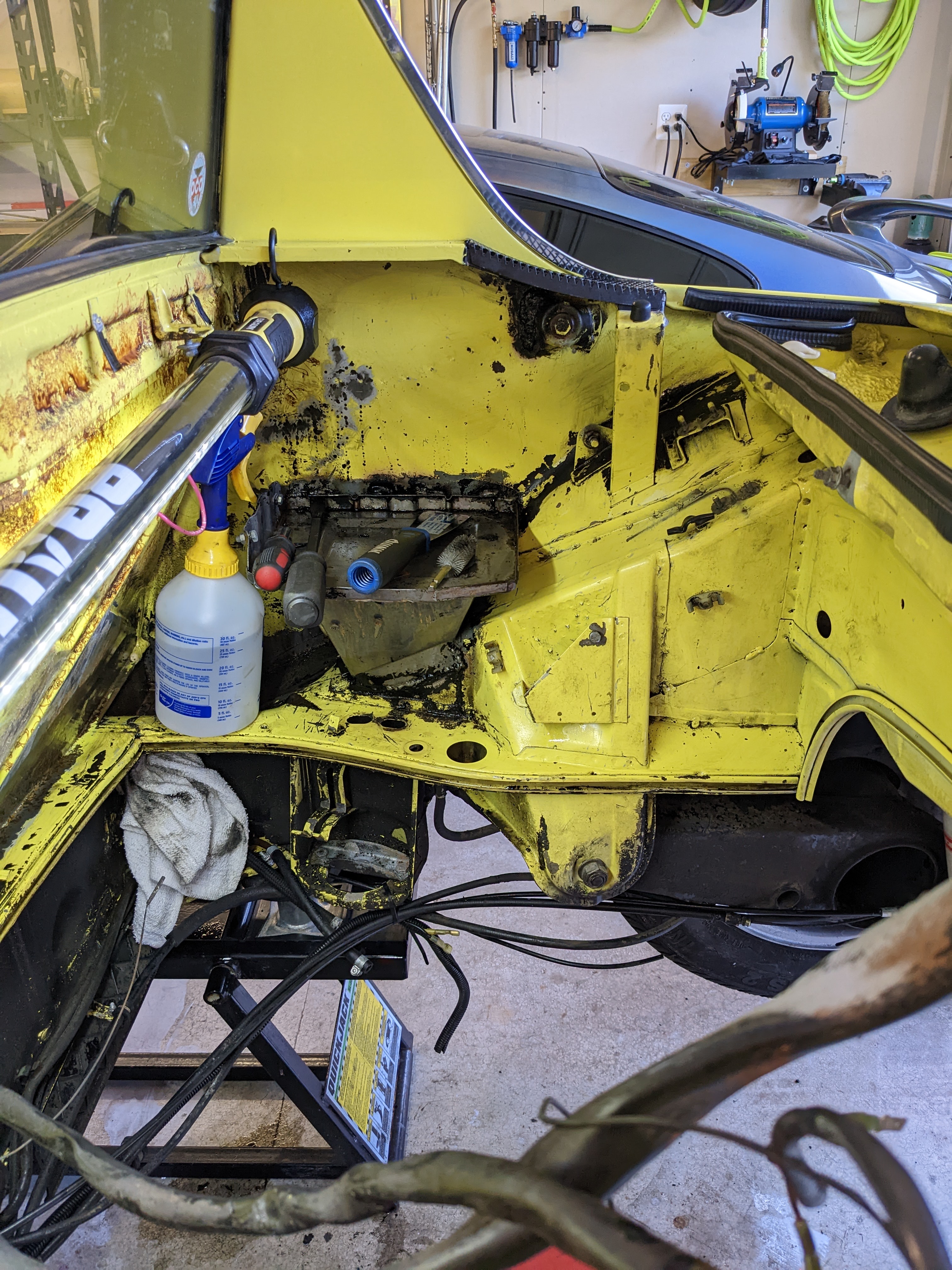 Pretty pleased with how much I removed today and the condition of the metal and paint underneath. I learned that the battery tray was replaced some time ago… and not properly primed or painted lol. Attached thumbnail(s) |