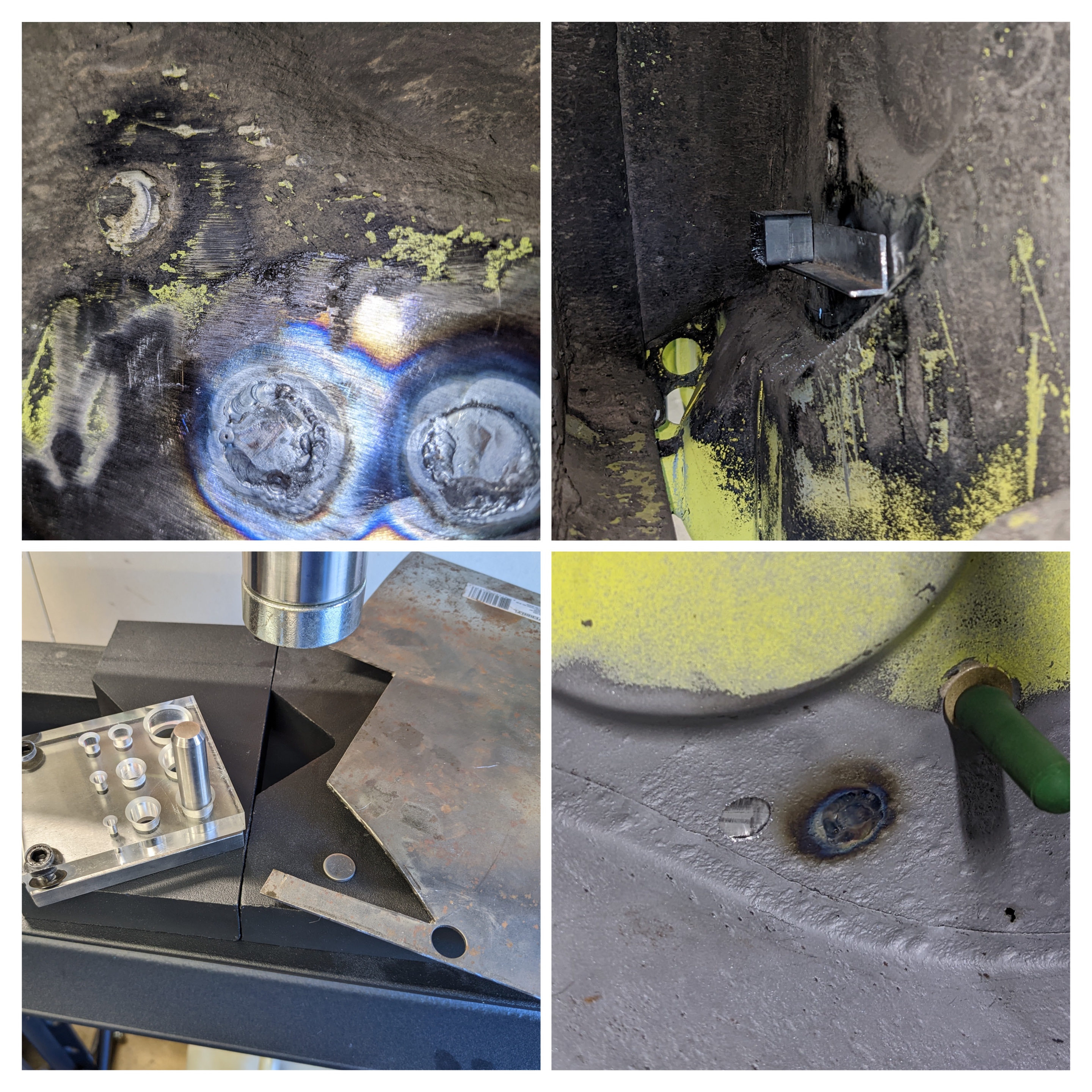After the firewall, a lightbulb came on that resulted in a trip to harbor freight for a punch and die set. I adopted the technique of making plugs. I reamed out the larger holes and welded in perfectly fit plugs. I used some aluminum angle and some magnets to keep them from falling through. You have to watch out with how close the magnet is to the welding arc or the magnetic field will destabilize your arc. 6” of aluminum gave enough separation though. And, it also did a pretty good job of holding onto some backing gas. I really like this method if you want to save a panel.