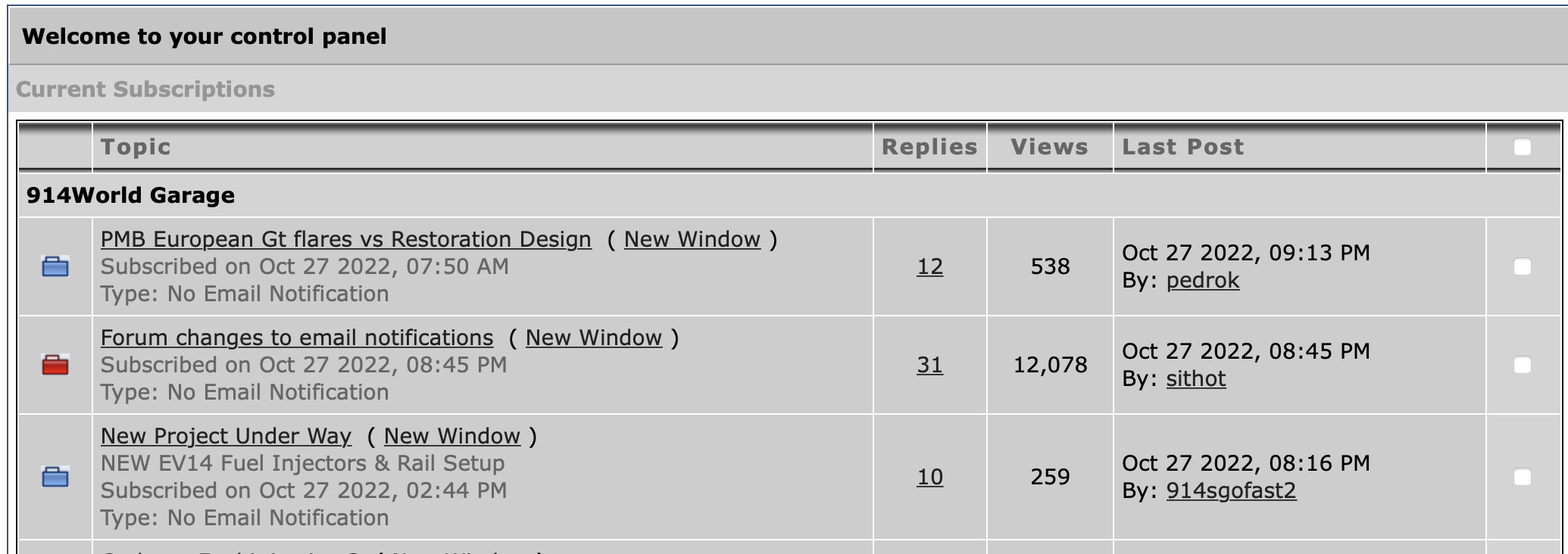 Go to Notifications on main site. My Controls will appear above the Meme with the Red 914 Click on it. Next screen will be:Welcome to Your Control Panel "View Topics" under Subscriptions in the far left column should give your anything followed or posted in. First: Second: Third: Voila! |