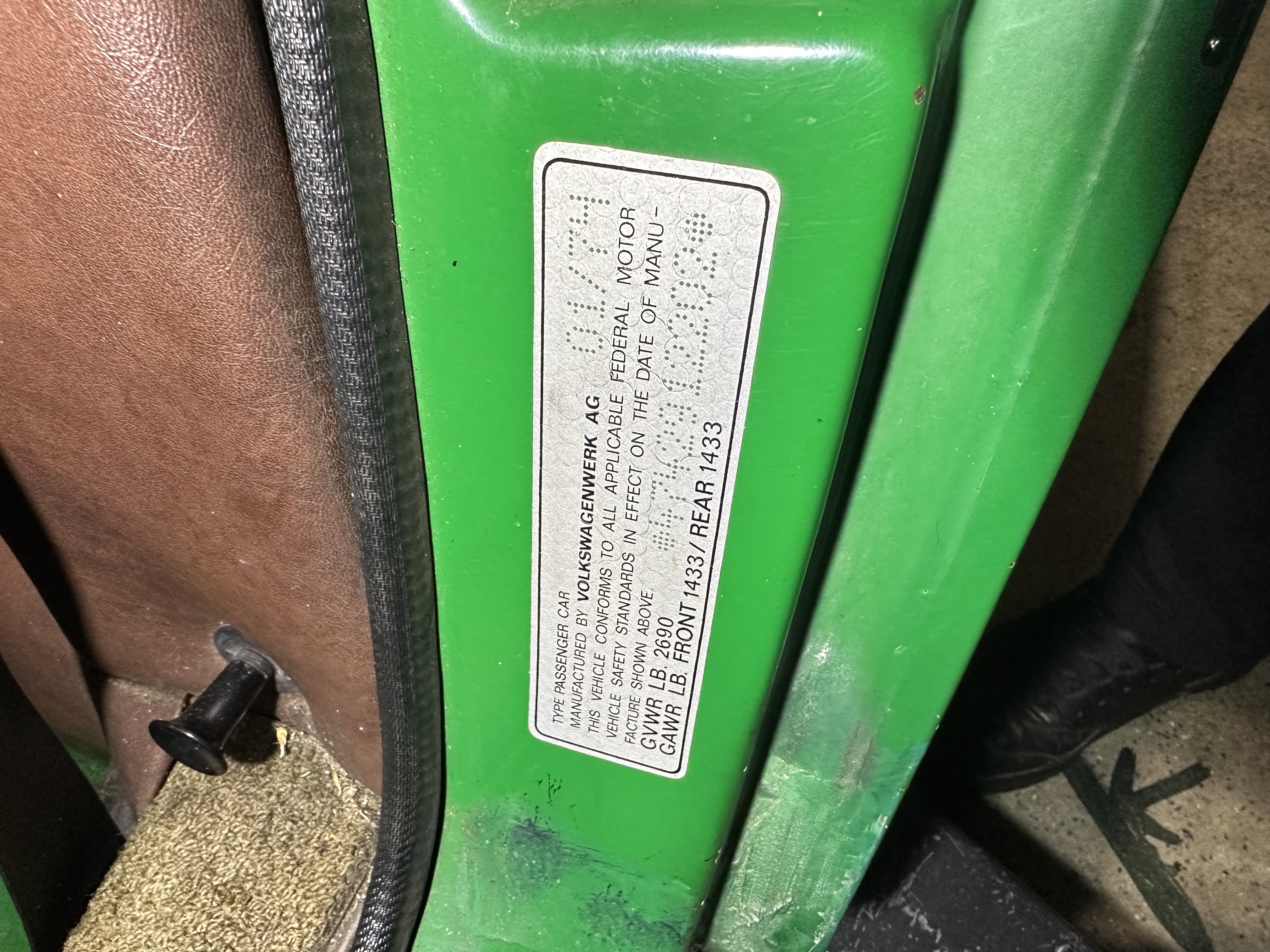 Definitely sounds like the AFM is doing stuff… but also, you can’t have that idle screw all the way down. You won’t idle like that. Put it two turns out and leave it there till you’re ready to set it up correctly. Ref the video I made for you, remove the vac hose on the decel valve that runs from the side of the valve to the manifold. Block off the manifold and the port on the decel valve. Leave everything else connected for the moment. Give it a start and lets see how it behaves. Also, please post up your door placard so, we can confirm your mfg date. Did as instructed I opened the idle adjustment screw 2 turns and after cranking a bit the engine started with a rough idle then stayed around 2000-2500 rpm. Again when gassed the rpm drops to almost stall but when I release the throttle it would idle back up to 2500 rpm. After 2 stabs of the throttle it finally stalled. I 've included the photos of the blocked off manifold T and side of Dcel valve along with the door label showing a Jan.1974 build date. The "idle" speed does not seem to be changed by turning the screw Attached thumbnail(s) |