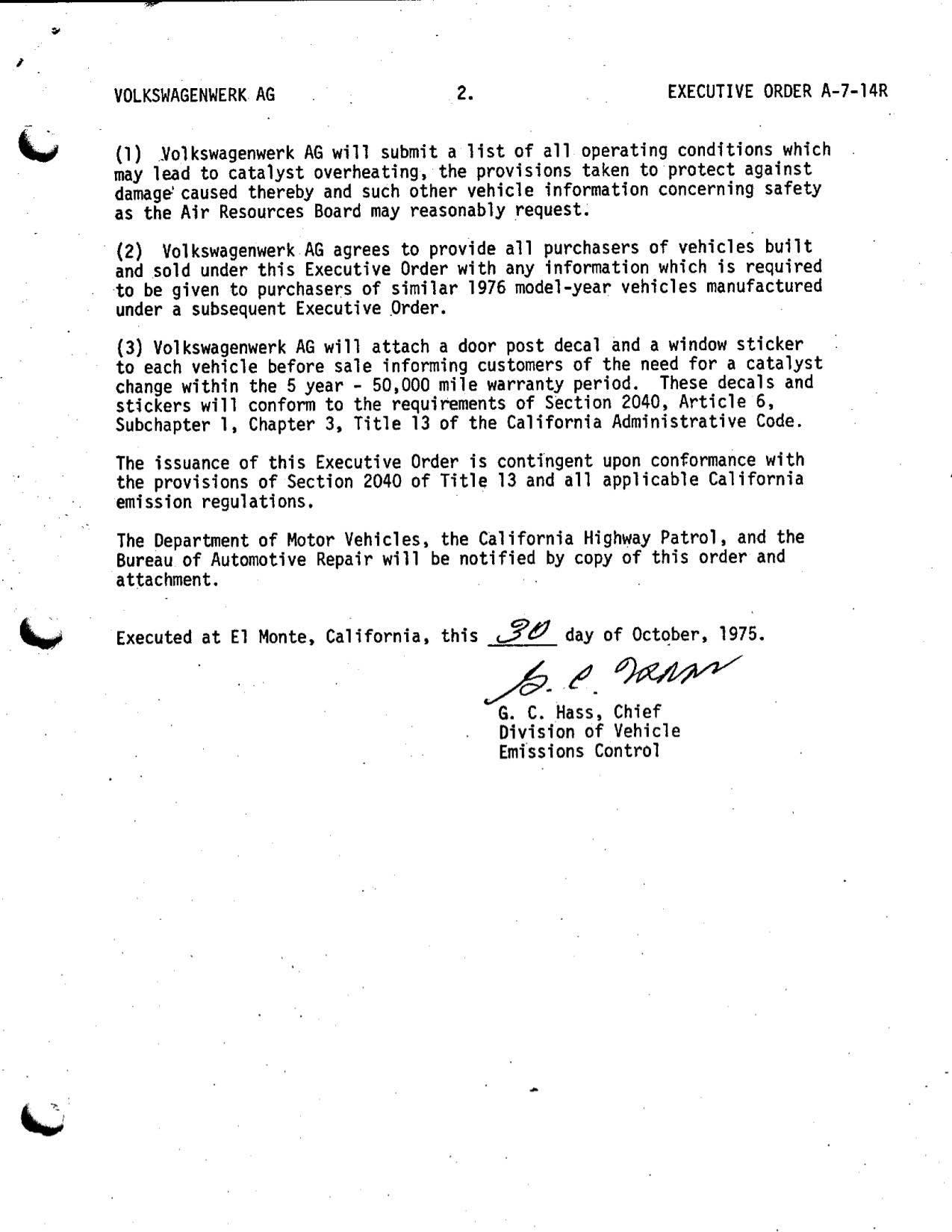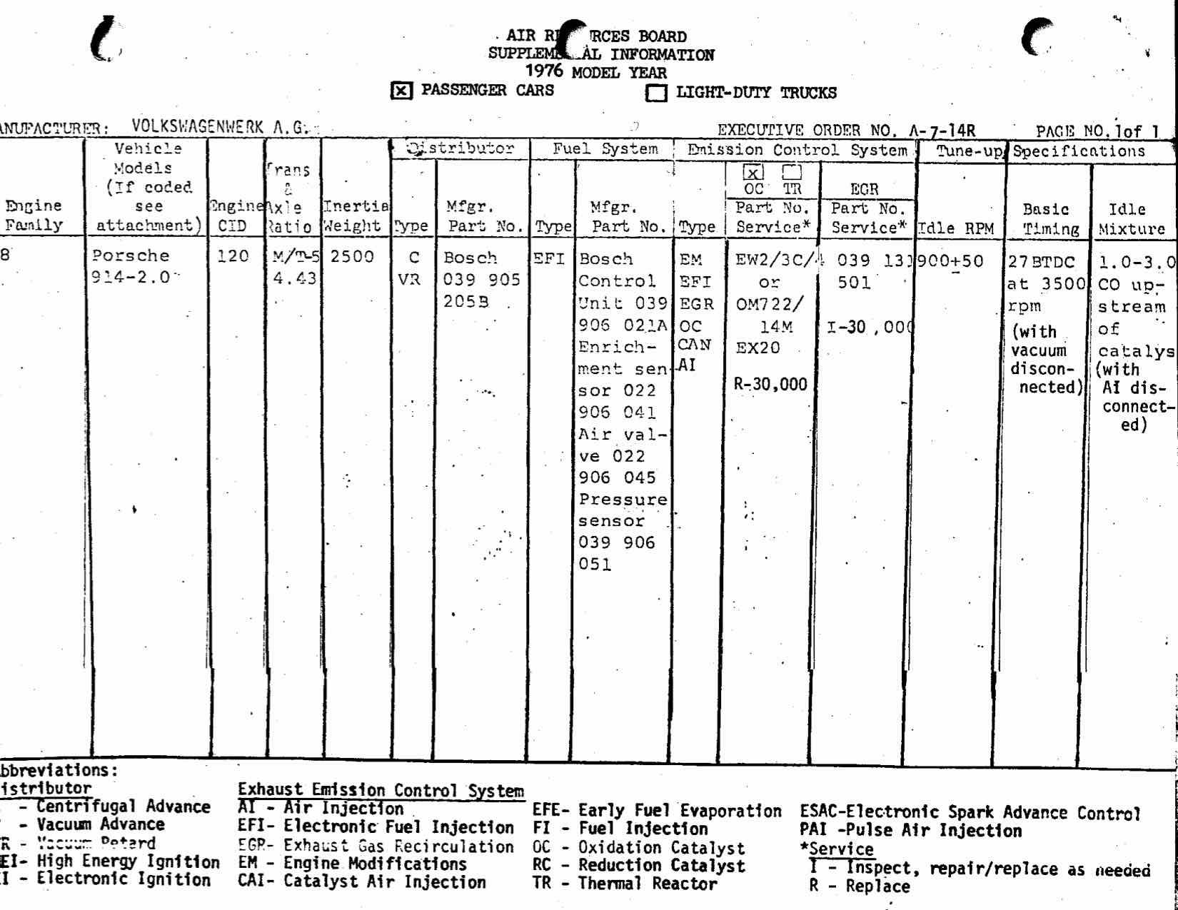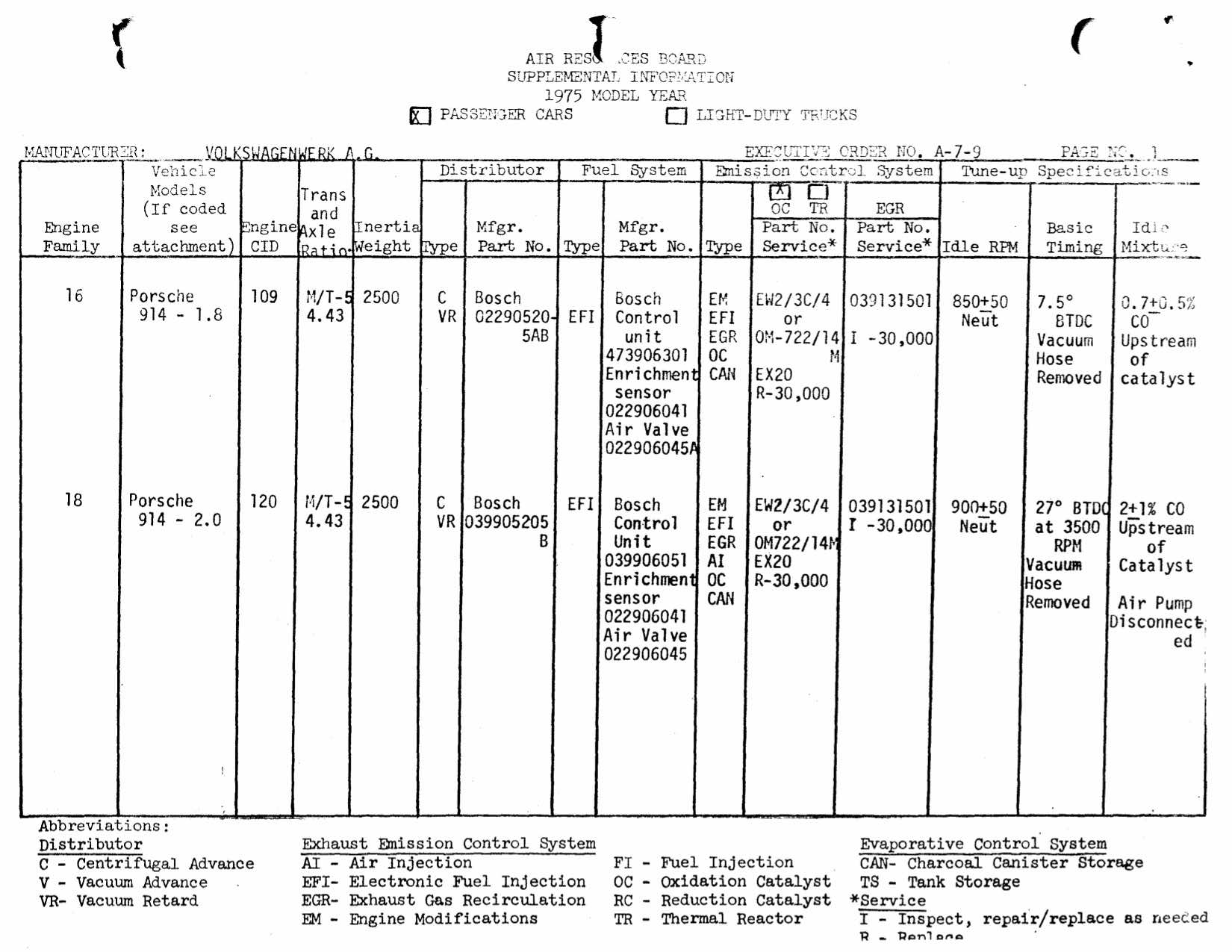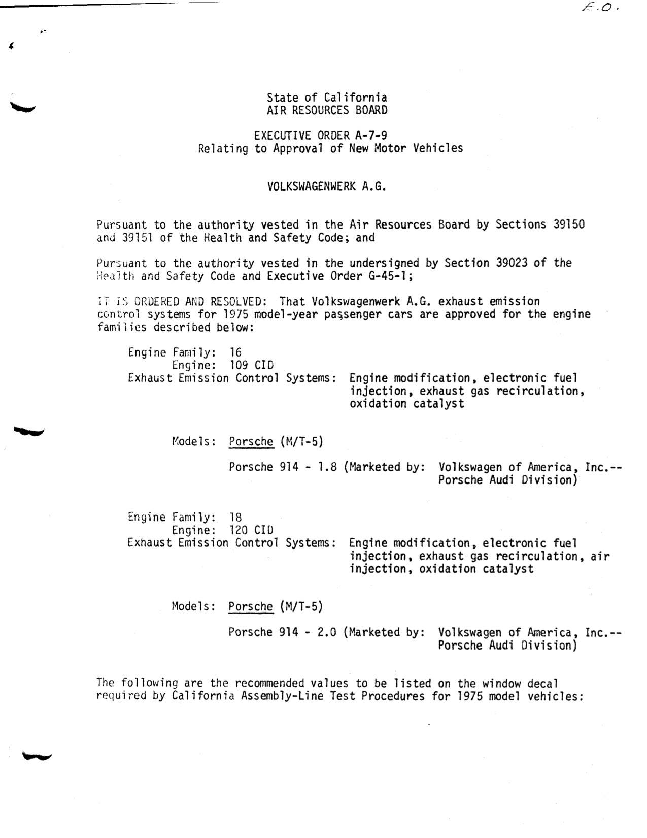 i found the CARB executive orders on the 76 after another search. it was under VW (not porsche). (IMG:style_emoticons/default/headbang.gif) 1976 will be what CARB would be using to determine original emission equipment fitment. comments. the executive order is laced with a series of conditions. all beginnng with "be it further resolved". note about only valid on vehicles produced up to 31 DEC 1975. the inclusion of 1. Replacement of CAT at 30,000 mi. 2. Inspection of EGR at 30,000 mi. 1975 for reference. i've never been able to find the USEPA records to see just how they were certifying cars. suspect they have been transferred to US govt. national archives. may not be digitized. |