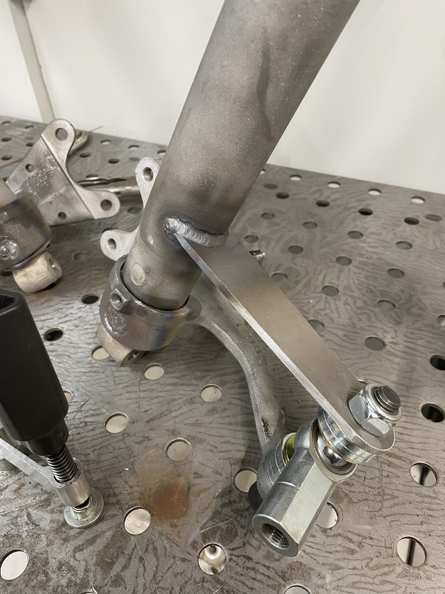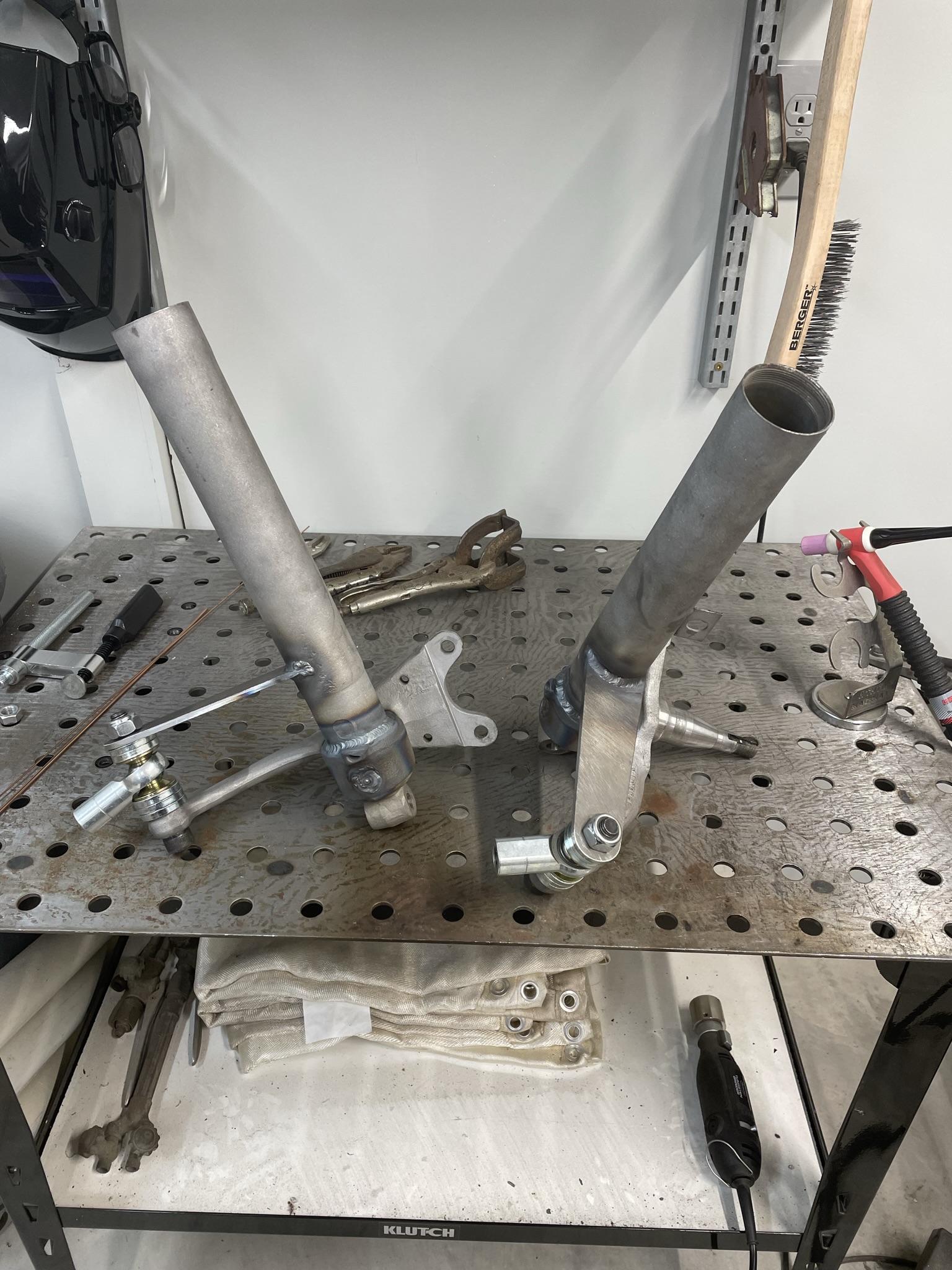 Fast forward…..thanks to @mepstein , I have 911 struts to mod. I lowered the axles 1.670” and added a steering arm brace to allow for heim joints (vs ball joints). Welded them up today and now they’re ready for prime and paint. |