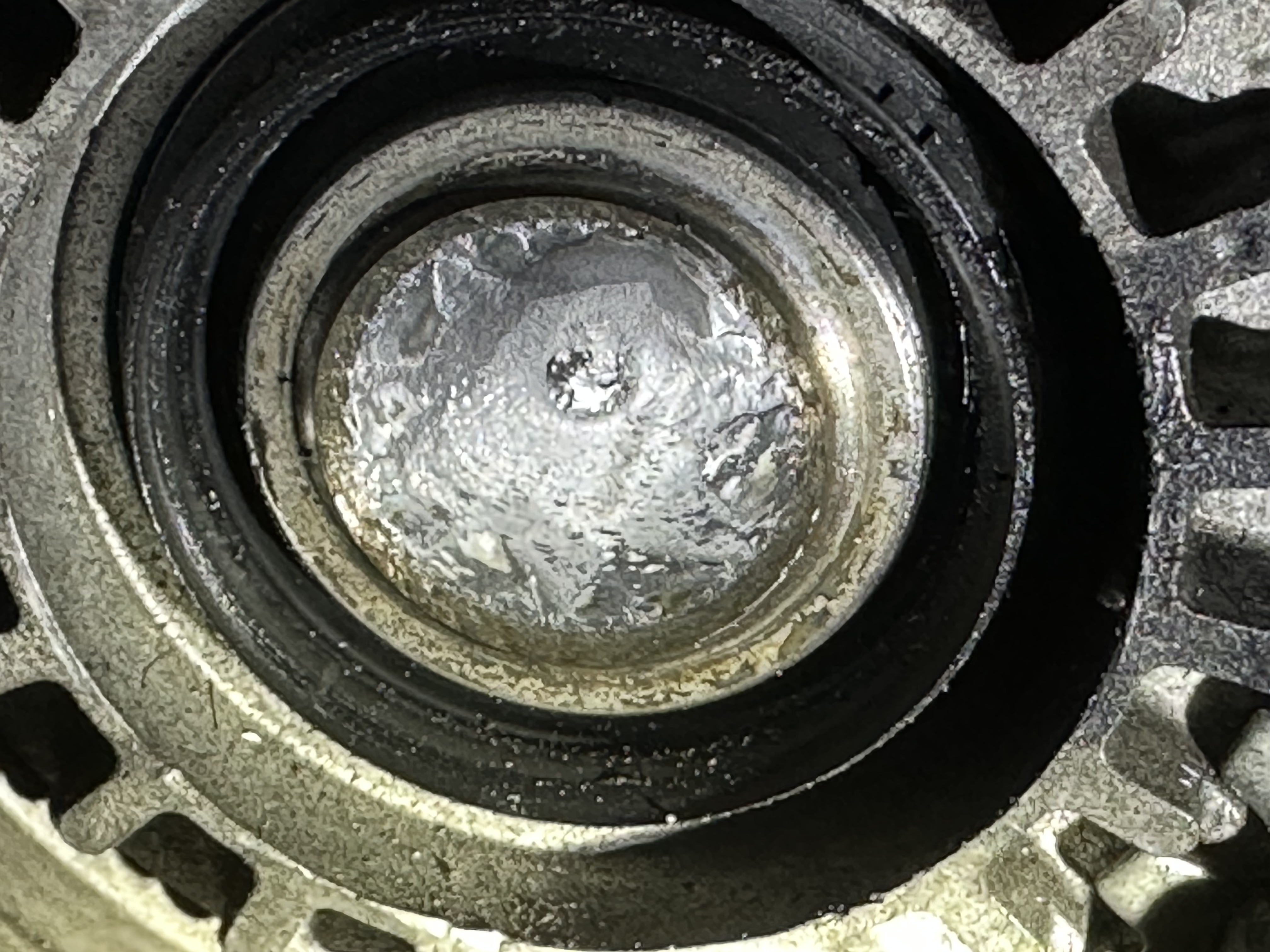 I haven’t had a chance to inspect the fracture surface in detail yet. The bonus of a tight engine bay.. the inboard CV got trapped between my subframe and the bell housing. You can see some material missing on the case to left of the sheared stub. |