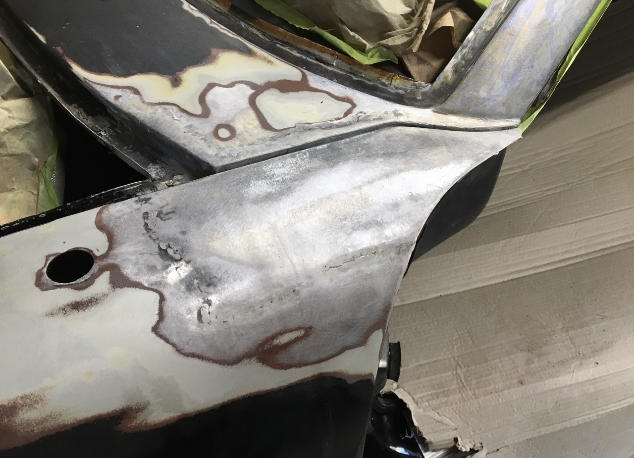 The cowl and fender were rotted, the replacement was from a ‘76 which had the radio aerial on the opposite side, hence the difference in the slope of the fender. I was able to separate the two pieces repair the metal adequately, weld them back in place. |