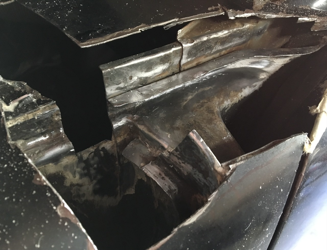 I cut the fender back in small sections till I get the work space I need. Once I have enough working space I remove all signs of rust. This piece had to be fashioned to close the gap where rust has been removed. If the process takes me a bit of time, I coat the parts in zinc based weld through primer, (it’s easily removed with paint thinner as it doesn’t have binders in the paint), also if I don’t remove it from creases and folds it is great rust protection. It takes a fair amount of time but the results are well worth it. |