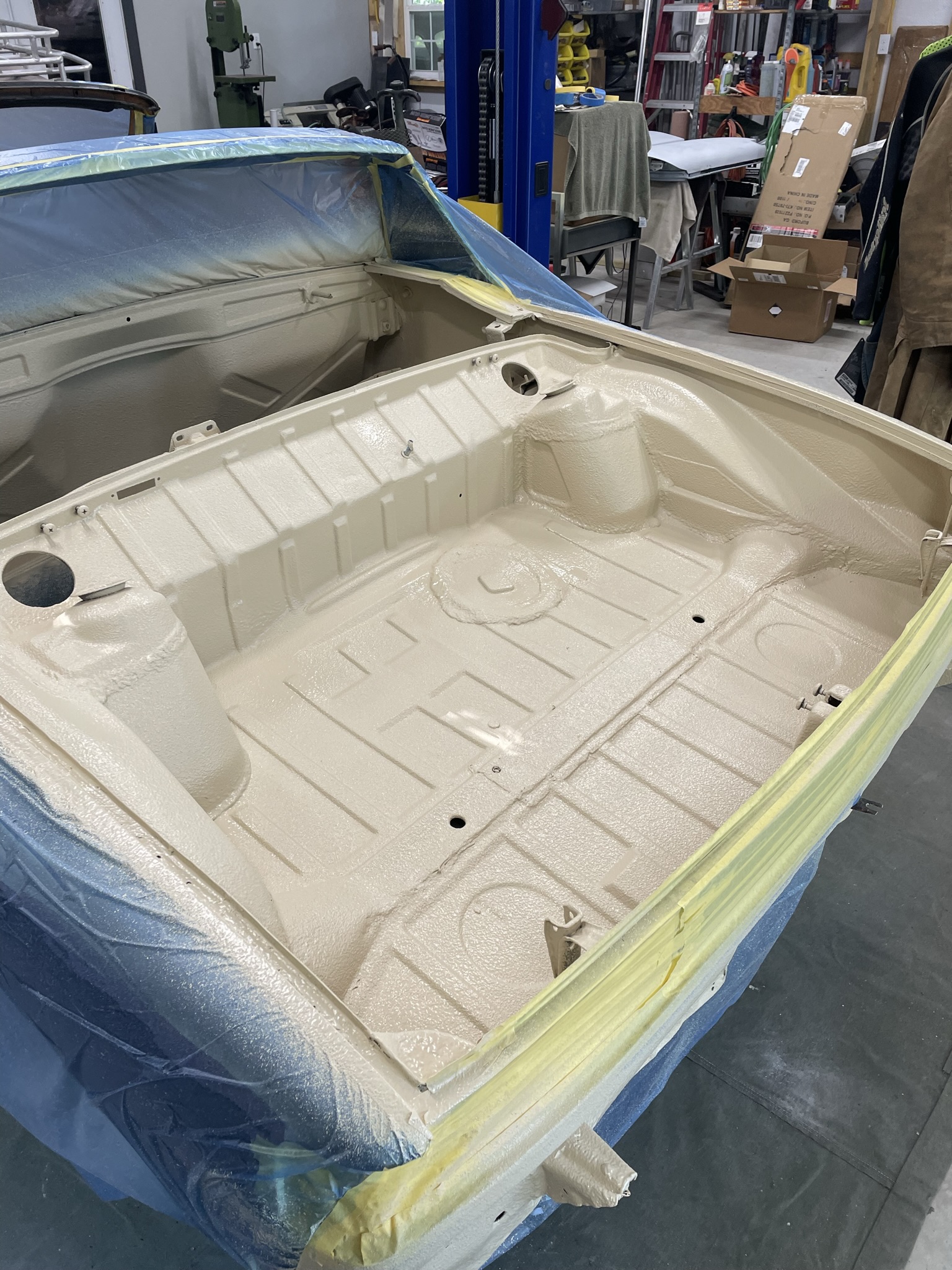 Just sprayed my tub with Custom Coat bedliner (from TCP Global). I did black on the underside of the car and tinted (to match my exterior paint color) in the trunks, engine compartment, and interior. I used Raptor on my last project and this was the same to work with and results seem the same. Just another option……I got mine from Amazon.