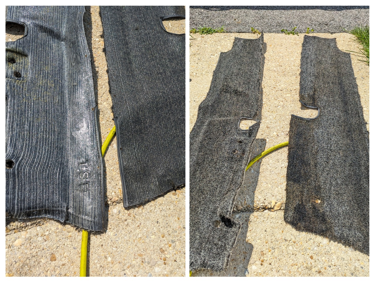 Timely conversation, I’m a couple days late, but I think I can add value here. I was out degreasing and power washing my carpet to see if it can be saved. I noticed that there is definitely a typical VW parts bin effect here. Passenger side has a black rubberized base while the driver side is more translucent. Maybe its a coincidence, but the passenger side would not come clean, whereas the drivers side washed out pretty well.
