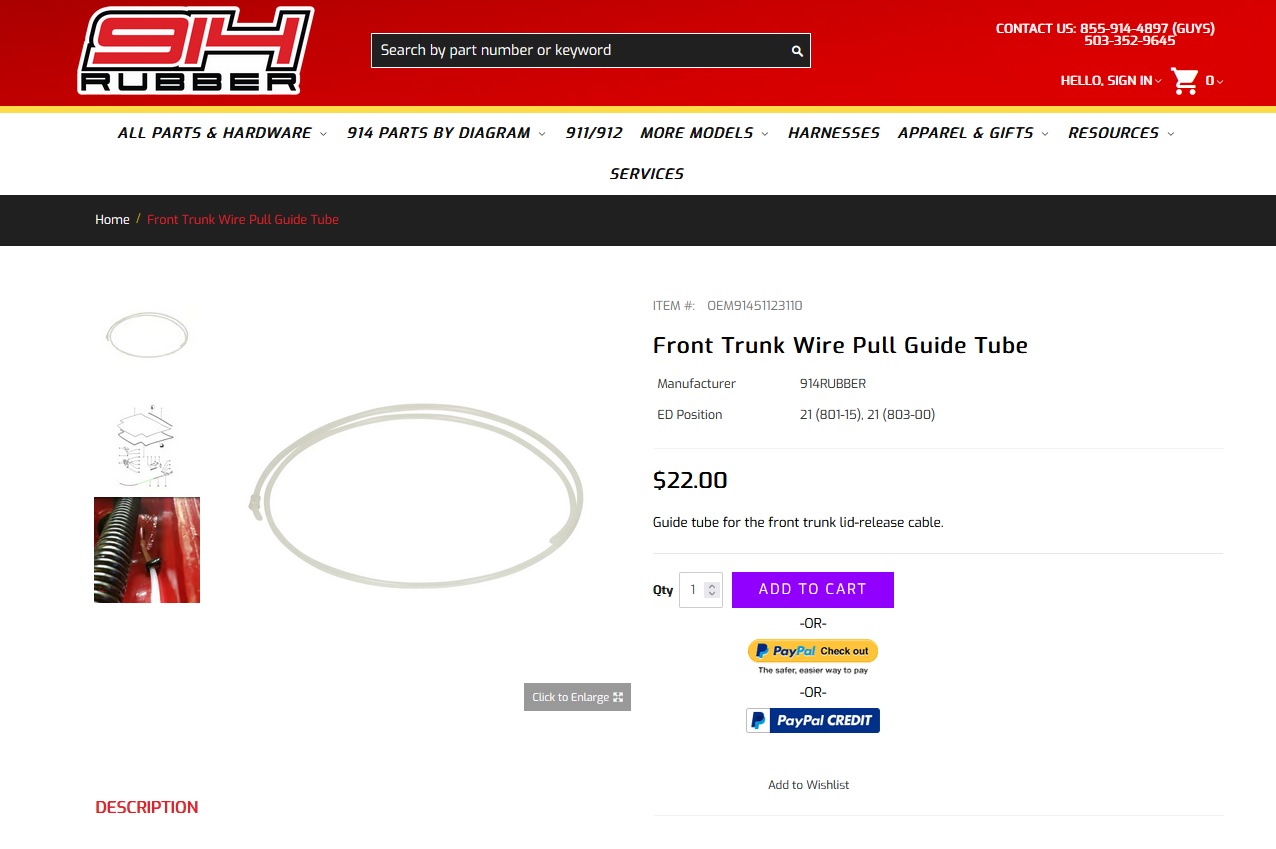 https://www.youtube.com/watch?v=MvbQ4wJak_c Channeling Kevin Kline here... So while 914 rubber was out of stock I spent a lot of time coming up with a nifty solution to the outer cable housing problem. I almost had it but my vertical lathe, AKA drill press could not handle the work and the part I started with was running out of metal. Then the part was back in stock so I just ordered one and it got here quick. I started fitting it and it was very tight. The tube is roughly 6mm plus a bit. The old cable housing I had that was bad was 6.05mm, it slipped in pretty well, tight but it went in. The new cable housing was 6.35mm and was too tight to get in the tube, even with lube and some firm hands. I started looking at the tube and decided it had some slag in it or something that was making entry difficult. I carefully drilled out the first part of the tube from the trunk area, cleaned it out and lubed it again. I got the new cable installed up to the stop on the housing. I fed the wire in from the front seat and did a test fit, everything seemed good. I started to take it all apart to route the cable and lube it and the stop on the cable housing broke free and now I am back to the very beginning again! @Mikey914 I know you are very busy and shorthanded, do you have any suggestions how I can repair the front trunk cable guide tubing I just bought? Thanks, I'm showing these in stock and the version with the cable as a kit is too https://914rubber.com/guide-tube-for-front-...release-cable-1 The stop is welded to the body of the tube. If you got a defective one from us we will be happy yo replace it. Our failure rate on these is pretty low, and with the process we use (if done properly) it should be non-existent. You can PM me the specifics and I'd be happy to take care of this. Attached thumbnail(s) |