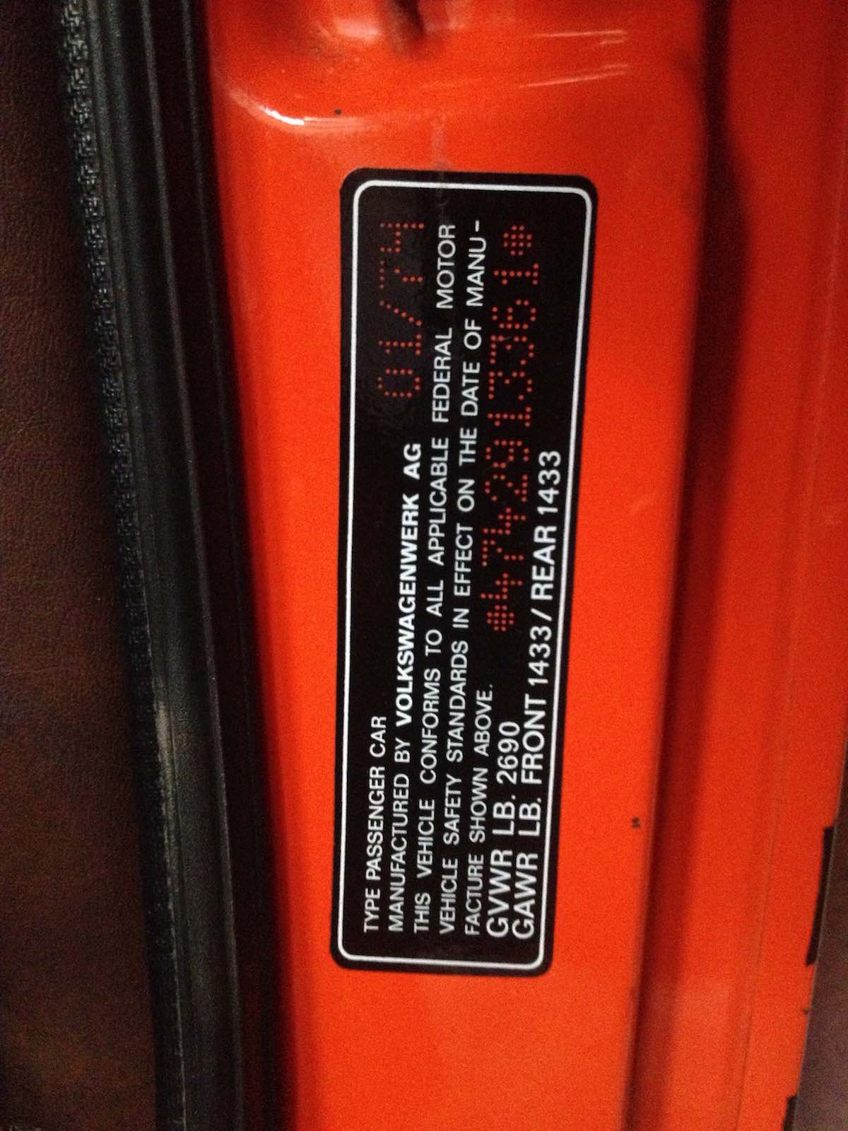 here is mine. OG factory. its in pretty good nick. yes it is glossy. it has all the circles in it but i would have to take photo out in sunlight for them to be visible. thing is @dr914 @autoatlanta.com has a pretty good repro, but the one on his website listed is not quite exact for a 74. you can see the 74 has TYPE PASSENGER CAR as the separate top line. you could email him and ask if he has this correct one for our 74s or perhaps he will come back and comment to clarify what he has in stock. (IMG:style_emoticons/default/beerchug.gif) pity about carbone. i wonder who cracked down on them over the stickers. it cannot have been porsche as VW also used these stickers. or was it porsche. interesting anyway that copyrght is being enacted on something that is now 50 years ago. i wonder if copyright holds that long. i did not think it did. i'm wondering if it is porsche and carbone are getting a bit confused because our vin stickers have no mention of porsche on them. its a VW vin sticker. the bit that it is possible that porsche could enact copyrght on is the Dr. Ing Porsche etc part that is on the 911 vin stickers. |