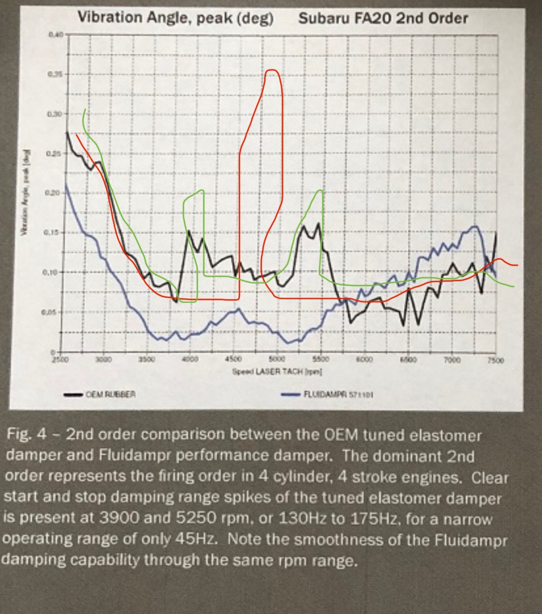 Found some interesting data for the FA engine Harmonic damper is tuned for 2nd order - for about a 150hz resonance. I’ve overlaid in red what the crankshaft resonance would probably look like without a damper. When a tuned mass damper (harmonic damper) is used it cannot reduce the energy input; it can only redistribute the energy to other frequencies. When it does this it usually creates two side bands - one above and one below the resonant peak. I’ve artfully (IMG:style_emoticons/default/laugh.gif) illustrated this in green. These plots appear to have been created from data supplied by Fluiddampr so there is the comparison of OEM Harmonic Damper to their product. While you can see they (Fluiddampr) knock the resonance down further, they do this by pushing the energy out to higher frequency (RPM) range. This would not be a good thing for extended racing / track day use where the engine would spend more time at those higher RPMs. The bottom line: FA motor making a whole lot more HP and Torque than our measly T4s and it would appear that perhaps the Subaru cranks has some propensity for a 150Hz resonance. Another interesting dilemma is that just because it has this resonant frequency doesn’t mean that it is a durability issue. It just may be that Subaru is using the damper to calm NVH and make the car more enjoyable to drive. Without access to Subaru durability or warranty data we can’t know for sure which reason it is that Subaru is using the harmonic damper. Obviously, we would need similar data for the VW T4 to draw any conclusions about whether the T4 would benefit from a harmonic damper and of course that data would be needed to tune it appropriately. Source: https://www.ft86club.com/forums/showthread.php?t=139127 PS: Thanks to you I’ve learned a little more about subi’s than I knew a few days ago (IMG:style_emoticons/default/beerchug.gif) |