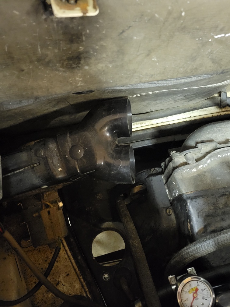 I have this seeming factory Y pipe. (IMG:http://www.914world.com/bbs2/uploads_offsite/i.imgur.com-14731-1702300378.1.jpg) it's a 52mm OD as are the J tubes that run through the tins the the HEs. Almost every source for theses lists 55mm or 60mm hose diameters? Do folks since them way down? I bought AA's heater blower update kit with the Y splitter and installed it over the weekend. The hose that goes over to the passenger side is very long. I'm interested ins seeing how others have that hose secured as it goes over the engine from the motor to the passenger side. I'm guessing zip ties are used? My fear is that having it loose and flopping around in the engine bay, it could get sucked into the cooling fan (and it just looks bad). If you have this set up, please kindly share a pic of how you ran that hose from the motor to the passenger side? TYIA the original plastic hoses had moulded ends on them where they clamped. the moulded ends matched the blower outlets and the j tubes. early was 61 and 73 on were 55. this referred i think to the diam of the corrugated hose section itself. there was a long thread on all this about a year ago in terms of trying to get the right diam hose - any hose you get now does not of course have the moulded smooth clamp sections on the end as the originals had. i think i remember in that thread it was all about how you could not quite buy an off the shelf hose that would fit snuggly over the j tubes and blower outlets. |