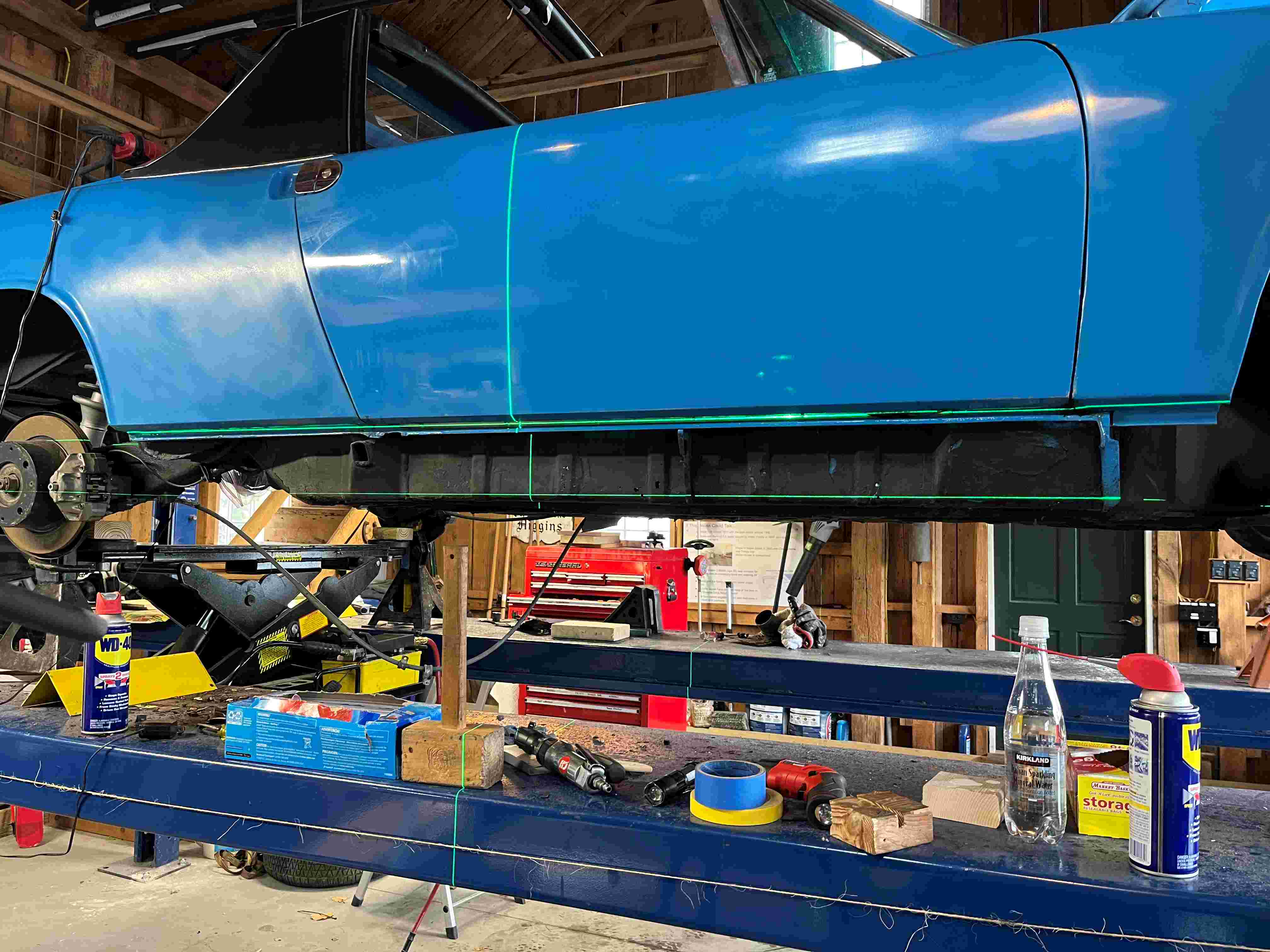 Got the car on jack stands and all leveled out using my buddy’s laser level in preparation for probing the passenger side long. There’s a number of areas along the long that have rust holes at or near the bottom.