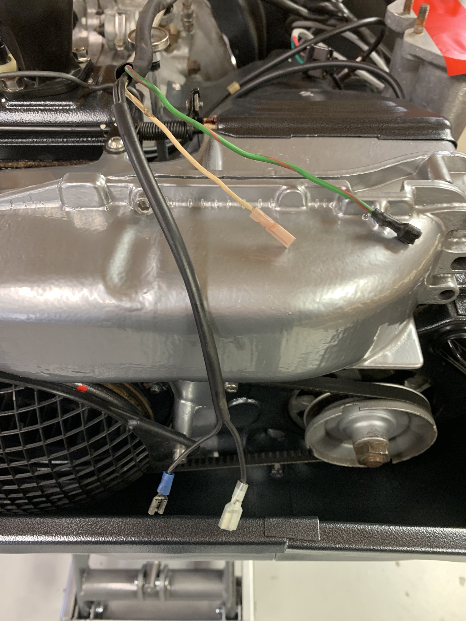 Progress has been slow. Many excuses. But very close to engine installation now. In the pic below, there are 4 wires. This is the "over engine" wiring harness that connects to the relay board with the large(ish) multiplug. Two of them go to the coil (and I even know which side of the coil each goes on), but I am not sure about the other two. One is green and red striped, the other is white. One of them is surely for the oil pressure switch. But, I am not sure which one?