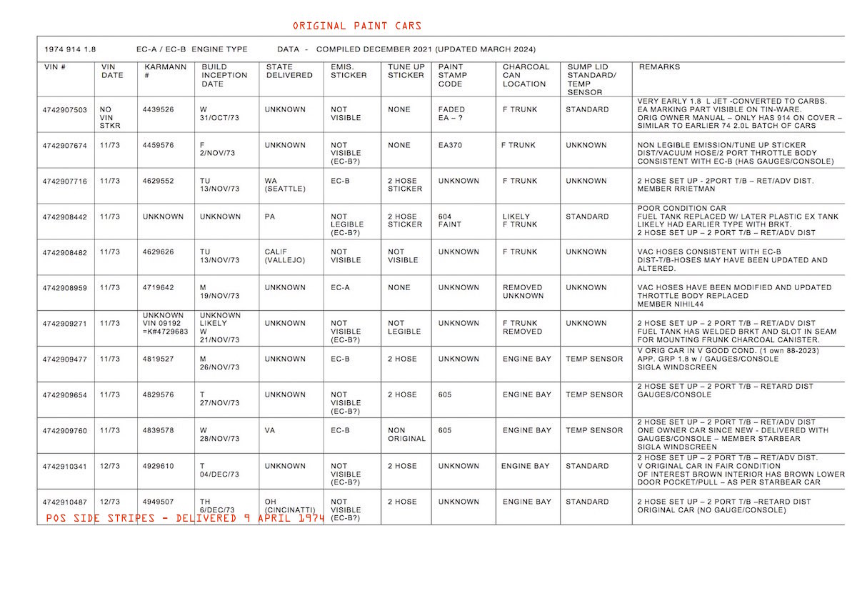 this was one of the last little things i was vacuuming up on the 1.8 L jet data. following up on this post of yours here on this website from nearly 20 years ago. and what i am coming up with is april 1974. i have just enough L jet data from very sound original cars gathered on file that shows that the first Ljets built in nov to dec 1973 were being delivered in early to mid april 1973 and were receiving the positive side stripes that were used on cars from 70-73. and the cars being built in jan 74 and being delivered in late april - may 74 were receiving the negative drop out stripes identical to the "can am" cars. funnily enough the earliest example i have collected of the negative side stripes is my car. jan 25 1974 build and delivered friday 5 april 1974. in fact of the examples i have on file with delivery paperwork etc mine has the shortest elapsed time between build and delivery. a little over 2 months. most have an approx 3-4 month lag between build and delivery. (kind of fits with the car itself, i think it was actually ordered specifically rather than bought off the showroom floor - with its sway bars, parcel bin etc). so im finding april is the cross over month where the cars get both positive or negative side stripes depending on the dealer. two of the examples i have on file with the positive side stripes list the stripes on the windscreen sticker forms. both april deliveries. i'm guessing maybe that possibly the first of the "can ams' must hit the showrooms around late april or early may. another one of those interesting things about the L jets. the very earliest of them get the positive side stripes and after that from jan build dates on more or less they get the negatives. ill sort out the data and plug it on to the end of the L jet file thread. i'll keep searching for a drop out graphic show car but i reckon the turbo prototype is it as far as public display of the graphic goes during late 1973. and then it pops up at the dealers as part of the package for the "can am" cars. all timed to start showing up on the "can am" cars before being fitted widely to any 914 if you wanted them. EDIT L jet data with side stripe info noted in. (will load up later on L jet file thread with images showing examples and documents). with so many cars repainted over half a century/so few original this is the only examples i can trust. interestingly all of them are like mine. the decals (whether positive or negative) are full length and wrap around the edges of the lips of the fender into the wheel wells. |