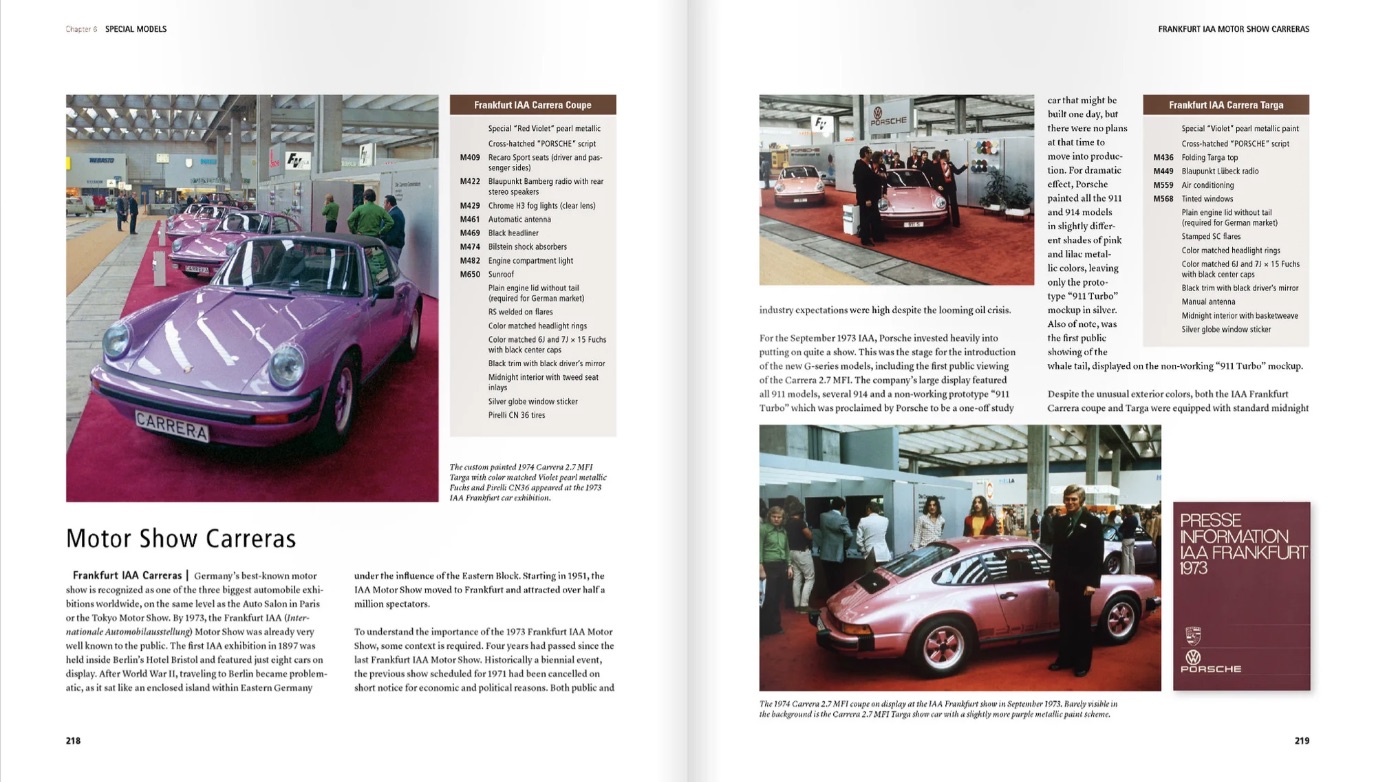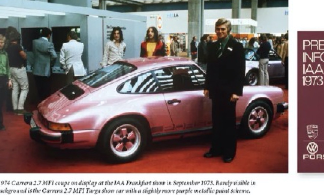 Wow. What excellent info you have researched and the sidebar context is tremendous. Your research matches mine, and with greater detail. The Can Am cars were built from mid-February thru the 1st week of April. Promotion by US dealers began in April/May. One of the earliest cars is the Matsuda Japan SL that George Hussey owns, built first day of production, and it has the negative stripes. I think you are on to something with that L&M car color scheme and the Creamsicle, LIKE the reference. That CS color scheme is also on the 73 911RS cars. But not the black/yellow combo, I have not found a literal reference for that scheme. Good on you... going after images of porsche stand at frankfurt auto show 1973 where the turbo debuted with the drop out side stripes. found image of one of the long sides of the display stand. where 911s were lined up (other side to where the lilac or purplish 914 is in other photos). gets interesting. they all have the drop out graphics side stripe as per the turbo. its from this book. description of the display cars shines a light. all cars were painted shades of pearl pink through to lilac including the 914s. in description (limited to the 911s) it notes as well as the special paint color the term "cross hatched PORSCHE script". this must be how porsche refer to the drop out graphics side stripe? hard not to think that in sept 73 at time of frankfurt show they are thinking of using the drop out graphics on the carrera range. and the turbo proto carries the same proposed script. so its not exactly true that the script appears for the first time on the turbo proto. rather the script appears for the first time on all the porsches at the frankfurt show stand. i have only two photos showing the side of display with the 914s. i assume there were at least 2. the 1.8 and the 2.0. but only the 1.8 is visible in the photos above in previous posts. the 1.8 does not appear to have the side stripe script at this time. it seems like the original idea might have been that this was what the Carreras would have as graphic decals. maybe......what happened.....is they changed their mind on the carreras and went for the cursive script and given they had the design already for the drop out script they shifted that across for use updating the 74 914s just in time to save the "can am" after porsche left the Can AM series? |