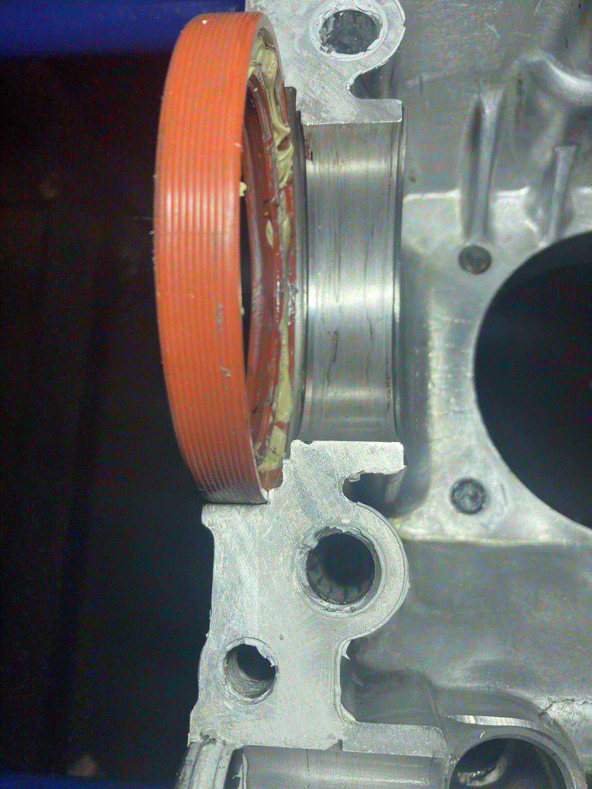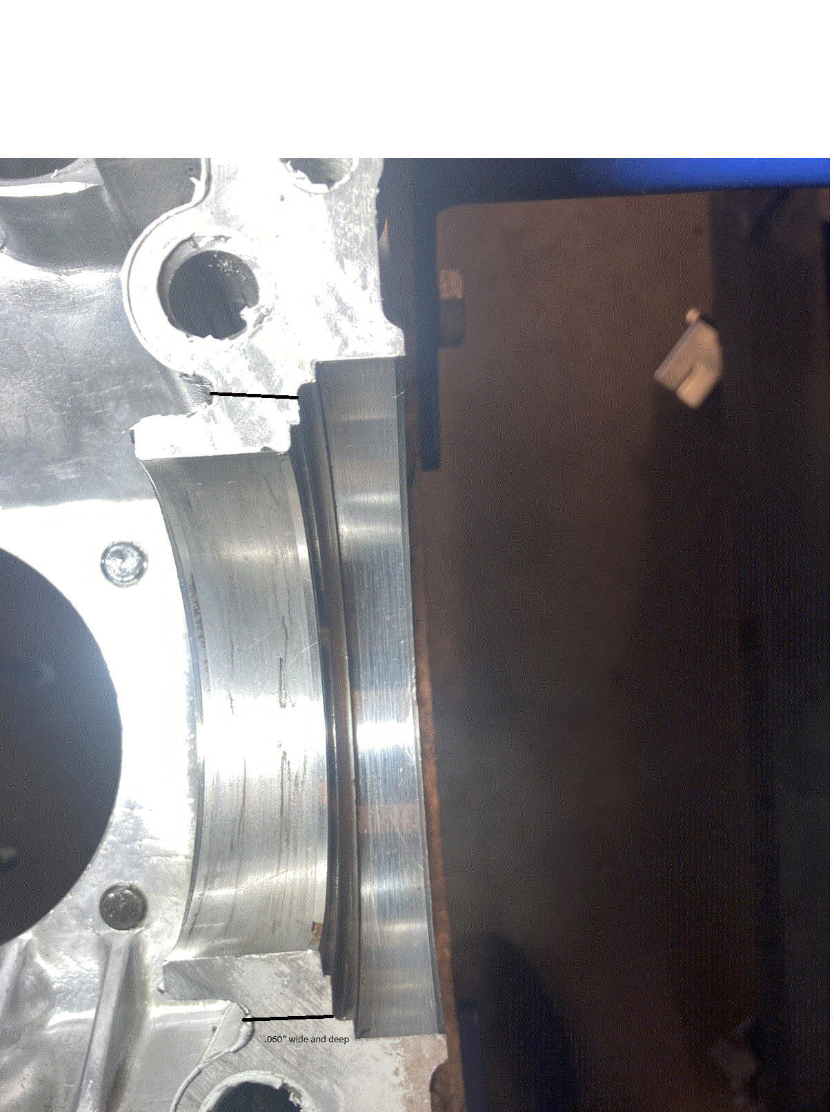 What I haven't see yet is "what does the other case side look like?" Does Raby do the groove on both cases? I don't know! No. In the video the groove is only in one side only (mating side from video below) I suspect it isn’t hugely critical. My guess is that it’s only in one side because . . . Why set up in the mill twice and go to the trouble to match the position between case halves. Just trying to get a lower alternative path to bleed out some additional oil below the OEM drain. Here are close up picts of the RMS and Rear main bearing test installed to get a better understanding of the RMS leak back mod to avoid oil trapped too high behind the seal causing RMS leaks. Please see my feeble attempt at drawing a line where the groove is cut in the lower case. With the RMS and bearing installed, you can see the proper place to cut the groove between the seal and bearing on either side of the RMS. I heard .060" for width and depth. Is that correct? Should I really do it myself with a triangle file or a Dremel? Or should I ask the local small town =917843] Attached thumbnail(s) |