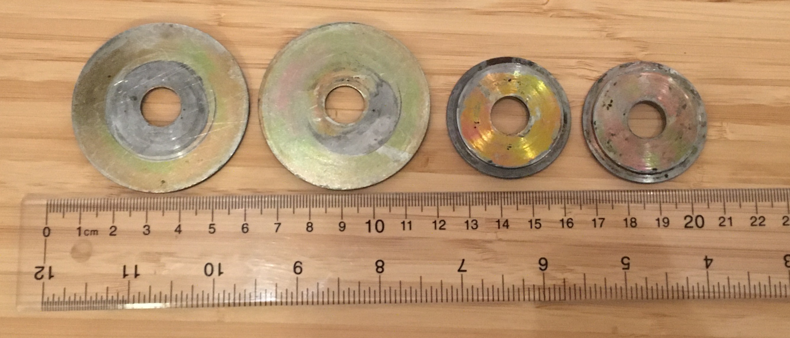 The PO of our car swapped out and removed a bunch of stuff. I have a stash of various large washers I can pick through, but can't find specs to know what's correct. They all appear to be NLA, so hard to even find pictures. Are any of these unique in that they're concave or slotted?