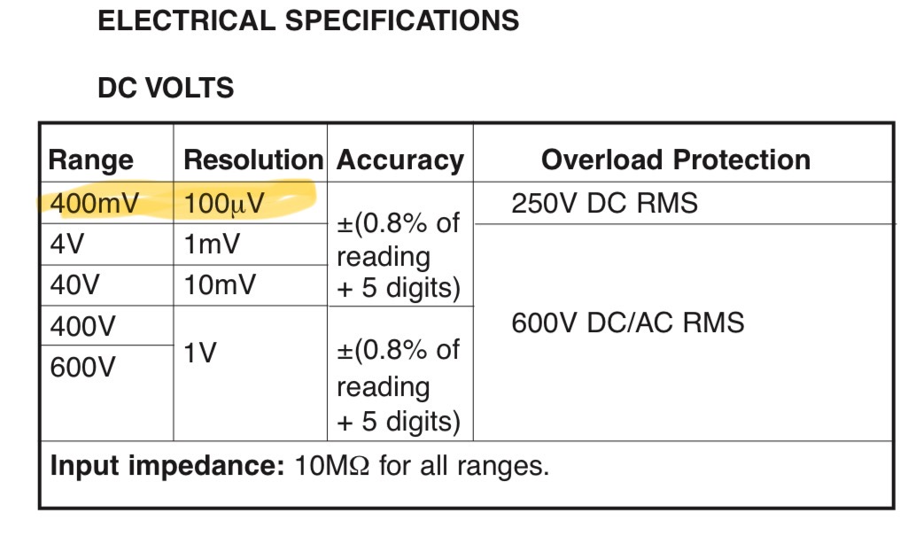 However, it should be fine as it does appear that part of its “range” is a 400 mV range. Seems a shame it won’t let you select that range manually but life goes on. Here’s its specs; When you make your measurements, just allow it a couple seconds to auto range itself down to the appropriate level. Hopefully, what you’ll be reading is 0.0xx volts. So give it time while the engine is cranking to shift that decimal place over for you. |