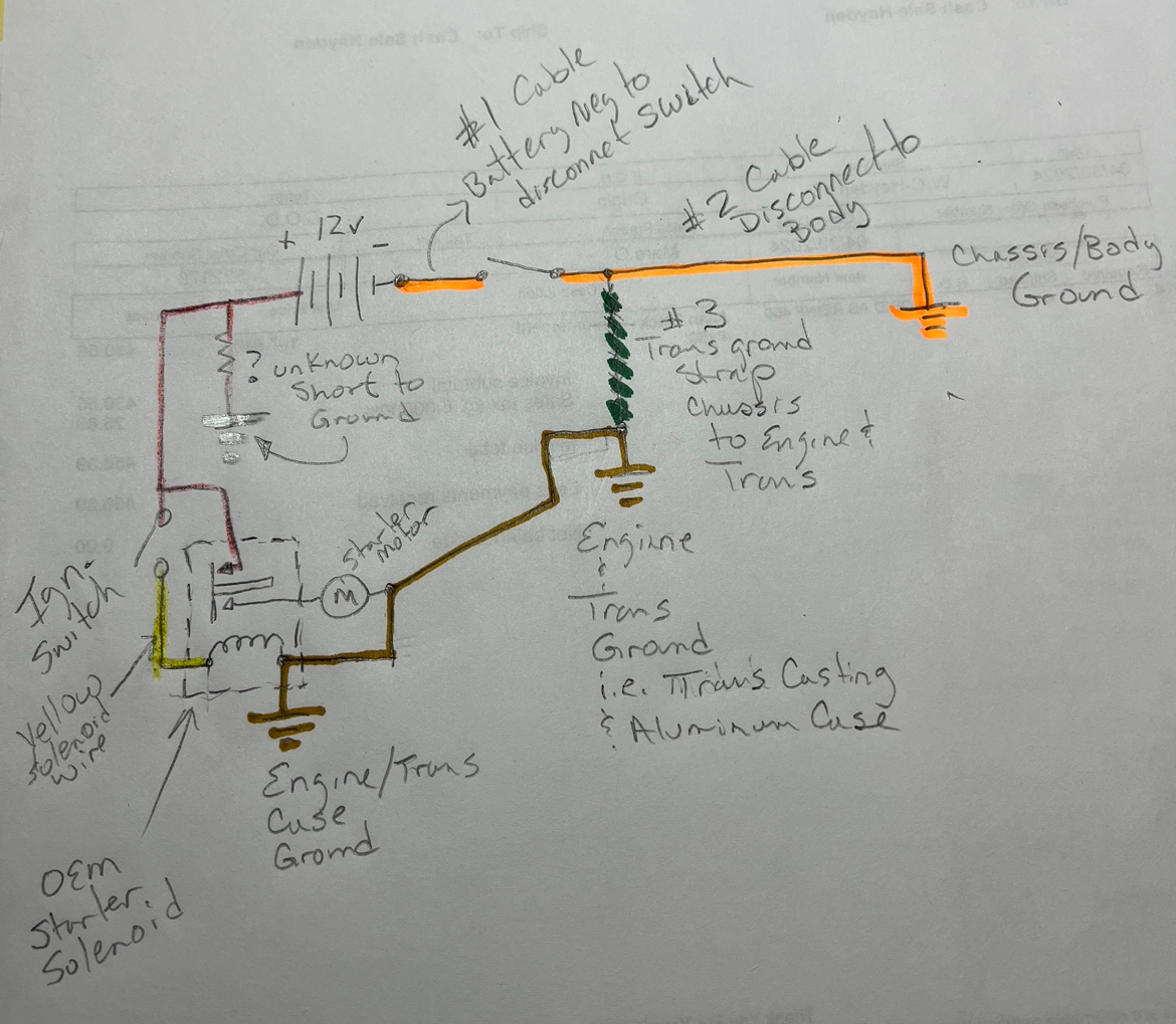 By adding in the disconnect switch, that adds at least one more ground cable. #1 cable goes from the battery negative to the switch, and then a new 2nd cable from the switch to the body. Generally speaking this is bad design practice. You want to keep the ground cable from the battery to the body as short as possible. That’s why the OEM chassis ground point is right behind the battery and is brazed in to assure a good electrical connection to sheetmetal. The bottom line is that if the switch and ground cables are quality parts, they really should have no effect on the reliability of your chassis ground. However if they have too much resistance in any of the parts or the connections between them, this is going to make any potential hot starting issues worse. I’m not sure if this helps you to visualize what is going on, but the bottom line is that with the disconnect switch and the Ford Hot Start relay, you are only adding in more complexity and electrical connections that could impair reliability. We can use or revise this schematic if you decide to continue to troubleshoot after you install the new hot start relay. |