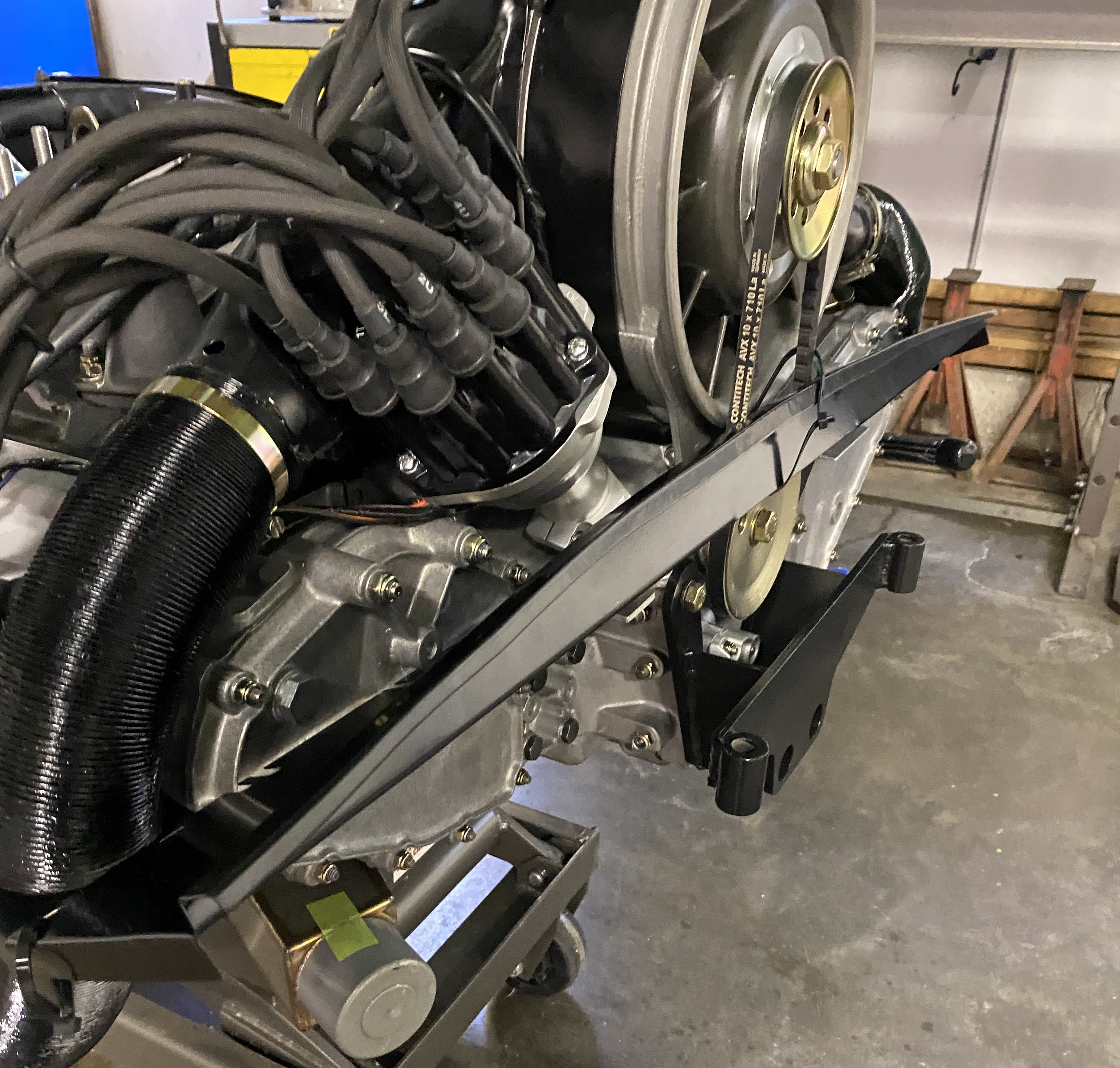 http://www.914world.com/bbs2/index.php?sho...8279&st=420 I have the car on my 2-post lift and the engine on my lift table. I am using the Mad Dog Motorsport bulkhead engine mount. I plan to raise the engine on the lift table, lower the car on the lift and jockey the engine into position One of my concerns is the balance of the car on the lift as the heavy Aluminum case 3.2 short stroke engine is engine gets installed. I noticed that as I was disassembling the car on my lift that car was heavily weighted towards the rear before the engine and gearbox came out. I could almost tip the car backwards. I remedied this by running a jacking strap through the cockpit onto the arms of my lift to hold the car in place. I am thinking I need to do this again before attempting the -6 engine install. Any thoughts or suggestions? I plan to install the engine without the side tins and carb rain hats but with the heat exchangers and engine oil lines. My oil t-stat, twin coils/MSD boxes and fuel lines are all in place in the engine compartment. I plan to install the CV/axle assemblies, the side tins and the muffler after the engine install. Does this sound about right? Anything I am missing or need to look out for? |