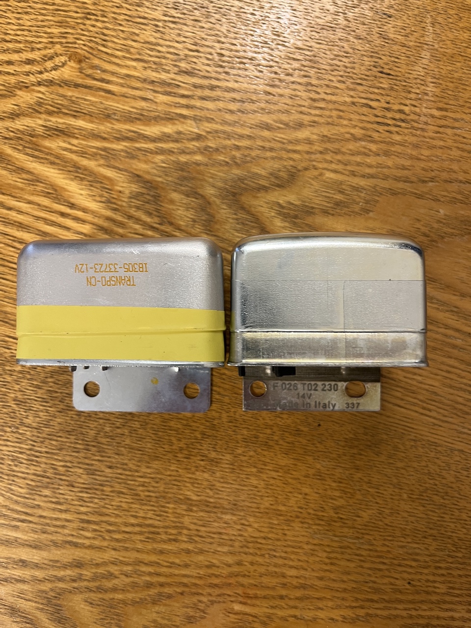 Thought I would show what is going on. The aftermarket are 180 degrees out in the rear and that makes the single one in center out. Depth of bottom is about 1/4" shorter the Bosch one. Aftermarket will work with enlarged holes BUT it still sets higher on the relay board.