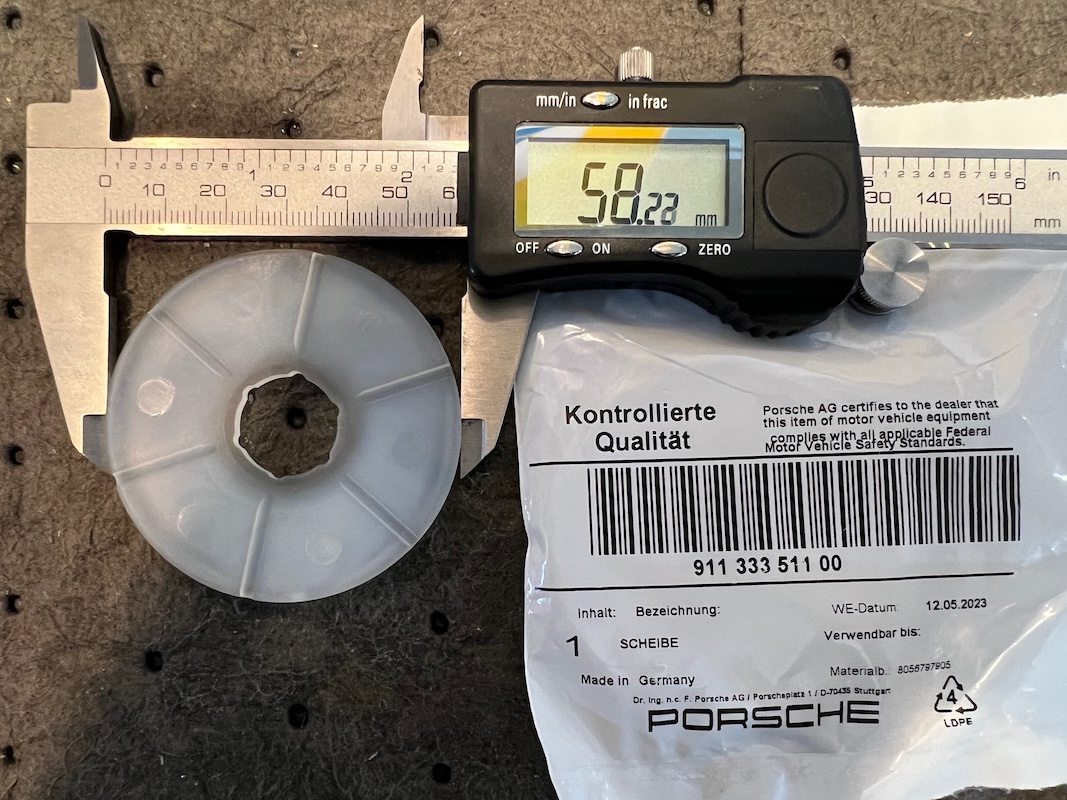 While the original part is NLA, there is a shipping part (as of 2024) that appears to be similar material and has the grooves that Jeff suggests act as a vent to keep the stopper from acting as a vacuum pump and sucking fluid past the shaft seal. It is 911-333-511-00. Slightly larger at 58mm. |
