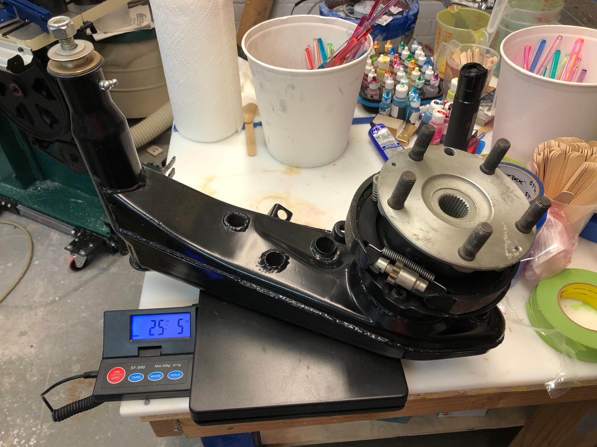 Point of reference: These are the trailing arms that Eric at PMB performance set up for me to use with my 930 transmission and a V8 car. Early 911 rear brakes and elephant Poly bronze bushing as well as strengthening of the trailing arm internally, you'll note there's 2 extra piece of pipe running through the trailing arm