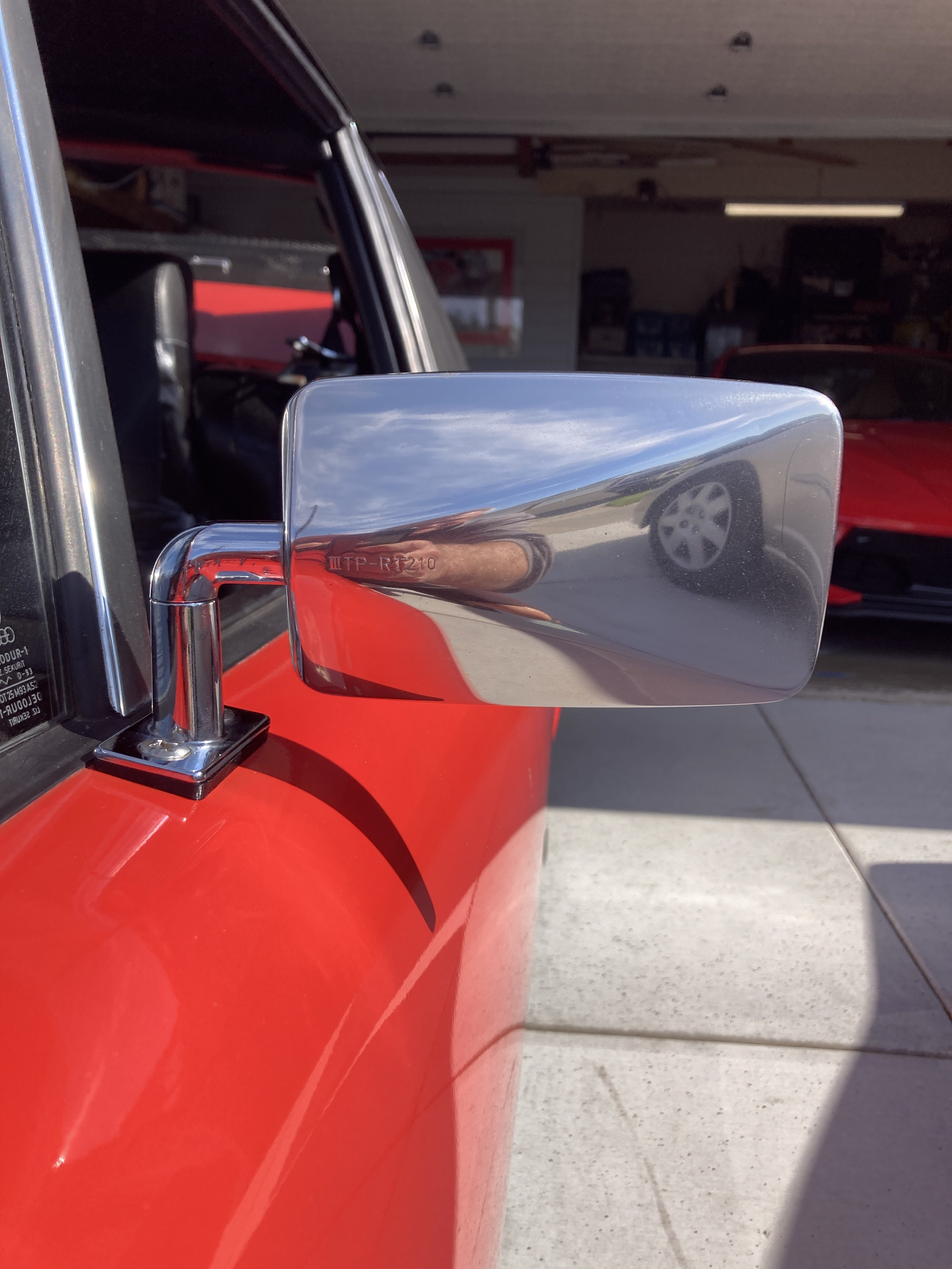 Have you noticed how your stock side mirrors do not sit horizontal? Here is a photo of my right side mirror, taken with the camera set horizontal and the mirror straight out from the door. Notice how the mirror center tilts downward to the outside.