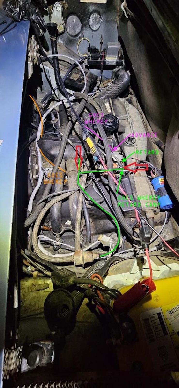 Beyond all the hooking up of vacuum lines, the change in TB could be because it fits and/or because the Vanagon TB’s had a larger TB plate compared to the 1.8L TB. I don’t know the years specifically but I’ll bet @clayperrine does. yes - often done mod. esp since the original 914 L Jet throttle bodies wore out and leaked air as well as wearing in a groove in the bore of the t/b where it rested at closed position prematurely - requiring t/b replacement anyway. ------- the double vacuum can set up on the distributor was always a curious thing to me being down here in aus. any AC VW i ever had experience with from the late 60s and early 70s only had a single can distributor- and it was a vac advance can. these were of course all carb VWs not EFI. either twin carb type 3 or single carb type 1. the vac advance can smoothed out the engine when you were at steady state cruise with partial load changes response smoothed out and increased fuel economy. i had never seen a double vac can until i got hold of my L jet 914. took me a long time to get my head around them and what they did. its really purely restricted to the US cars at that time and its an emissions solution. -------- i am still trying to get my head around L jets car and how it was set up by his fathers mechanic. i suspect what he did was set it up to run more or less as a 49 state car with the larger vanagon throttle body for better throttle responce. i think i can see how it was set up to work the retard vacuum can in a slightly unorthodox way but effectively the same as hooking up to the retard can to the retard port on tb. it looks to me like maybe it was connecting the retard can to the plenum and feeding off the same line as the decel valve. there would be no difference then between connecting to the lower port on the throttle body and connecting to the intake plenum. however normally that t is connecting the fuel pressure regulator and the decel valve t the intake plenum. what i cannot see from his photo is where the fuel pressure regulator vacuum line ended up going and where it connected to on intake plenum. it must have been connected somewhere to intake plenum somehow. the vac line is there i can see it connecting to the fpr. another curiousity is that the lower port on L-Jets T/B has been capped. this could have been connected to the retard can on the distributor. but instead the person doing the changes has chosen the T to the decel valve. ---and then you open a can of worms when you look up vanagon throttle bodies. it may have been 022133067C T/Bs could come with or without lower ports that connected to a retard can on a distributor. (IMG:style_emoticons/default/smile.gif) (IMG:style_emoticons/default/smile.gif) (IMG:style_emoticons/default/smile.gif) (IMG:style_emoticons/default/smile.gif) (IMG:style_emoticons/default/smile.gif) (IMG:style_emoticons/default/WTF.gif) anyway. assuming the upper port on L-Jets T/B was connected to the advance can on the distributor and assuming the FPR vac hose was connected to the intake plenum in some way i cannot see my conclusion is that his father's car had been EC-Beed so to speak back when the throttle body was replace. in a slightly unorthodox way in terms of where hoses went but nevertheless for all intents and purposes working as per an EC-B rather than the californian set up it originally would have been. |