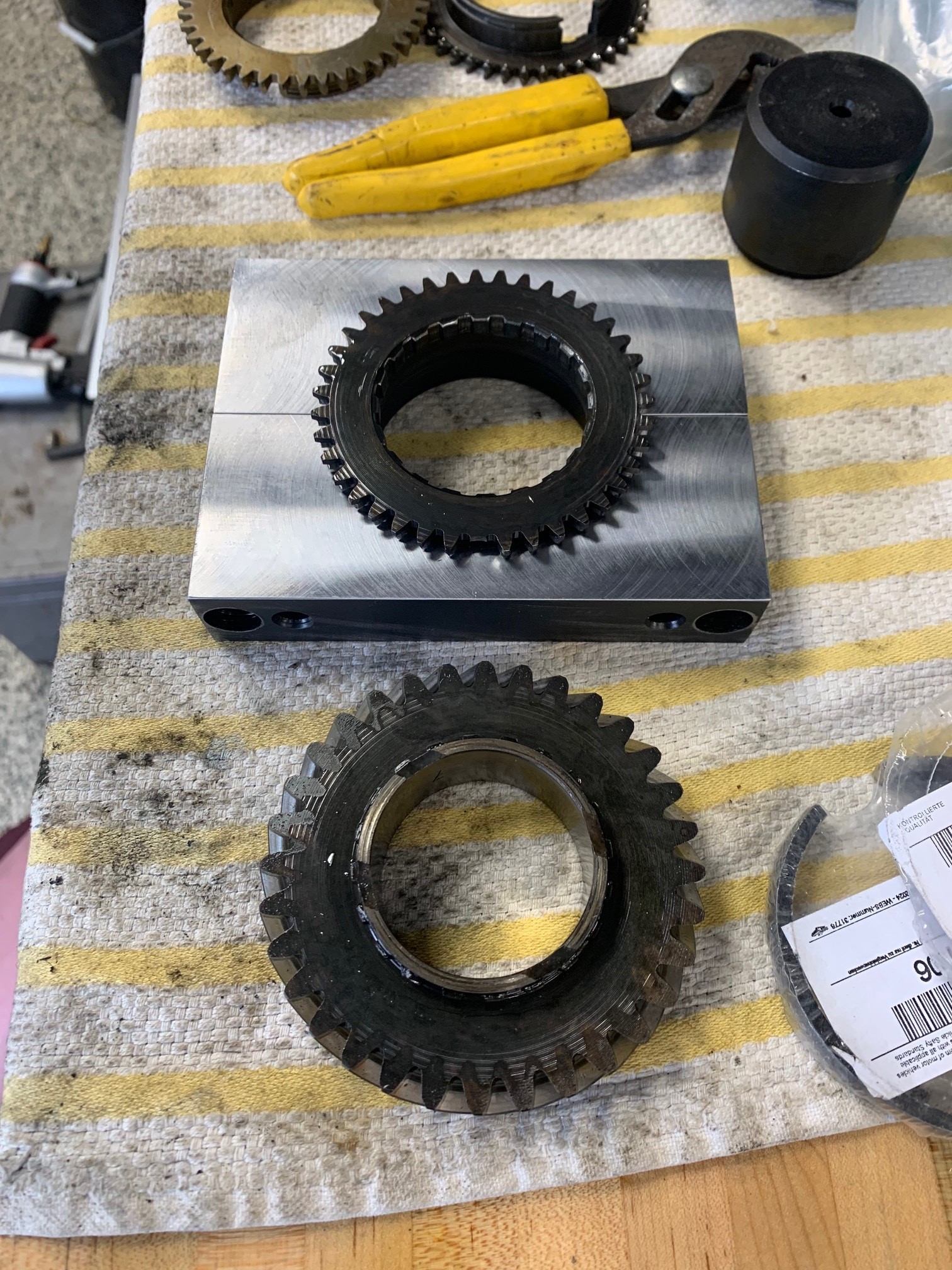 Transmission parts arrived here are some updates: P226 Tool needed to be re-tooled Needed to be faced a mil and the ring reduced .33mil Once the dimensions of the Tool were correct for a 901 box, things started to work with the now correct P226 ****Note the DogTeeth are missing a tooth - never did find it.... New 2nd gear Sync and Teeth! First Slider was coated with a wax/kosmaline stuff - hard to get off - Brake Cleaner (5 coats finely got it done |