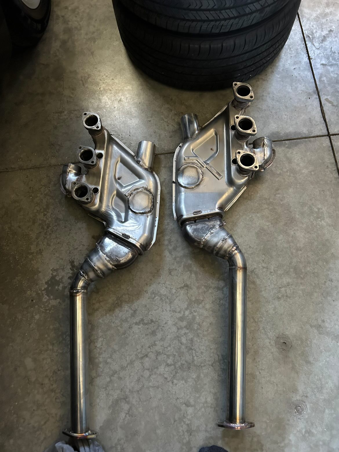 The other thing I was debating was Restoration Design is raising prices for metal March 4th. How important do you think their outer long strengthening panels are for a six project? I ended up buying the outer long reinforcements from Restoration Design about a month ago. Figured Canadian steel was going to be a lot more expensive and I wanted a stiff feel to the chassis. I also considered the inside reinforcement kit, but opted to not go with that for worry that it might upset the interior fitment of the carpet and rear backer pad. I sourced main bearings for the 10/10 crank that I had done at Ollies for the 2.7 flat six motor that is going in this project. I think they send grinds out somewhere else, but I was a little worried that it would be hard to find 2.7 main bearings that were oversized to fit the grind. As luck would have it, my local friend is restoring a 76 911 Targa and had been sent the wrong bearings and they were the right oversized bearings for my crank. The same friend had a set of Gillette 993 heat exchangers and I reached out to Ben about trying them for the 914/6 solution. Ben had built some sets based on the Bischoff version of the 993 heat exchangers, but not the Gillette. I sent Ben a message and asked if he wanted to try them and he agreed. A few weeks later Ben completed the job and sent me the finished Heat Exchangers. The 993 design is compact, stainless steel, and quite good when it comes to performance. Ben said the Gillette version requires a little different technique on the flange portion as compared to the Bischoff version. Ben has to move some things around on the heat boxes to accommodate the 914/6 design as well as attach the leads to the muffler. Now to determine if I polish or maybe ceramic coat grey or even white to be different. What do you think? |