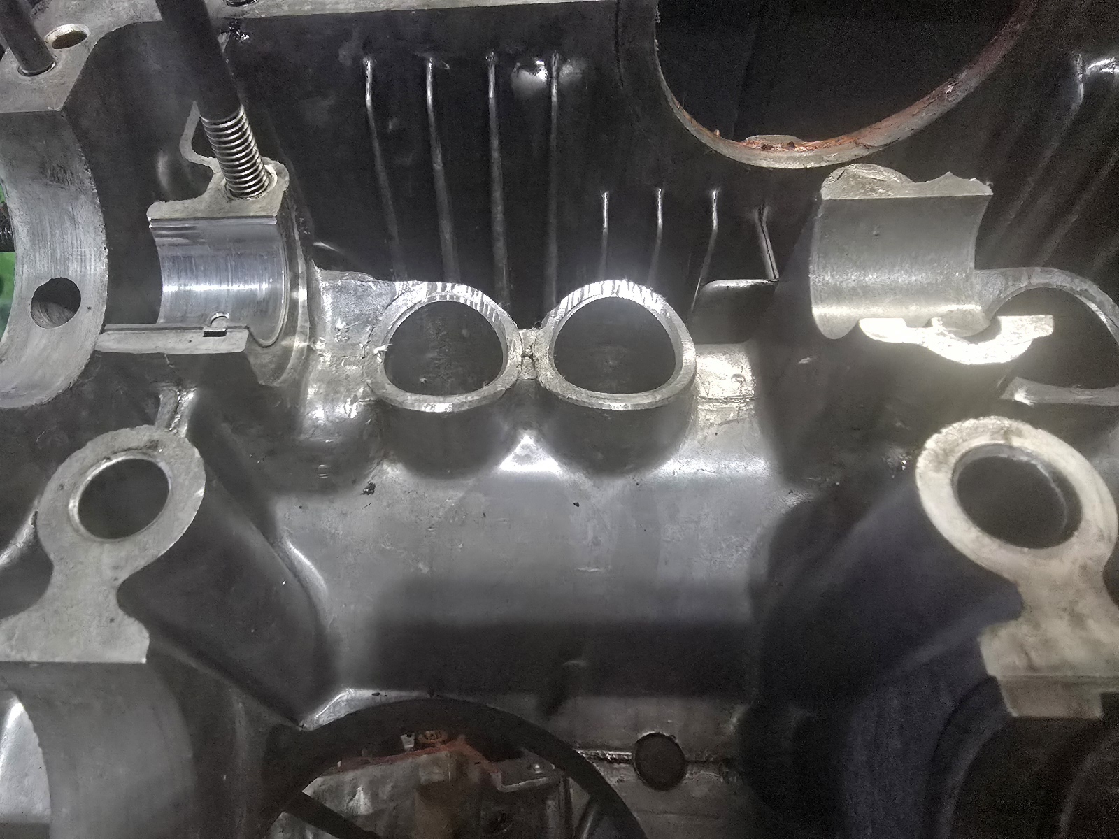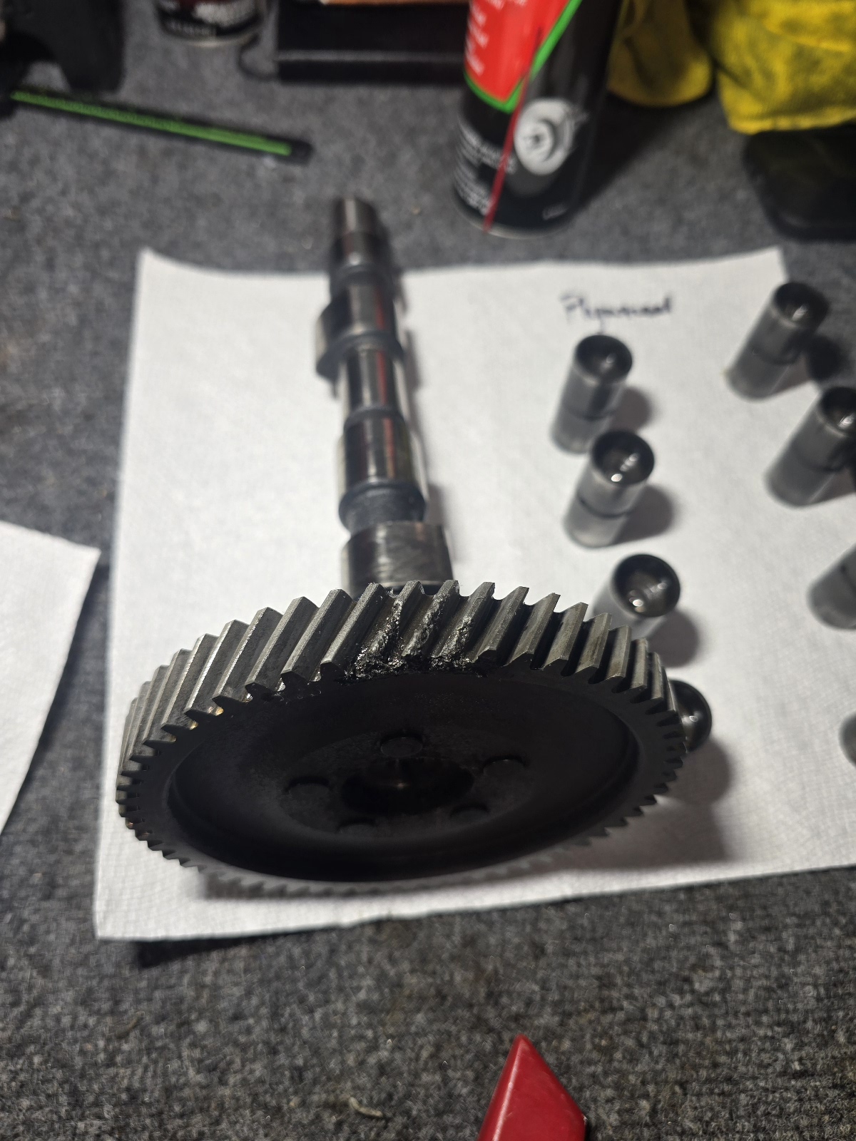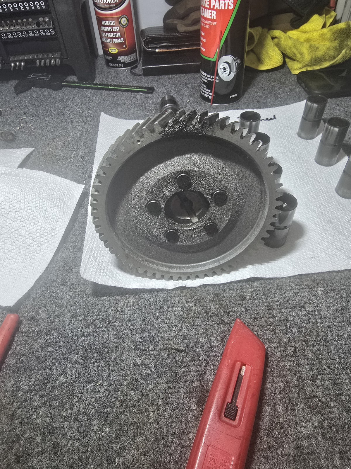 Got back home tonight a bit earlier than expected so of course couldn't wait to get the case apart. I wanted to check the bearings and make sure standard size would work so I could get everything ordered. As i said before I had my doubts about the story I'd been told by the PO. Allegedly the engine was rebuilt and had 200 miles on it. The cam gear suffered some kind of horrible damage. For the life of me I'm not sure how that even happens. The cam showed a good amount of wear. And there was a lot of scoring on the main journals, the bearings and even a decent amount of scoring on the bearing seats of the case. A lot of wear on the lifters, alot of wear on the lifter channels of the case. I'm going to get the crankshaft inspected. I think it should be salvageable. If not it might be time to think about upgrading to a 2.0 crank and get the case bored out while I'm having the other casework done. Unfortunately that means the motor rebuild is on hold for a few weeks until that's done. |