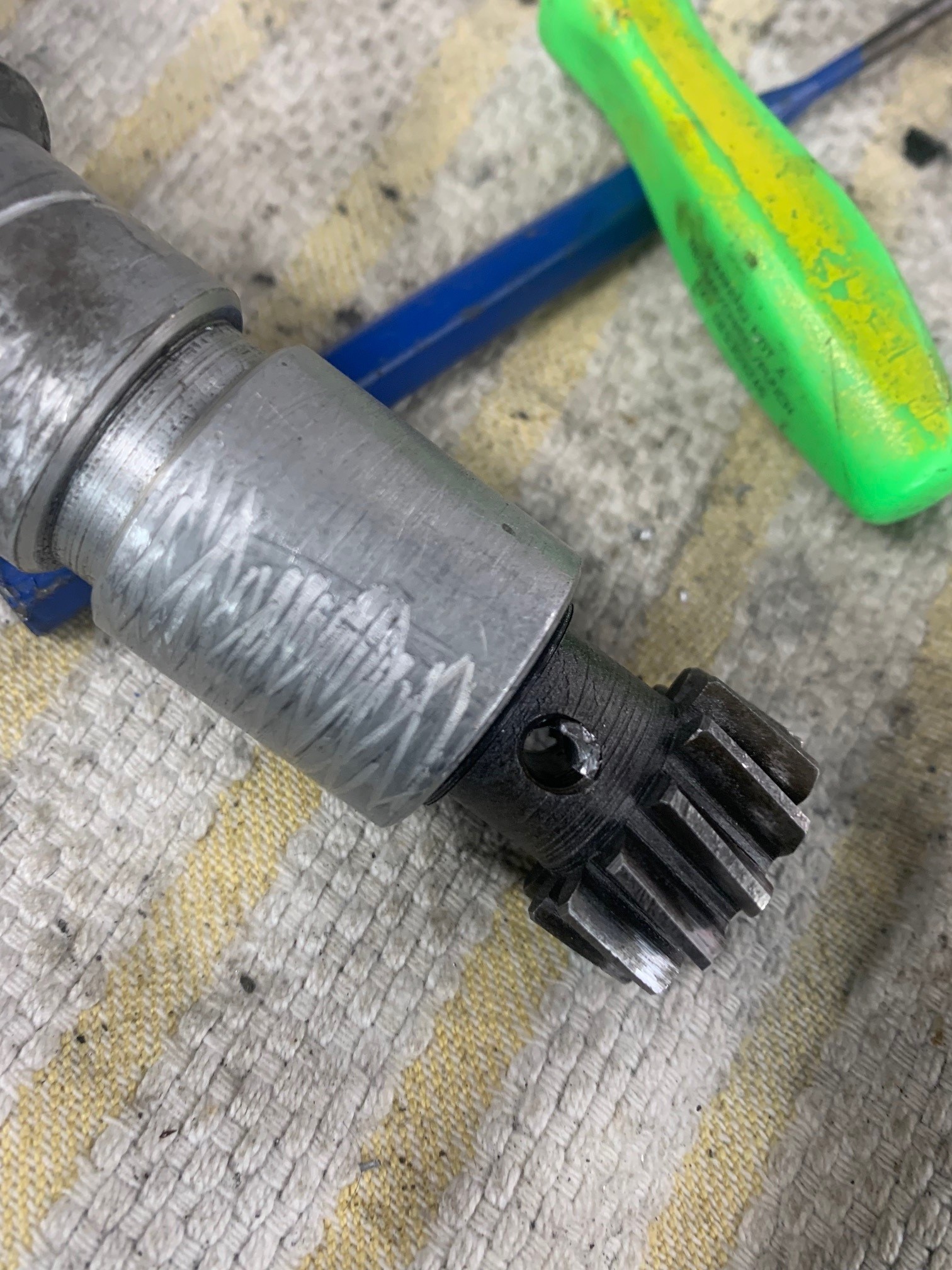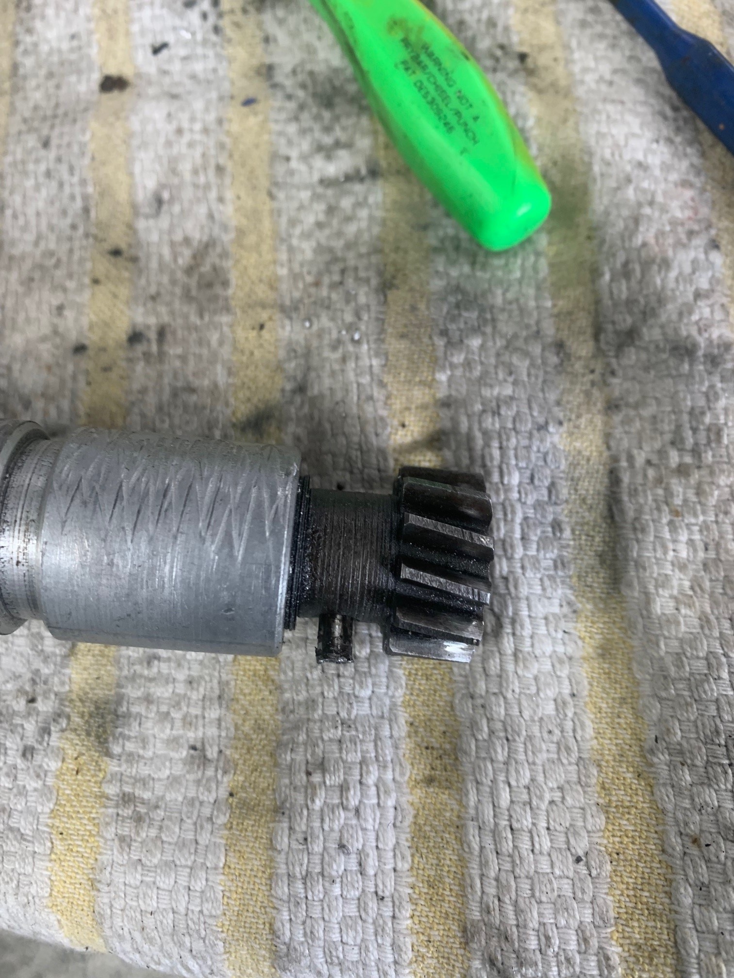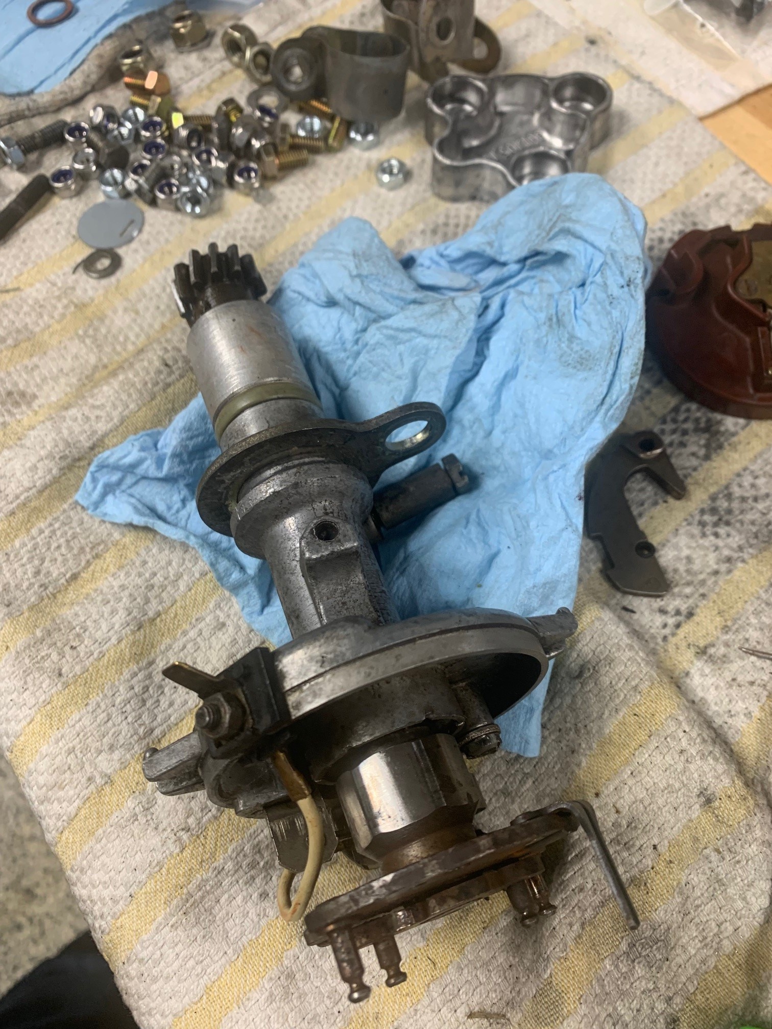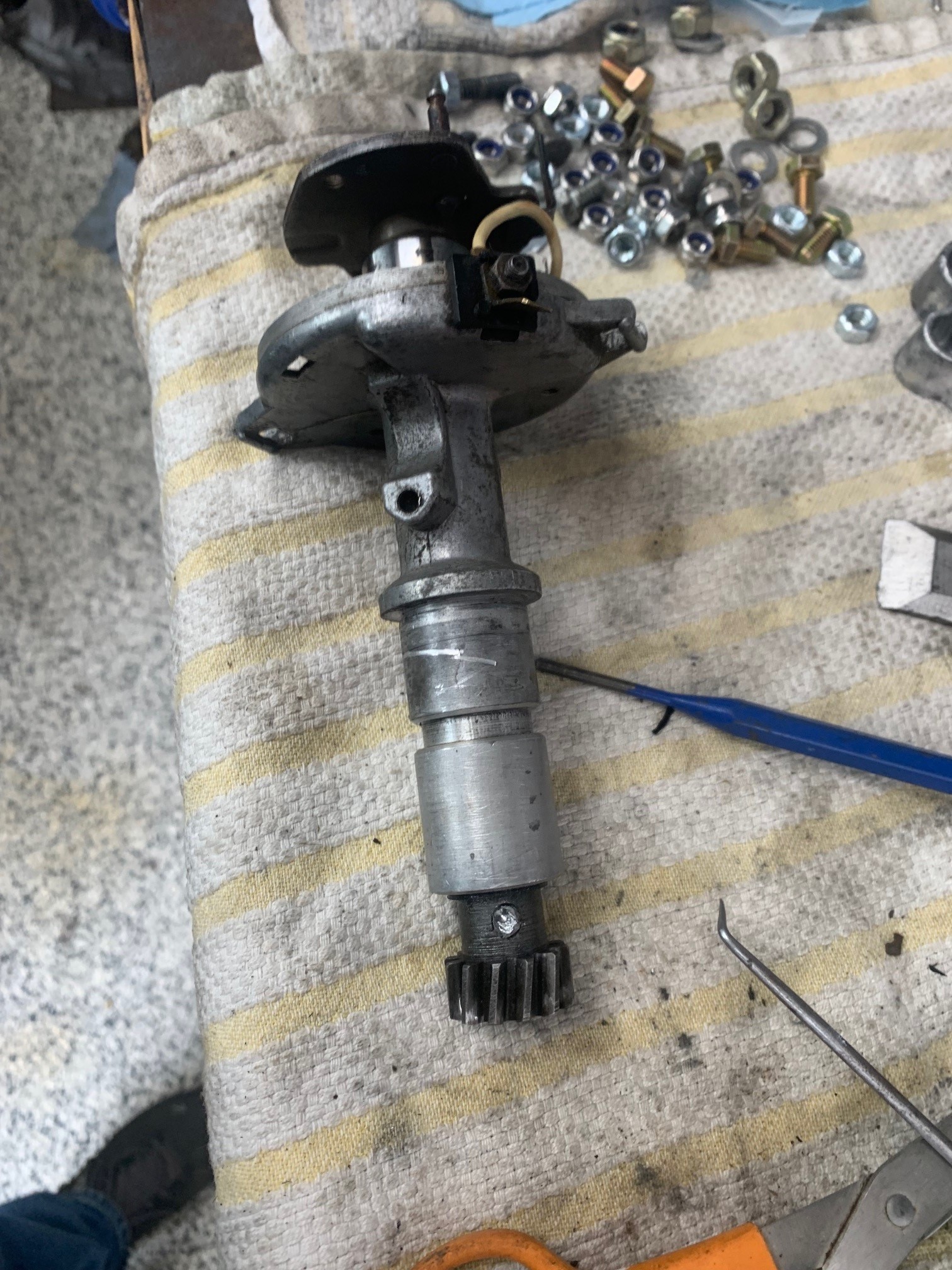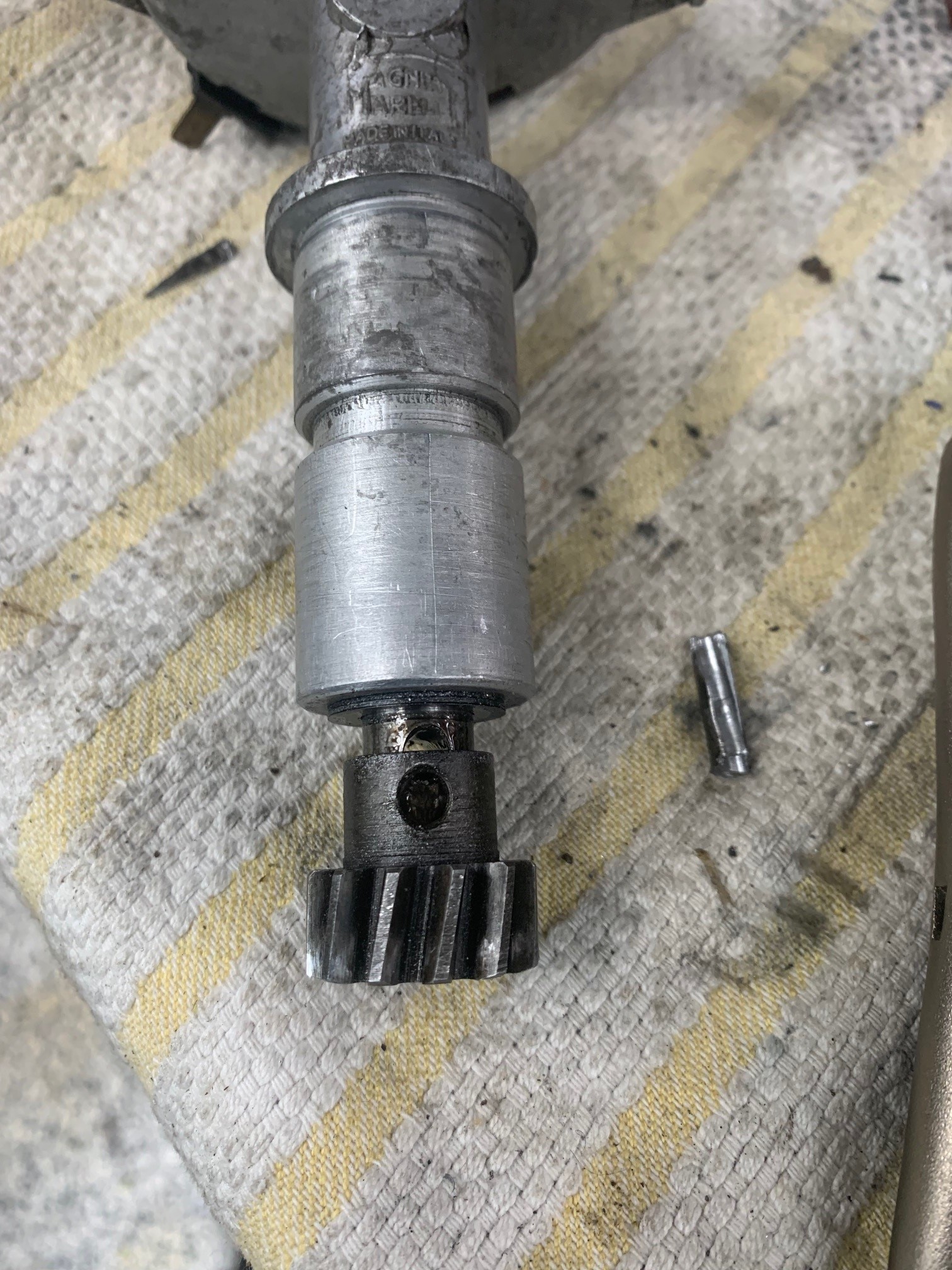 I really like this setup, simple, no noticeable wear, however, old grease has made the shaft a bit stiff and the advance operation no doubt is effected by old grease that is now glue........interesting metaphor (IMG:style_emoticons/default/dry.gif) I took apart all of the screws which were muscle-F****D at some time in the past, also ordered a rebuild kit from PartsKlassic. The shaft was never removed from the assembly and I had to drill out the original drift, it was distorted most likely with a factory press on either side. My question is the re-distortion of the pin that is with the rebuild kit, has anyone else done this job? Is there a tool I could use in my press to properly distort the pin? Looking for any guidance, thank you, There was a minor deformation on the case at the entry to the Distro into the case. Just a small burr that made a nasty score on the shaft - I gently removed this marring with steel wool. I could not, after removing the head of the drift on one side, get it to come out with a firm drift/punch tool - I did not want to hit it too hard, so I started the long and careful drilling process............. 3 HOURS LATER |
