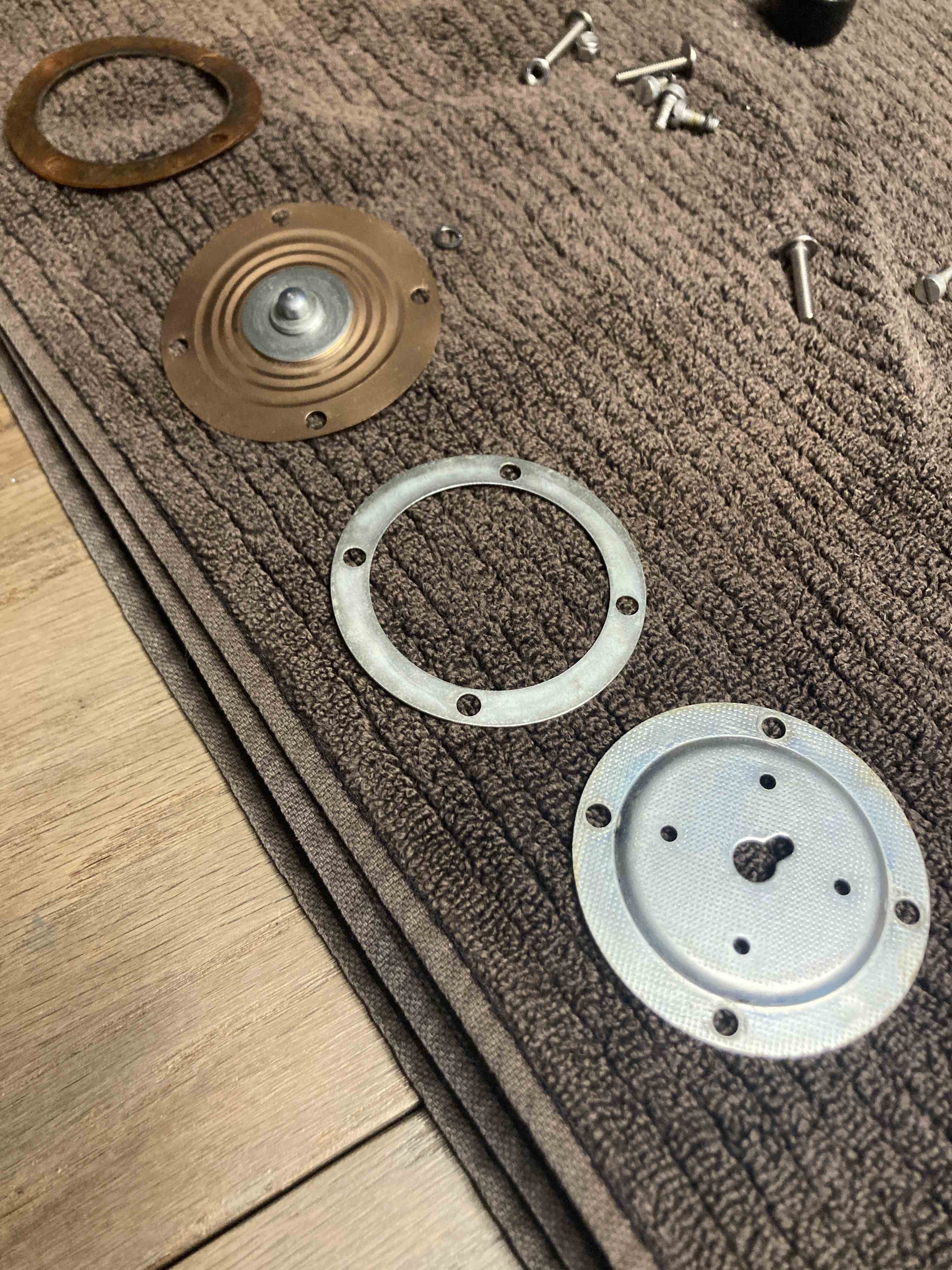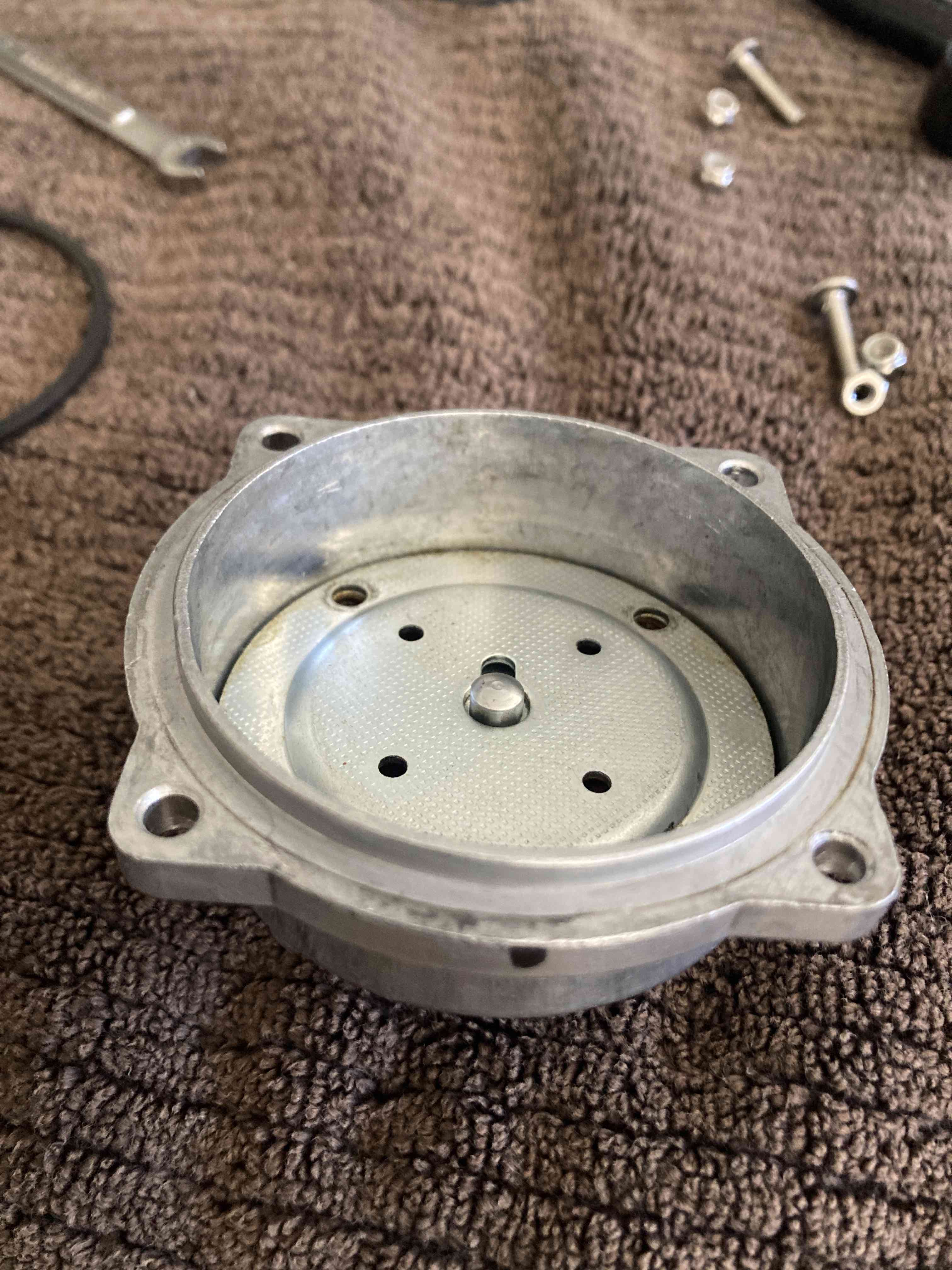 I am in the middle of rebuilding my MPS and have a couple of comments and questions . First when I opened up the unit I found the most difficult job was removing the rivets holding the two halves together. When I removed the retainer plate to take out the old diaphragm it was in two pieces . I needed to take two measurements since I was replacing the stop screw , I needed to measure the the stop screw protrusion into the housing . The instruction sheet sent to me by a member had the measurements he must have made when rebuilding his MPS . His stop screw protrusion was 1.97mm and mine only measured 1.72mm. His inner/outer screw assembly depth in the old diaphragm measured 6.51mm . Here's one of my questions ? when I measured mine I got two measurements depth to inner/outer screw assembly was 4.03 and depth to the washer outside the inner/outer screw assembly was 5.46mm. Again there is a difference and since mine was never accessed before (epoxy over screw was not disturbed) is the difference in measurements ok and which measurement should I use I will try to attach a photo or two to help with my question. this one . I have not touched either of these measurements yet and awaiting any help/comments. I think it's this one to the washer on diaphragm . |