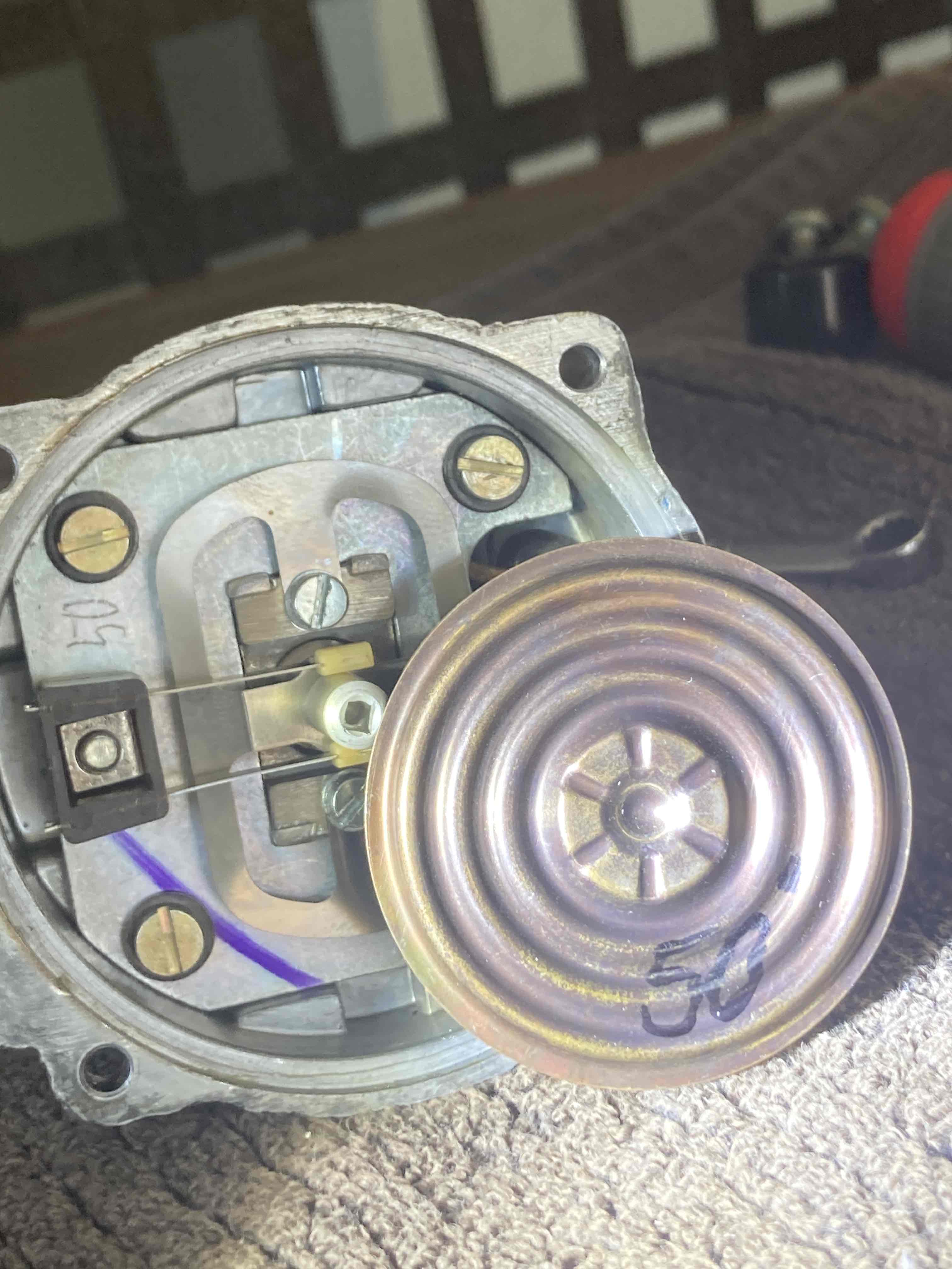 I am in the middle of rebuilding my MPS and have a couple of comments and questions . First when I opened up the unit I found the most difficult job was removing the rivets holding the two halves together. When I removed the retainer plate to take out the old diaphragm it was in two pieces . I needed to take two measurements since I was replacing the stop screw , I needed to measure the the stop screw protrusion into the housing . The instruction sheet sent to me by a member had the measurements he must have made when rebuilding his MPS . His stop screw protrusion was 1.97mm and mine only measured 1.72mm. His inner/outer screw assembly depth in the old diaphragm measured 6.51mm . Here's one of my questions ? when I measured mine I got two measurements depth to inner/outer screw assembly was 4.03 and depth to the washer outside the inner/outer screw assembly was 5.46mm. Again there is a difference and since mine was never accessed before (epoxy over screw was not disturbed) is the difference in measurements ok and which measurement should I use I will try to attach a photo or two to help with my question. this one . I have not touched either of these measurements yet and awaiting any help/comments. I think it's this one to the washer on diaphragm . |