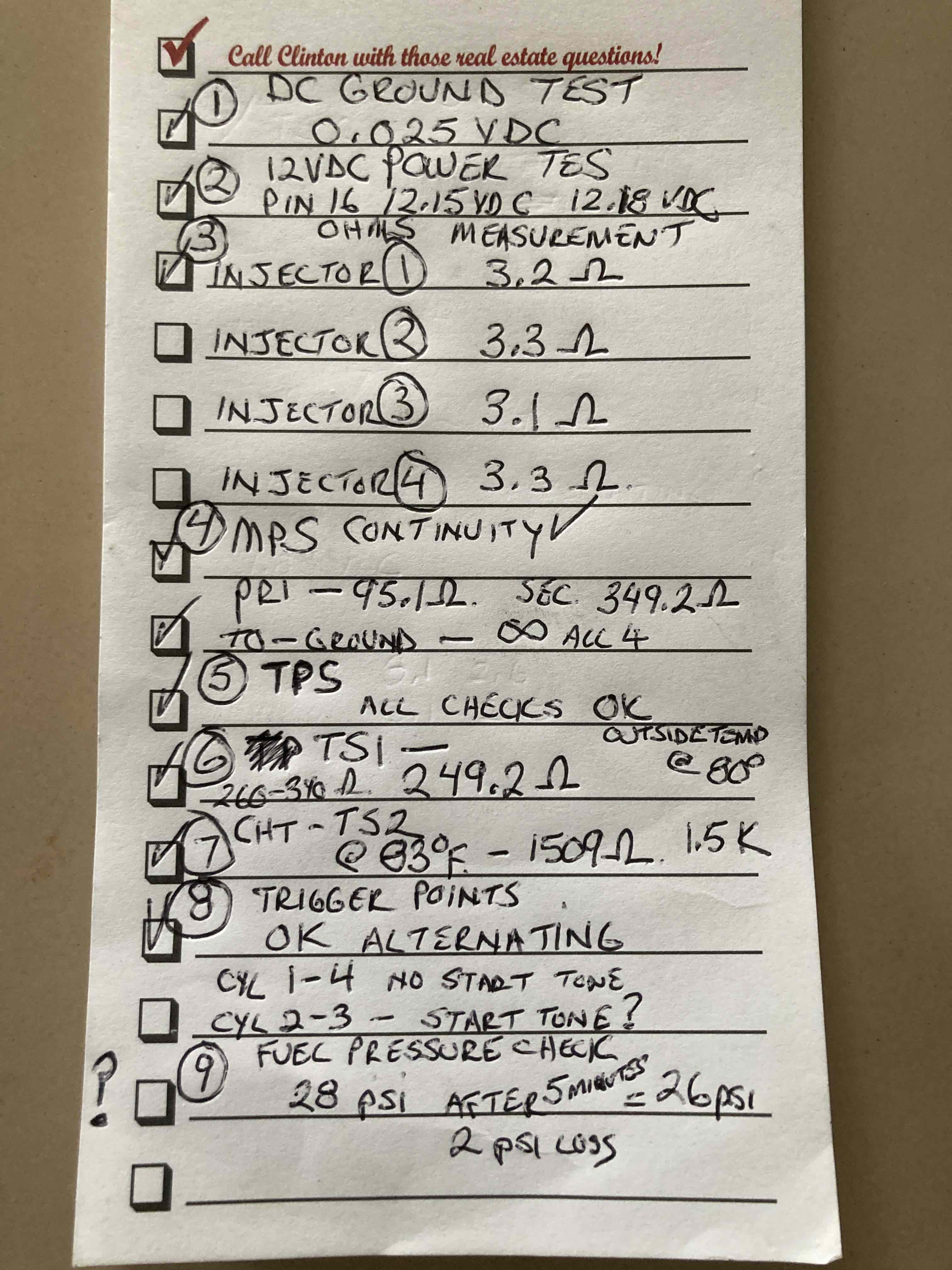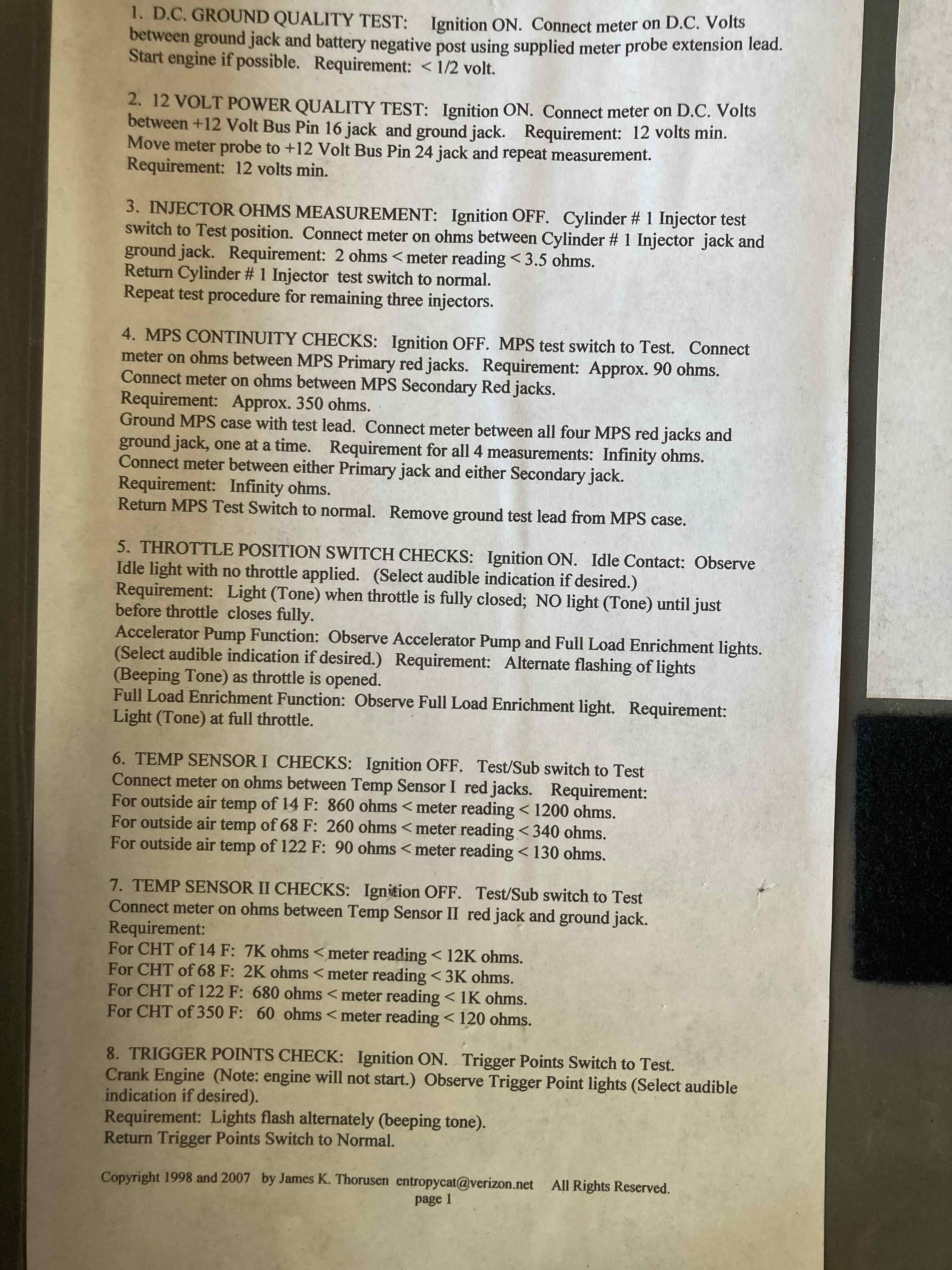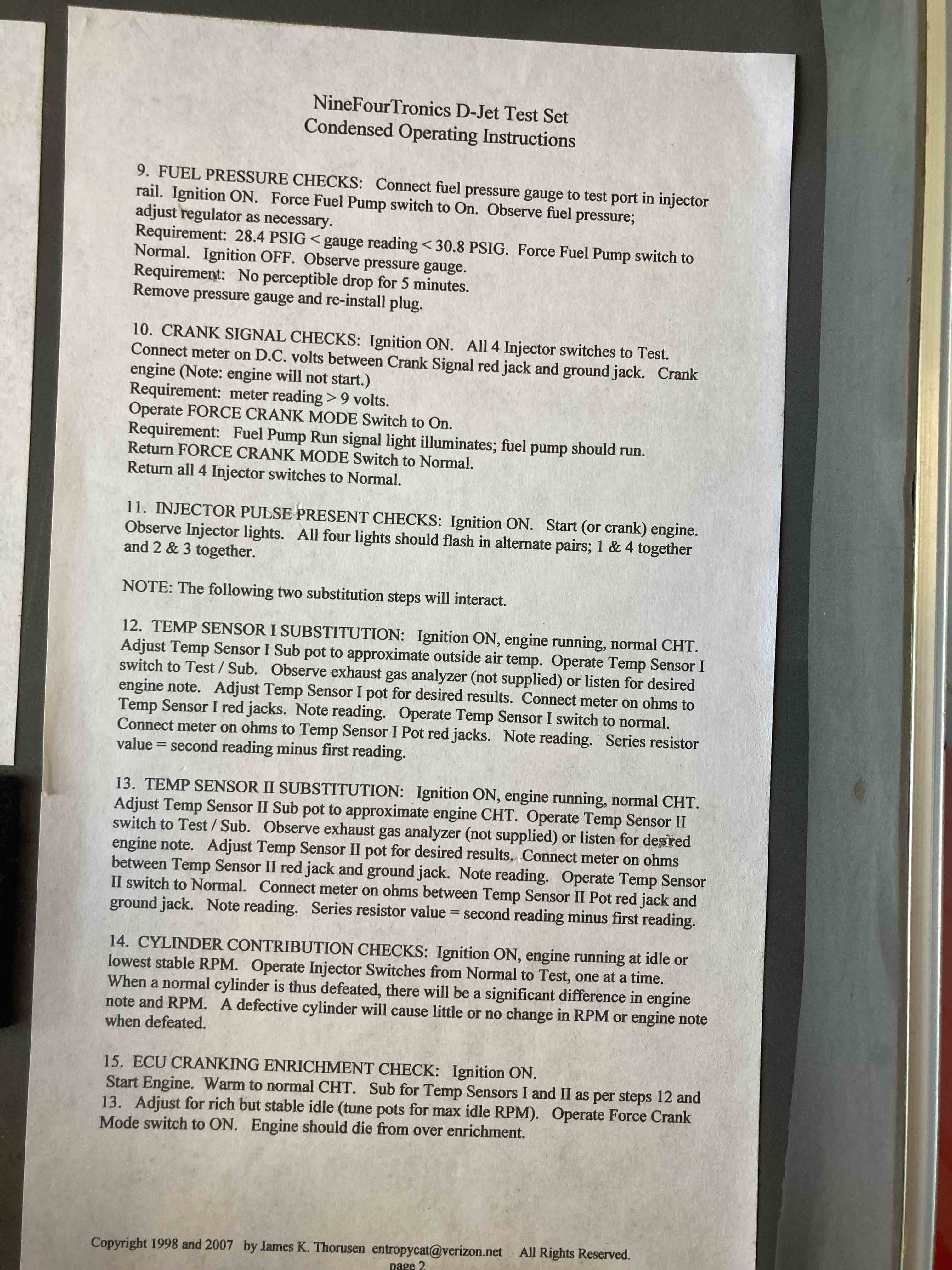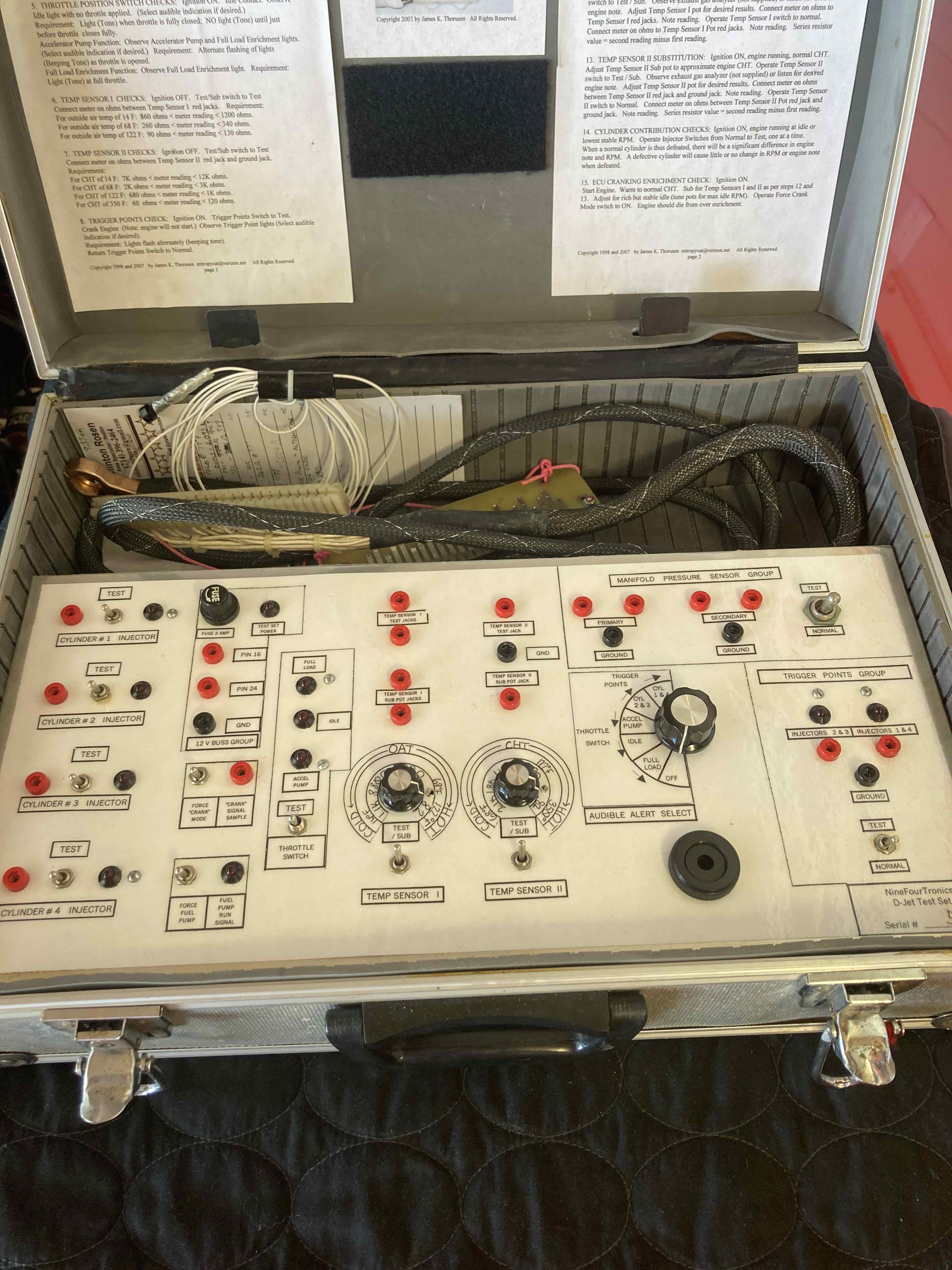 Well I purchased this test device for D-Jet from a member here . Although I have tested with my DVM these connections /values it really made it easier to take the readings . I noticed when I checked my fuel pressure after 5 minutes I had a loss of 2 psi , not sure if this indicates a leak somewhere but I do still have a gassy smell inside my car . I have replaced the old plastic lines with SS ones and all fuel hose has been replaced with Cohline braided hose from the bird . The fuel tank was also removed and checked but I did not do a pressure test on it , the gasket inside the fuel cap was also replaced .( this is a separate issue and doubt it is the reason for my engine cutting out at 212F) . I also figured out why my Dakota digital was reading so low ( it was in Celsius mode ) so when I said the motor quits running at 100 that really is 212F . I had to call their customer service and have them send out a new plug as one of the sensor leads has come out of the factory plug .I have videos of motor start up and bad running but I don't think I will use YouTube to post as this makes all videos public . My coil seemed hot but I figured this was probably due to leaving my ignition on too long during voltage checks .I currently have the decel valve disconnected and bypassed , vacuum line disconnected from distributor . I can send a email or text the video to @Superhawk996 or @emerygt350 if you would like. My test results |