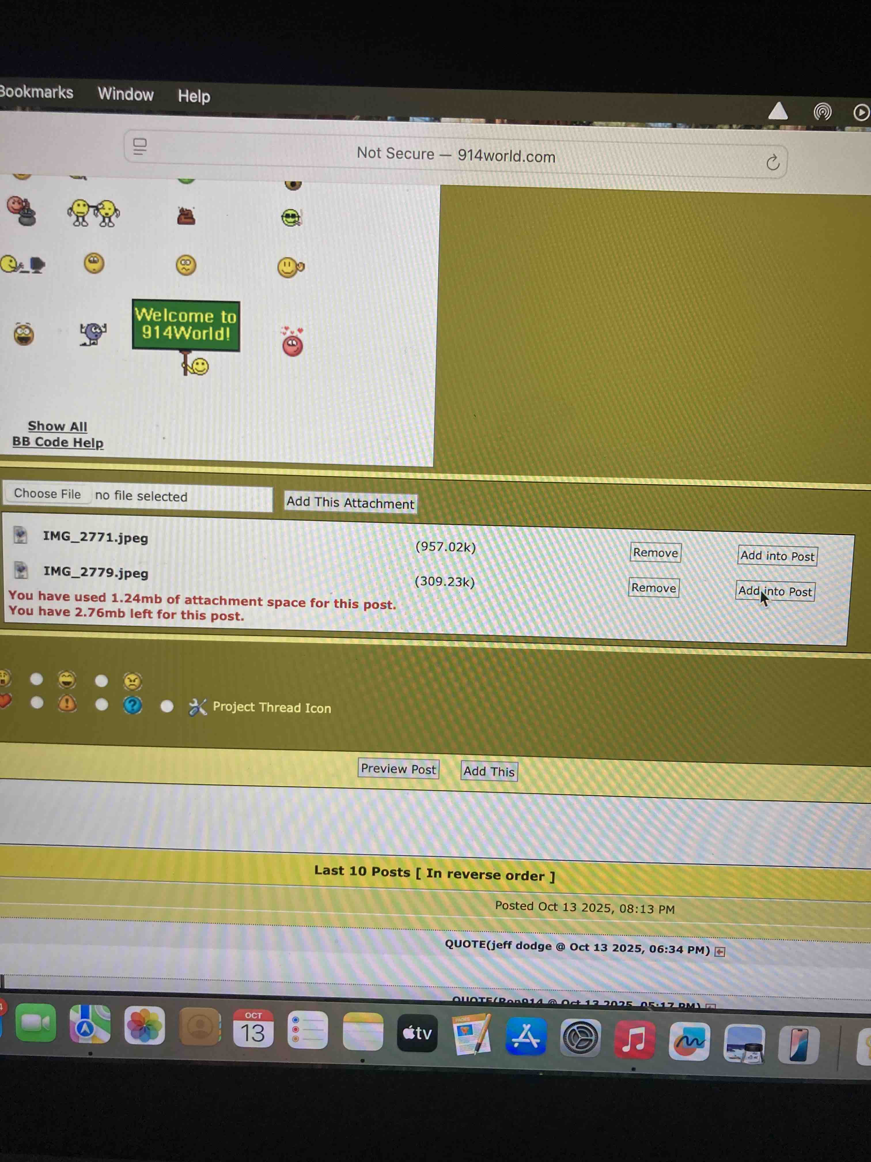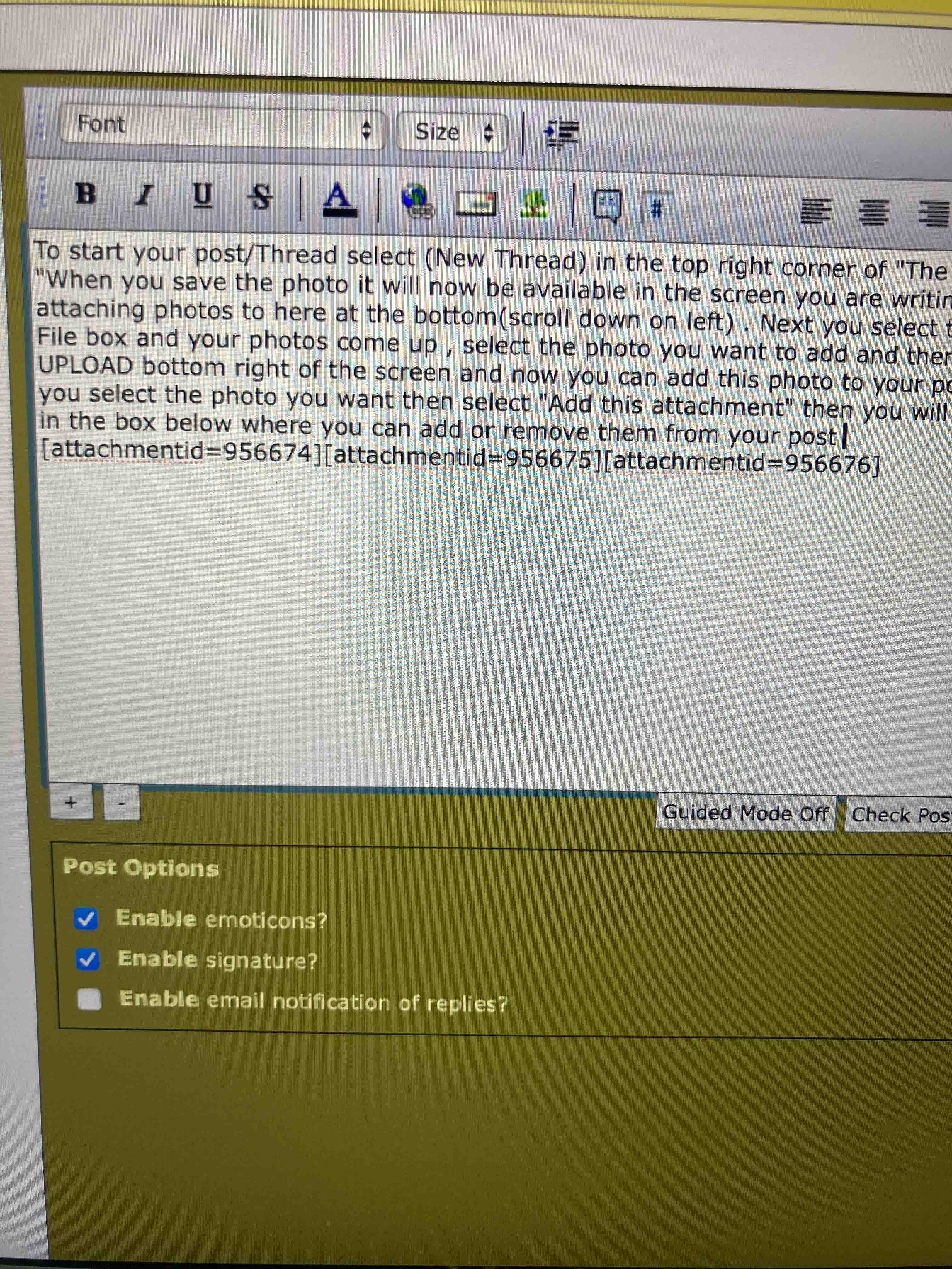 To start your post/Thread select (New Thread) in the top right corner of "The Garage " . This will take you to the screen where you write your new Post."When you save the photo it will now be available in the screen you are writing and attaching photos to here , look at the bottom(scroll down on left) and you will see the file attachment box.. Next you select the Choose File box and your photos you saved will come up , select the photo you want to add and then select UPLOAD bottom right of the screen and now you can add this photo to your post . After you select the photo you want then select "Add this attachment" then you will see photos in the box below where you can Add into Post or Remove from your post .Last photo is with attachments added to your post . I hope this helps you if not just reply and I will try to clear up any misunderstandings .